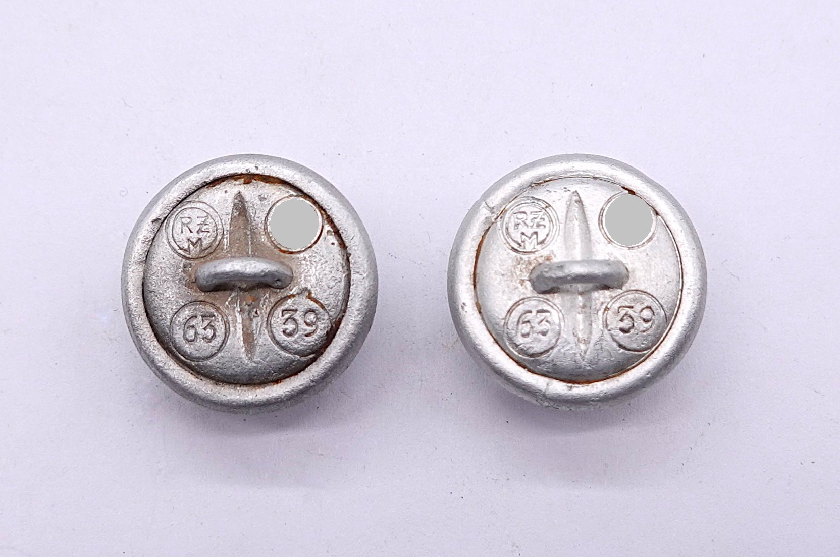 2 x SS Knopf. RZM und SS gestempelt. Zusätzlich noch mit 63 und 39. Aluminium. Durchmesser 19 mm. Gehe von einen gut erhaltenen Bodenfund aus.