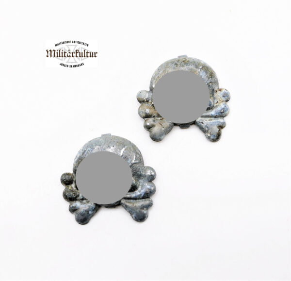 2 Totenköpfe. Auflagen für den Kragenspiegel der Panzerbesatzungen. Zink mit vergangener Versilberung. Bodenfund. Als Belegstück oder zum Aufarbeiten. Ein Splinte fehlt.