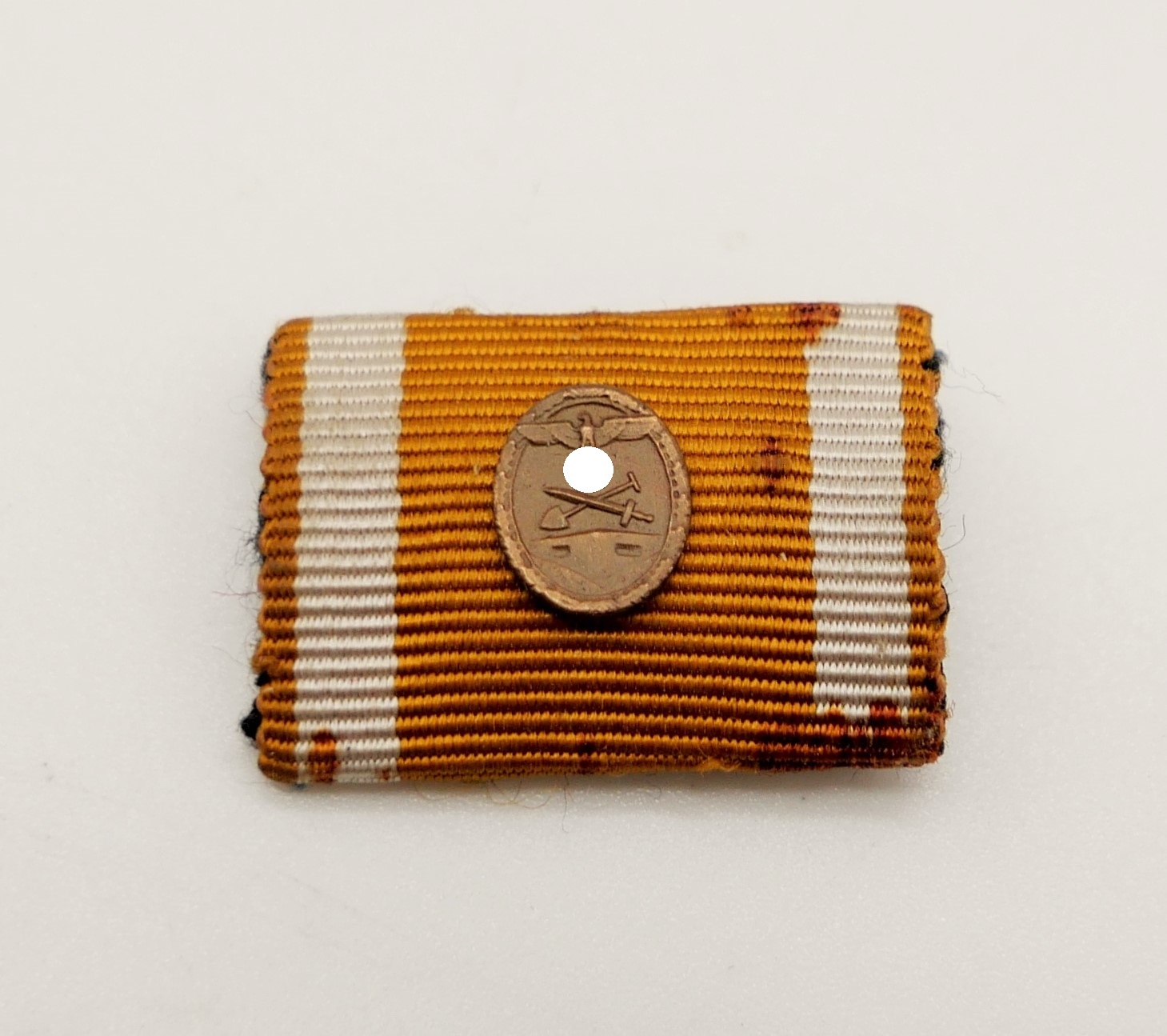Feldspange mit dem Band zum Schutzwall Ehrenzeichen mit der seltenen 9 mm Miniatur Auflage. Im gebrauchten, getragenen Zustand. Band teilweise etwas fleckig.