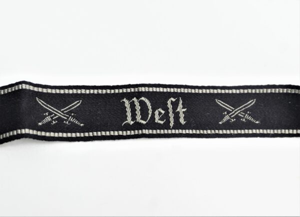 Ärmelband NS Reichskriegerbund – Soldatenbund – Kyffhäuser – West. Masse 39,7 cm x 3 cm. Ungetragener Zustand. Nur die Enden sind umgenäht.