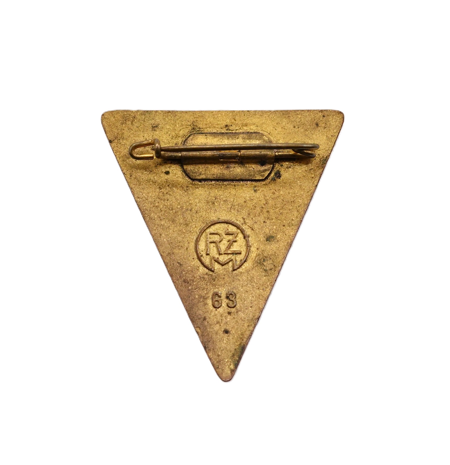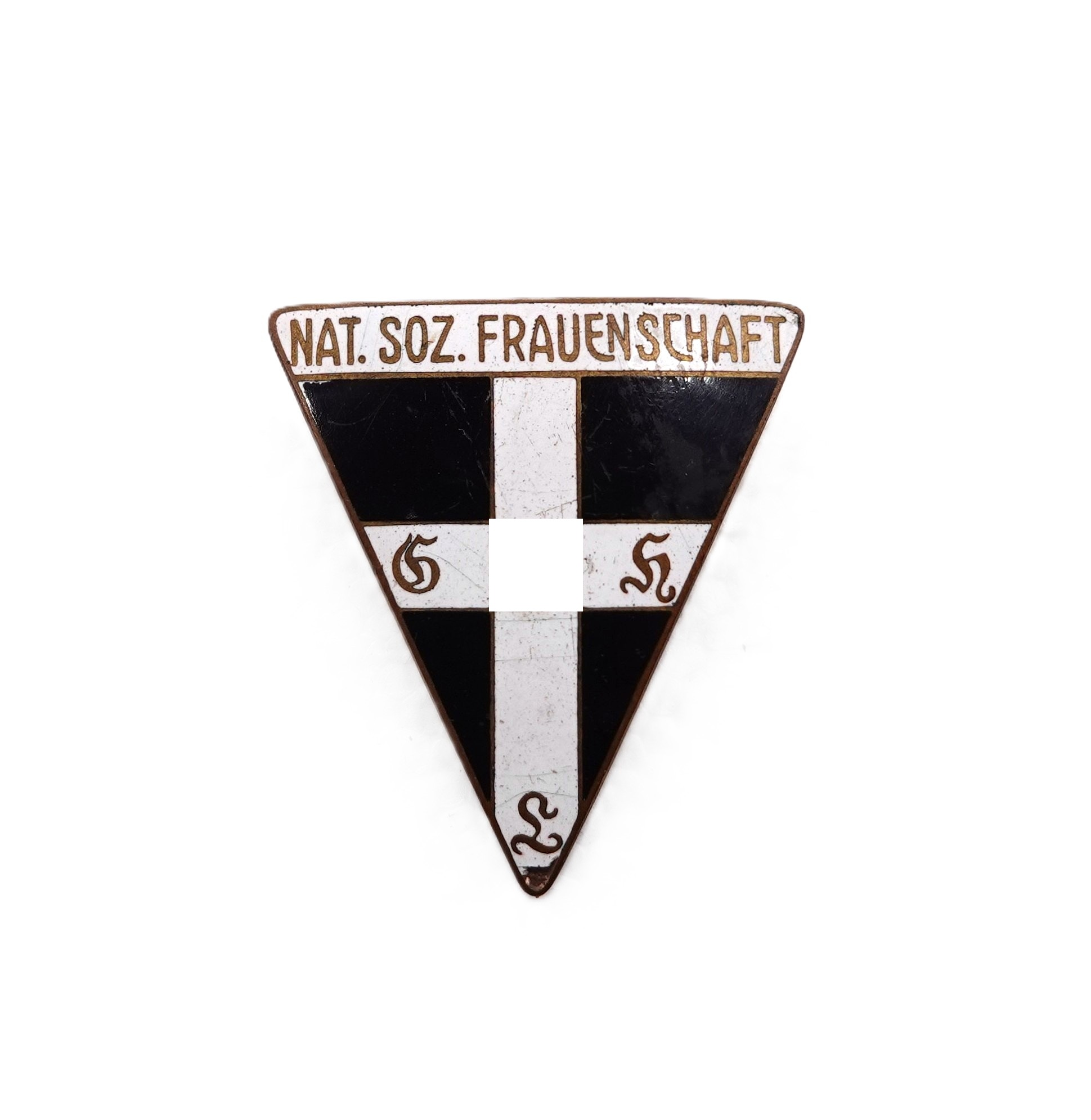 44 mm Abzeichen – Nat. Soz. Frauenschaft. Rückseitig RZM und 63. In der unteren Ecke ein kleiner Chip. Getragener Zustand.