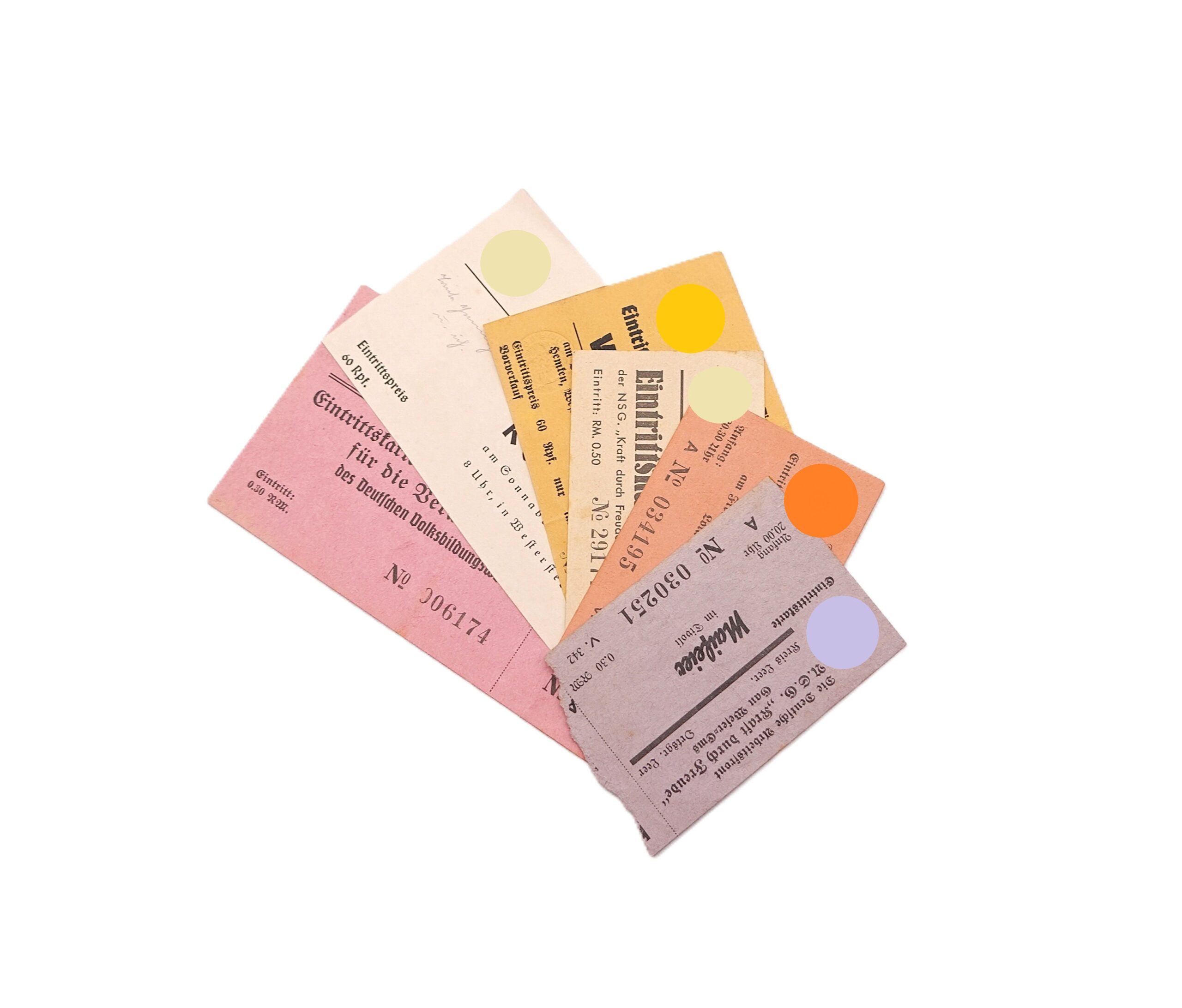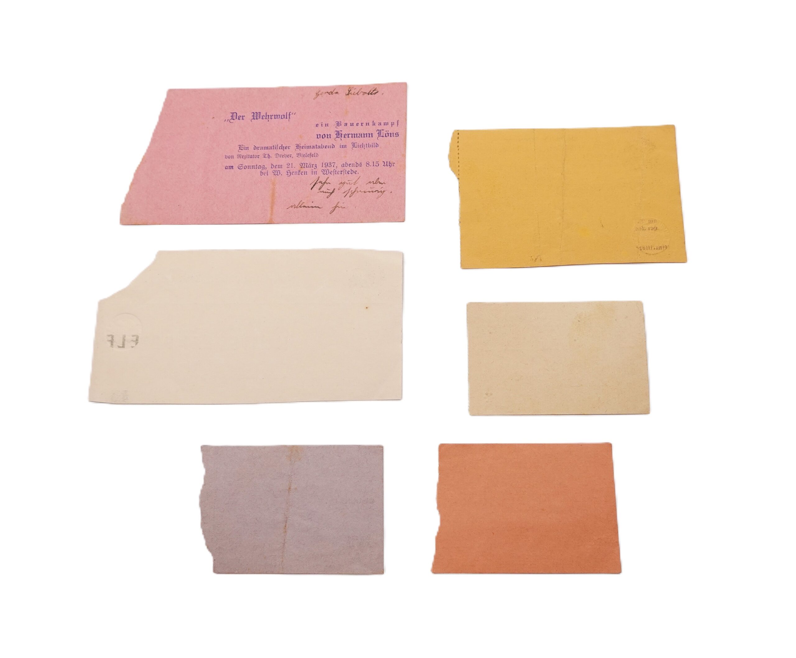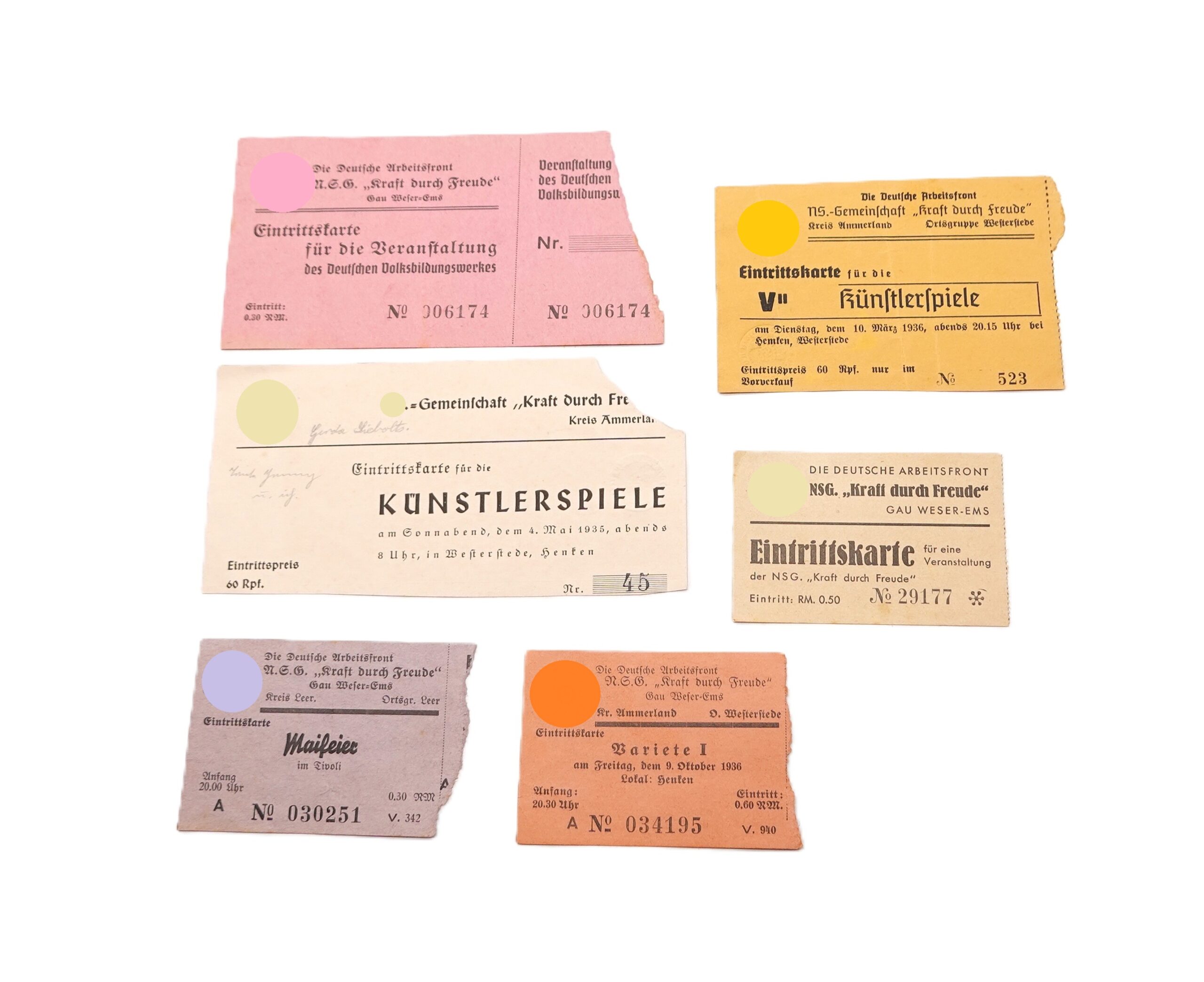 6 x Eintrittskarte – DAF – NSG – KDF (Kraft durch Freude) – Gau Weser Ems – Variete – Maifeier – Künstlerspiele. Mit den alterstypischen Gebrauchsspuren.