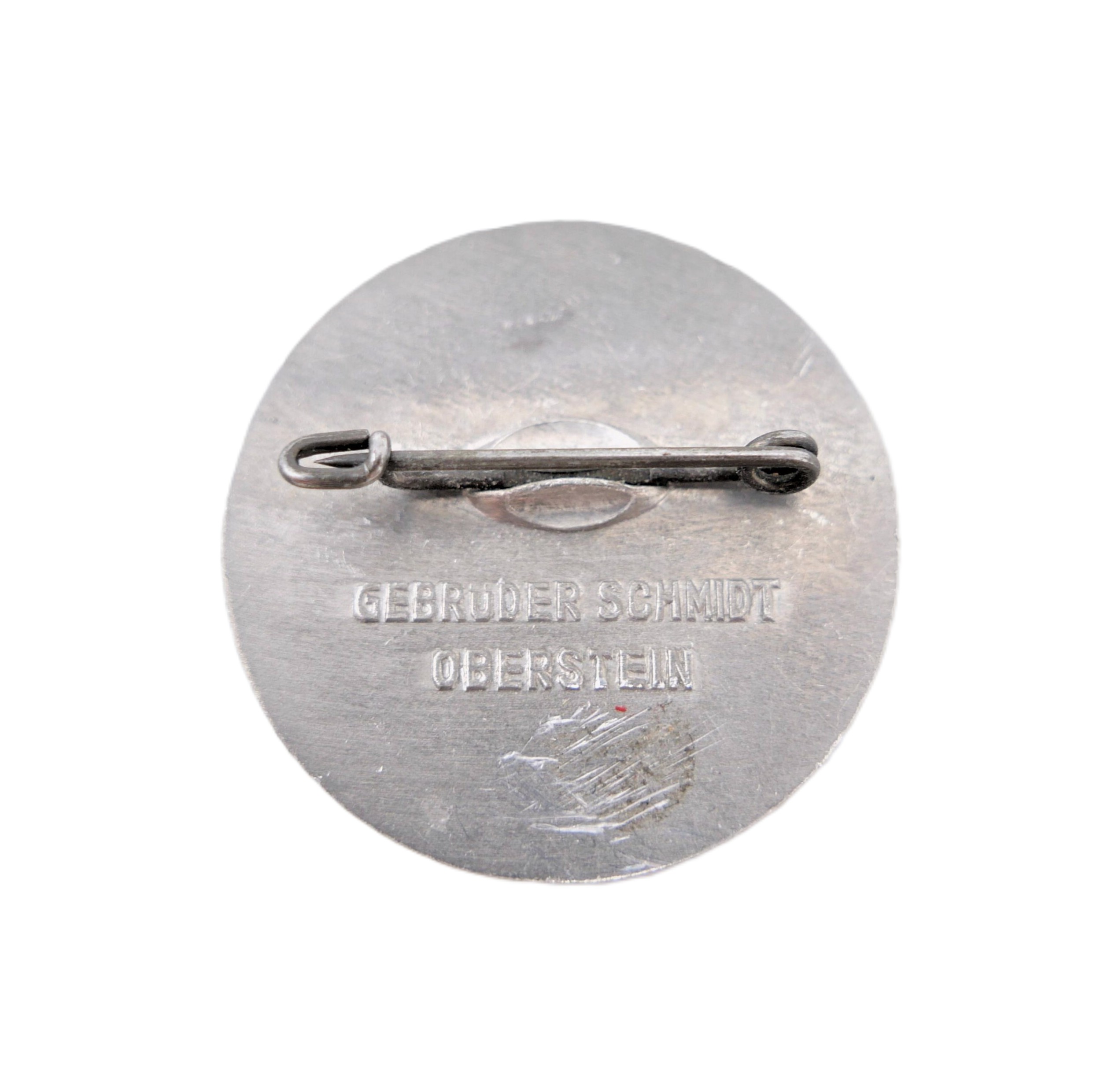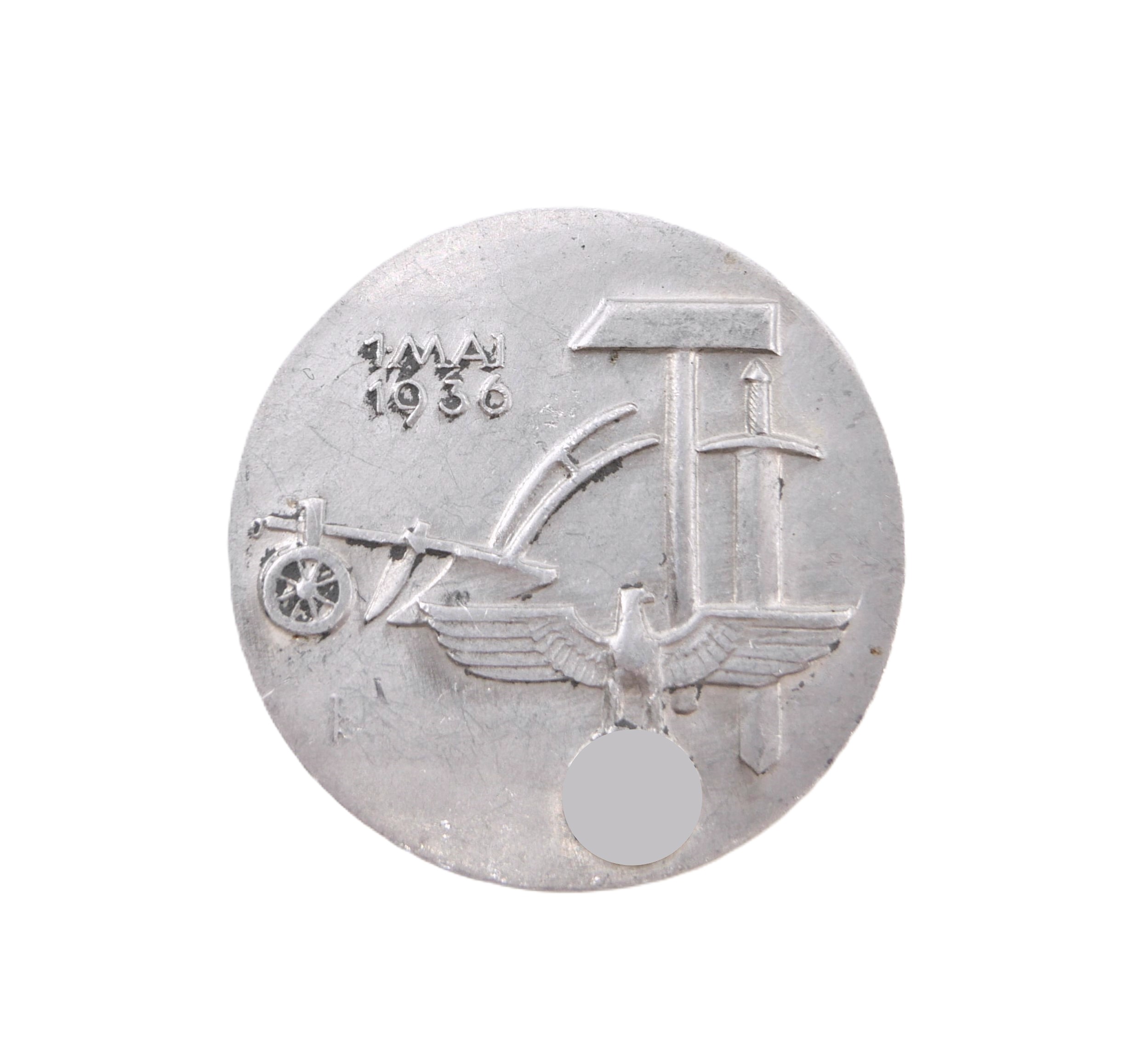 Abzeichen 1. Mai 1936. Hersteller GEBRÜDER SCHMIDT, OBERSTEIN. Getragener Zustand. Im unteren Bereich der Rückseite etwas zerkratzt.