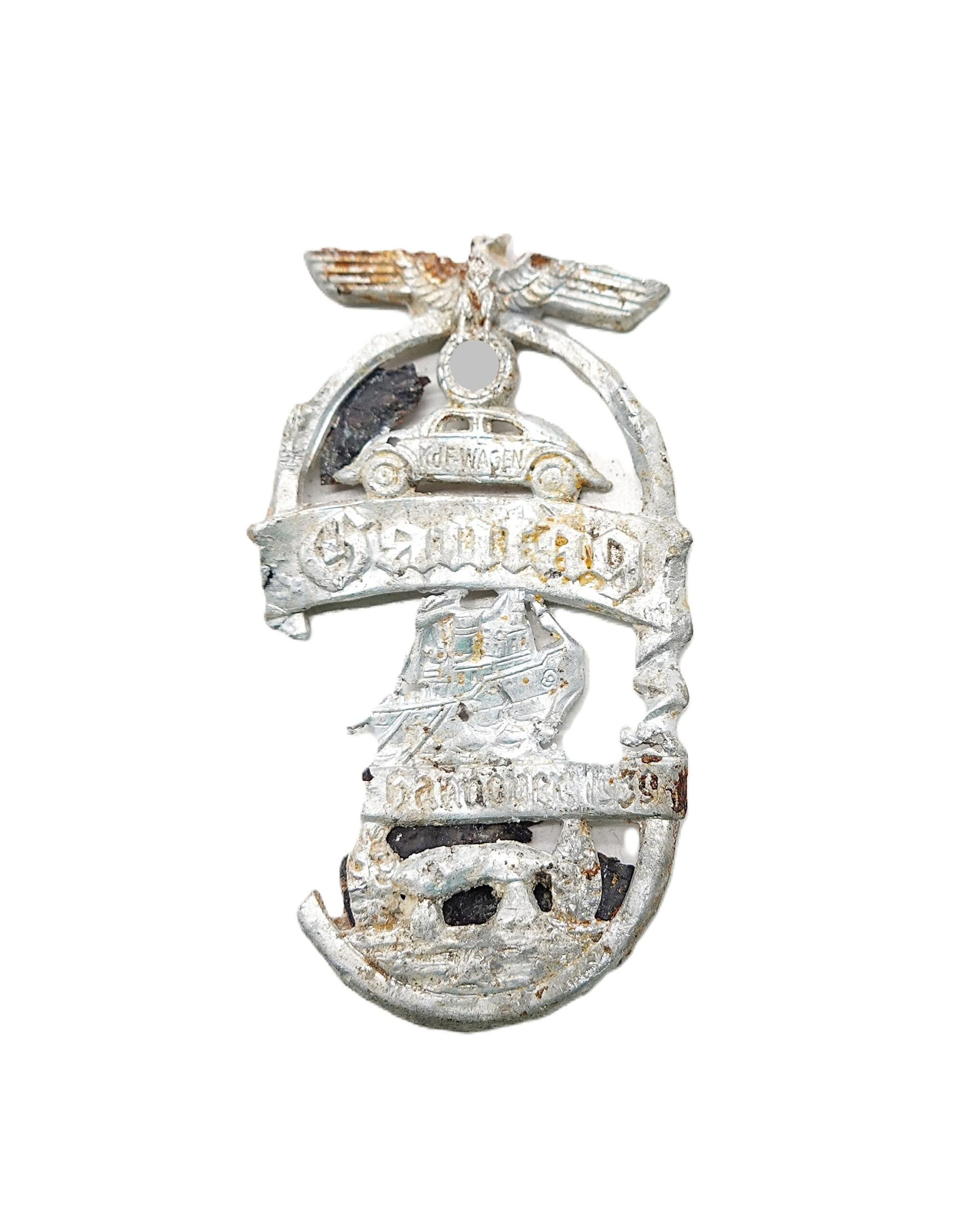 Abzeichen – Gautag Ost-Hannover 1939 – KdF Wagen. Bodenfund aus Aluminium.