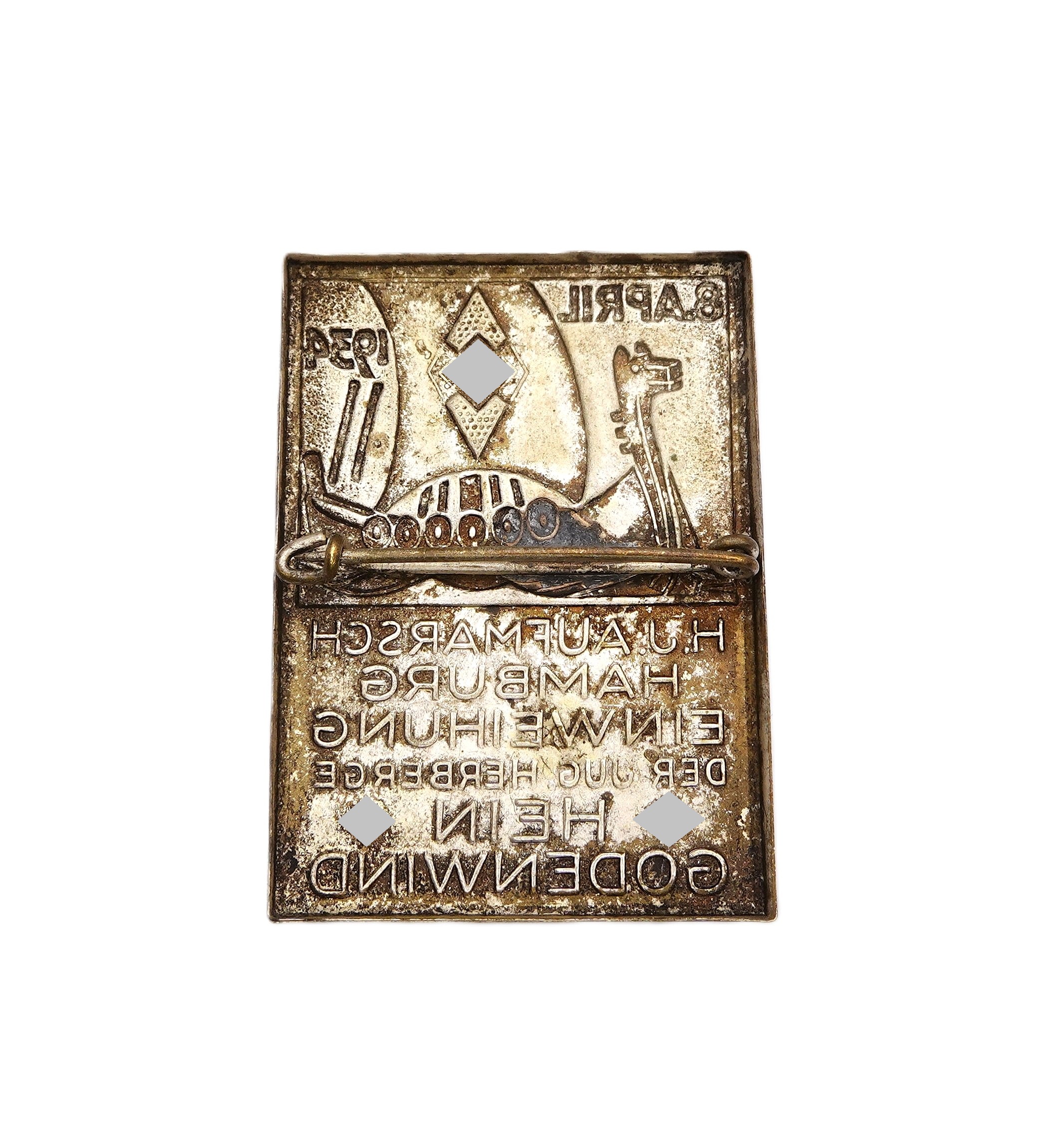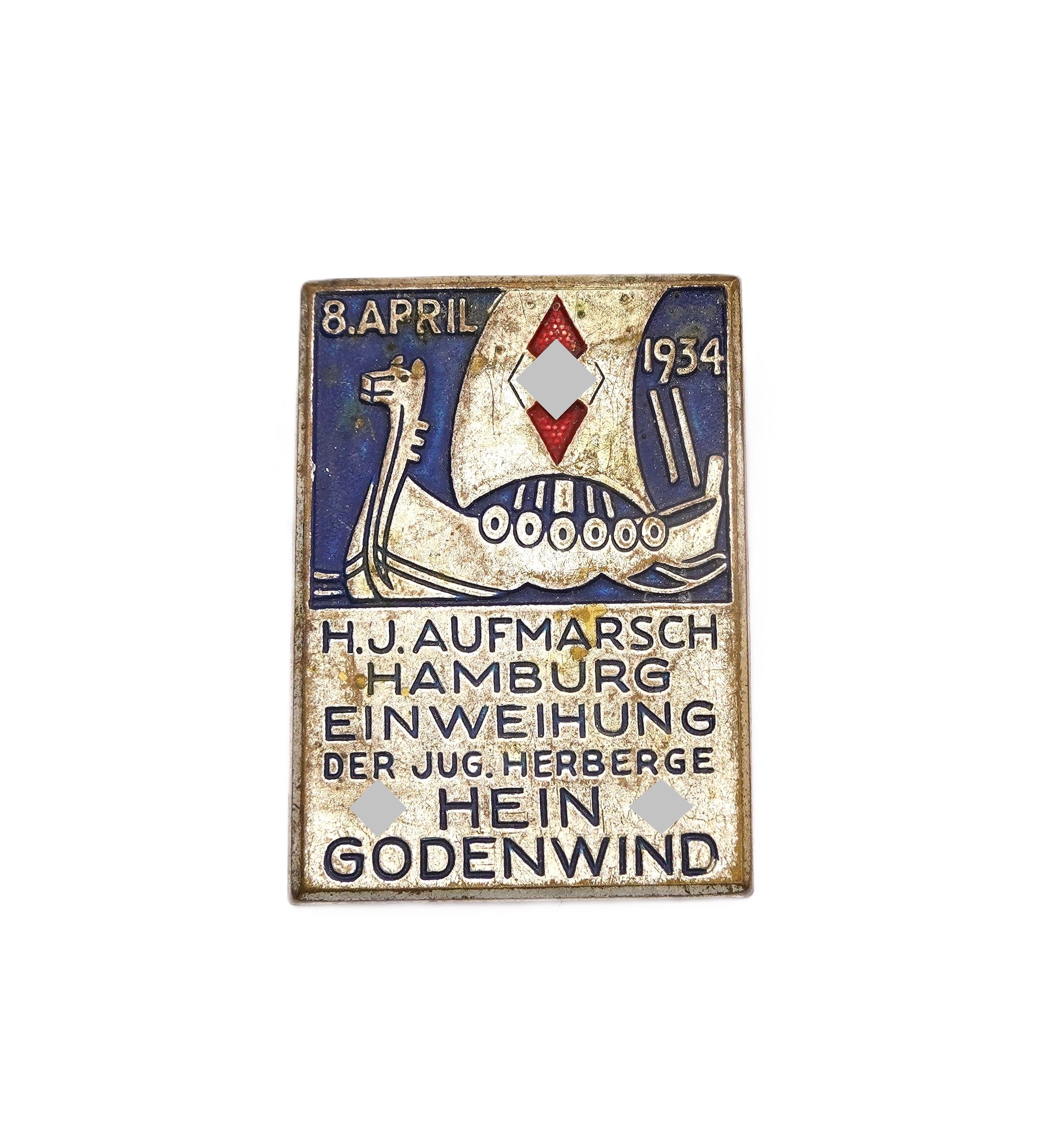 Abzeichen – HJ (Hitlerjugend) – Aufmarsch Hamburg Einweihung der Hein Godenwind Jugendherberge – 8. April 1934. Masse 46 mm x 33 mm. Getragener Zustand.