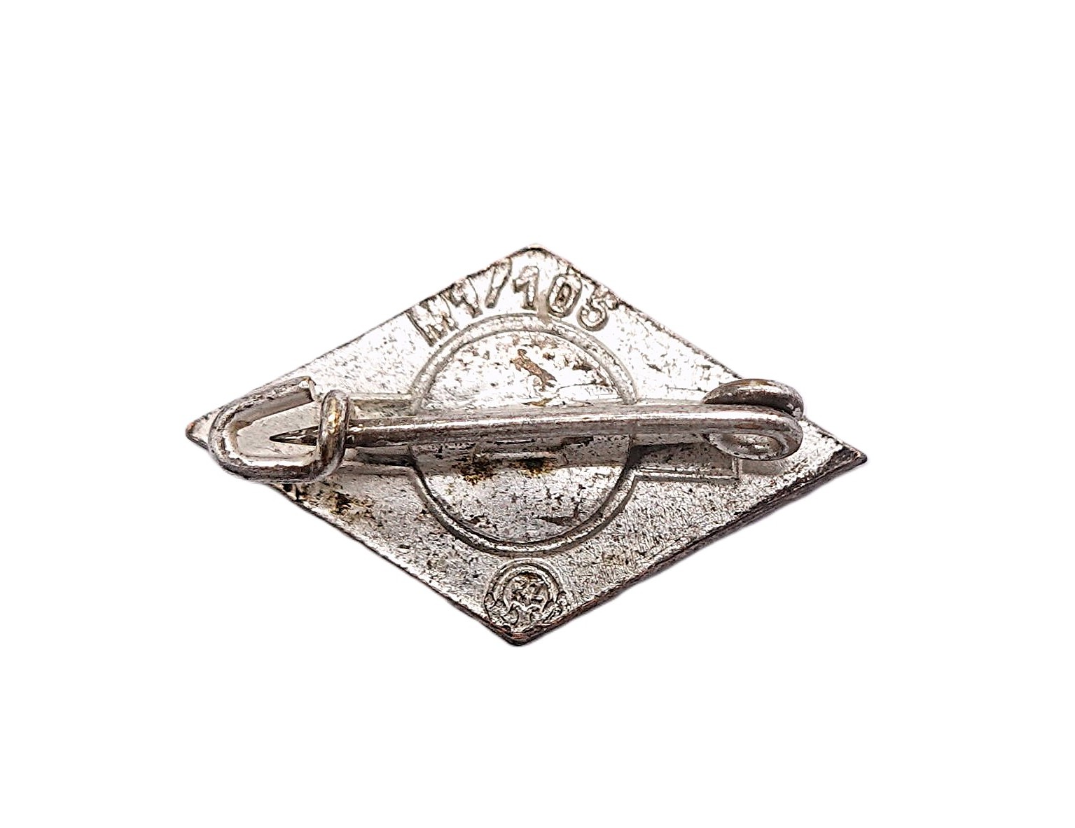 Abzeichen – HJ (Hitlerjugend) Mitgliedsabzeichen. Rückseitig RZM und M1/105 für den Hersteller Hermann Aurich, Dresden. Kleiner Chip in der oberen Ecke der roten Emaille. Getragener Zustand.