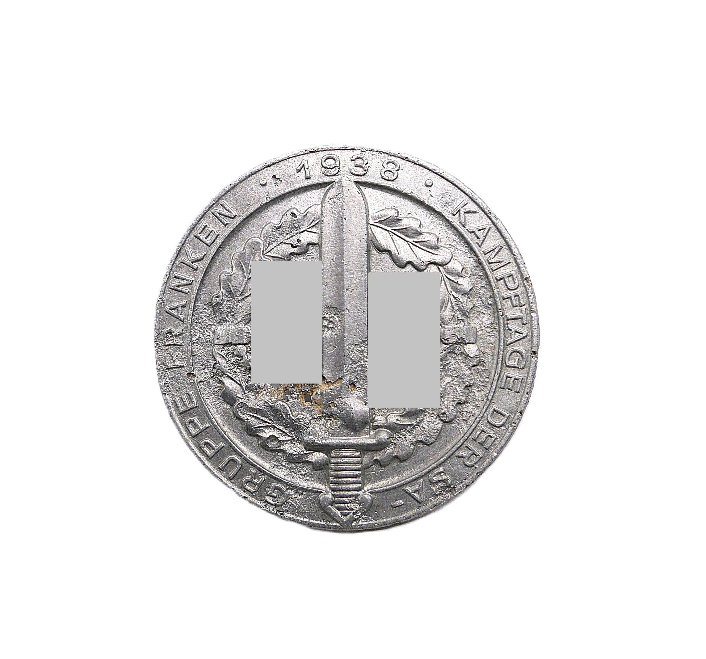 Abzeichen – Kampftage der SA – Gruppe Franken 1938 – Hersteller L. Chr. Lauer, Nürnberg – Berlin. Durchmesser 43 mm. Aluminium. Bodenfund ohne Nadel.