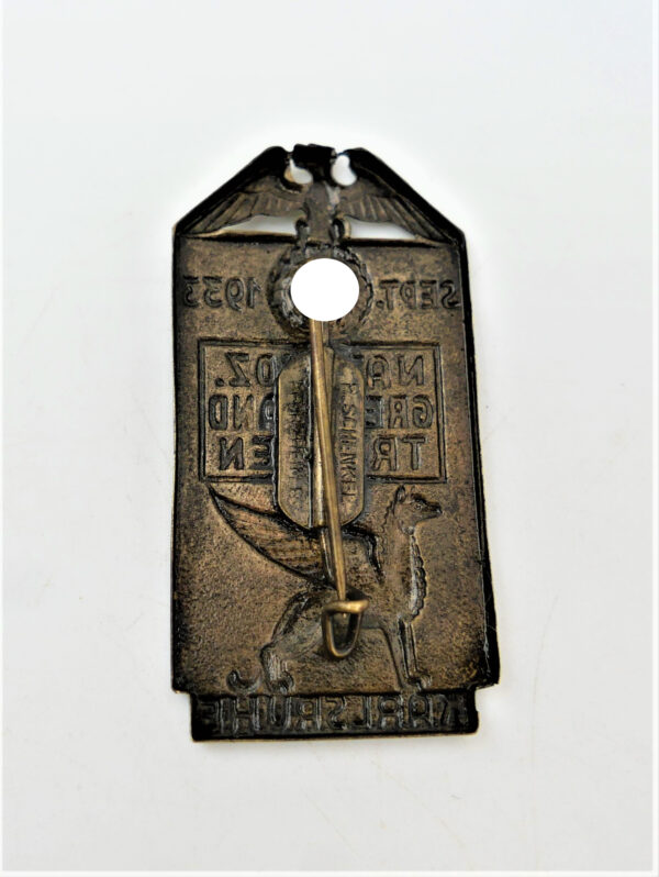 Abzeichen – NAT. – SOZ. GRENZLAND TREFFEN – KARLSRUHE SEPT. 1933 – Hersteller P. SCHENKEL, PFORZHEIM. Getragener Zustand.