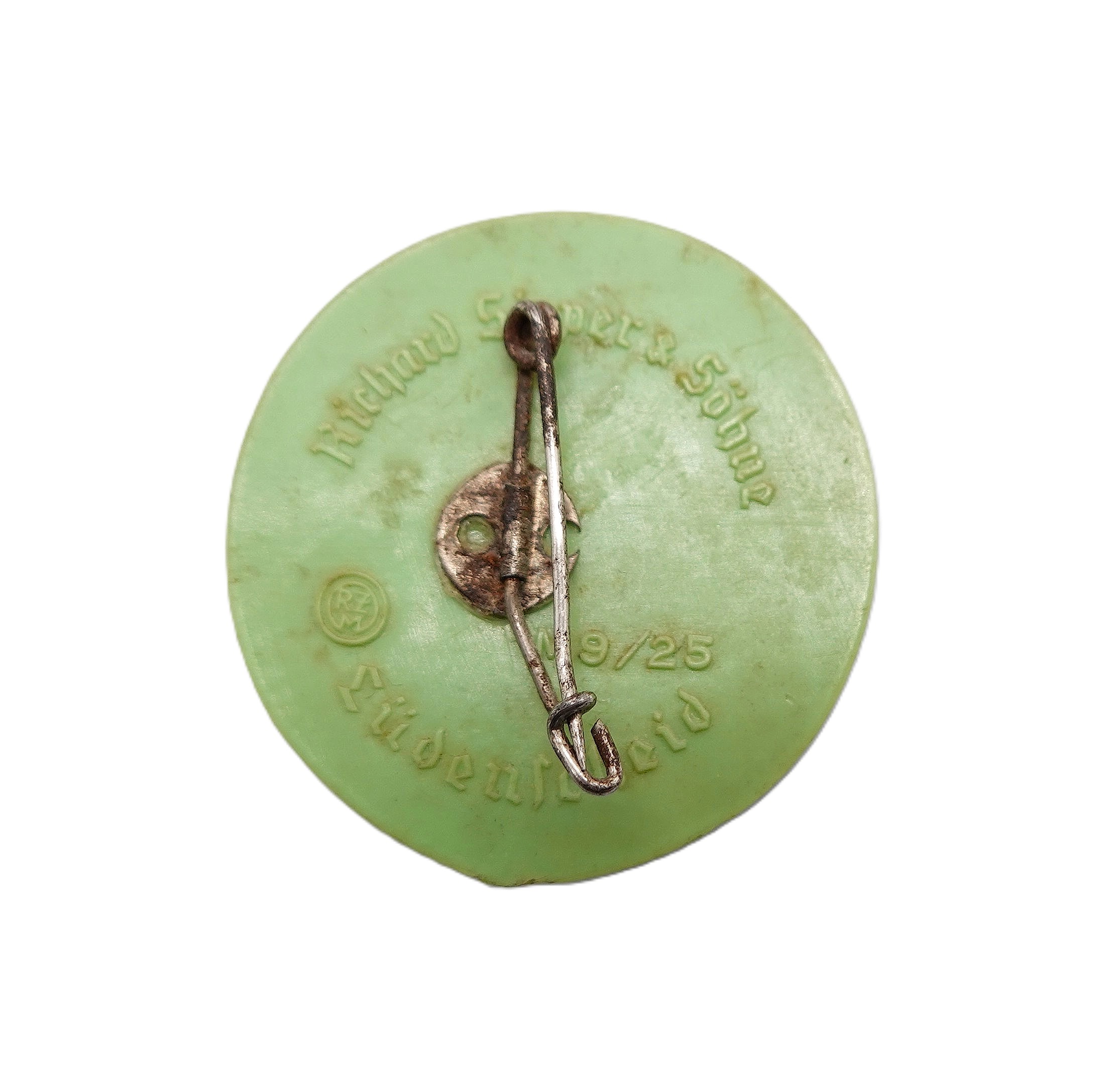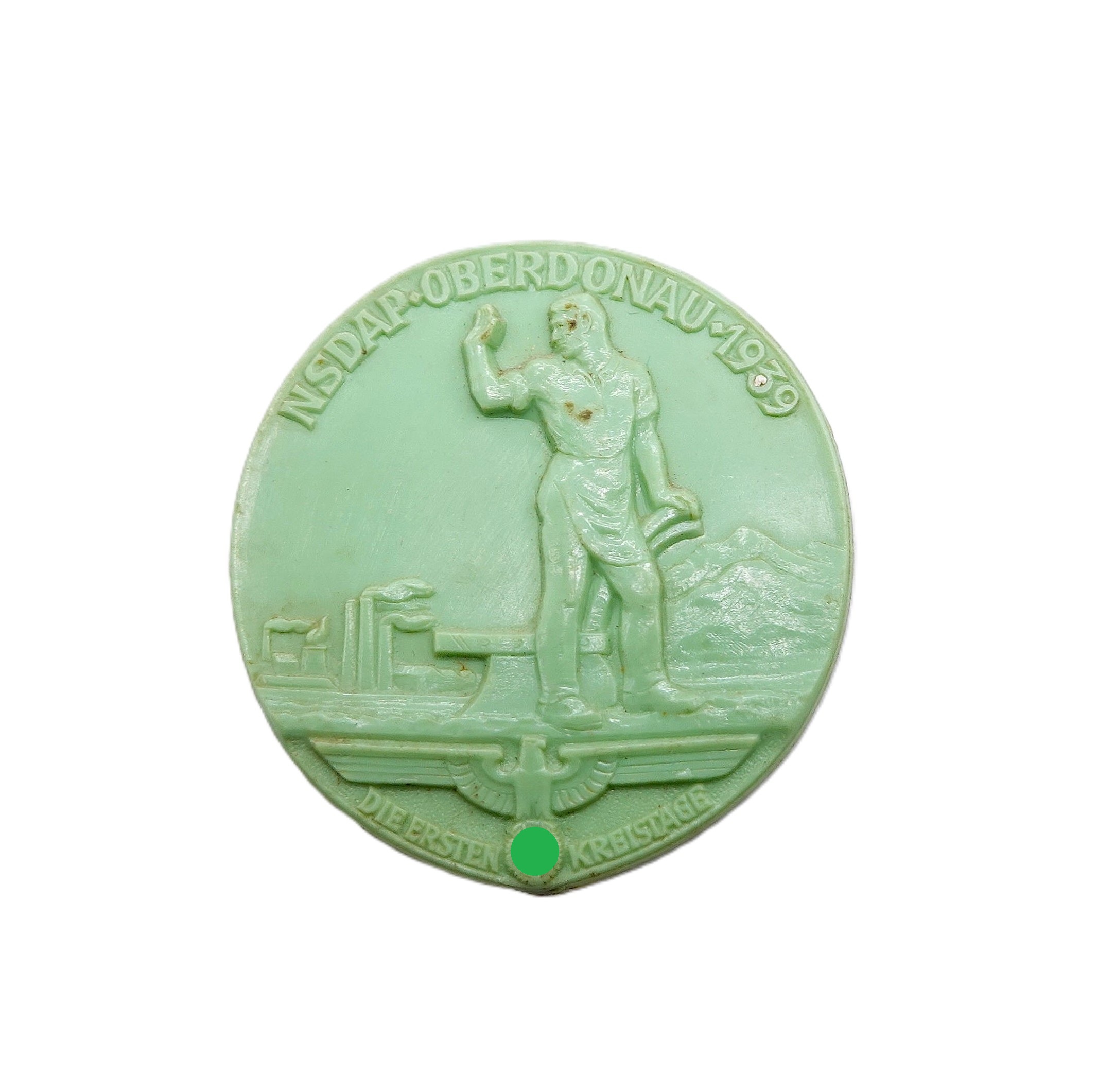 Abzeichen – NSDAP – Oberdonau 1939 – Die ersten Kreistage. Hersteller RZM M9/25 (Richard Sieper & Söhne Lüdenscheid). Durchmesser 35 mm. Kunststoff grün. Nadel etwas verbogen. Getragener Zustand.