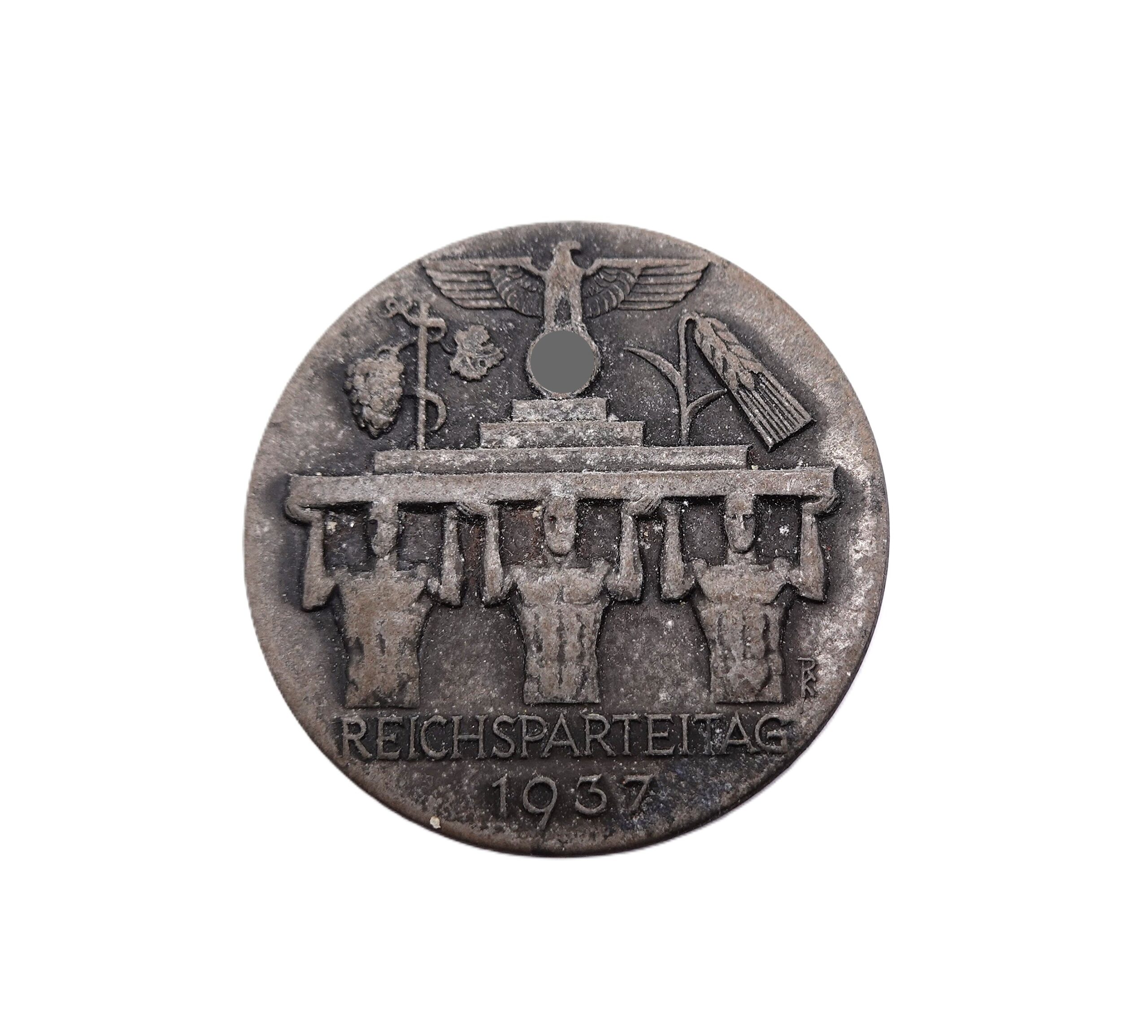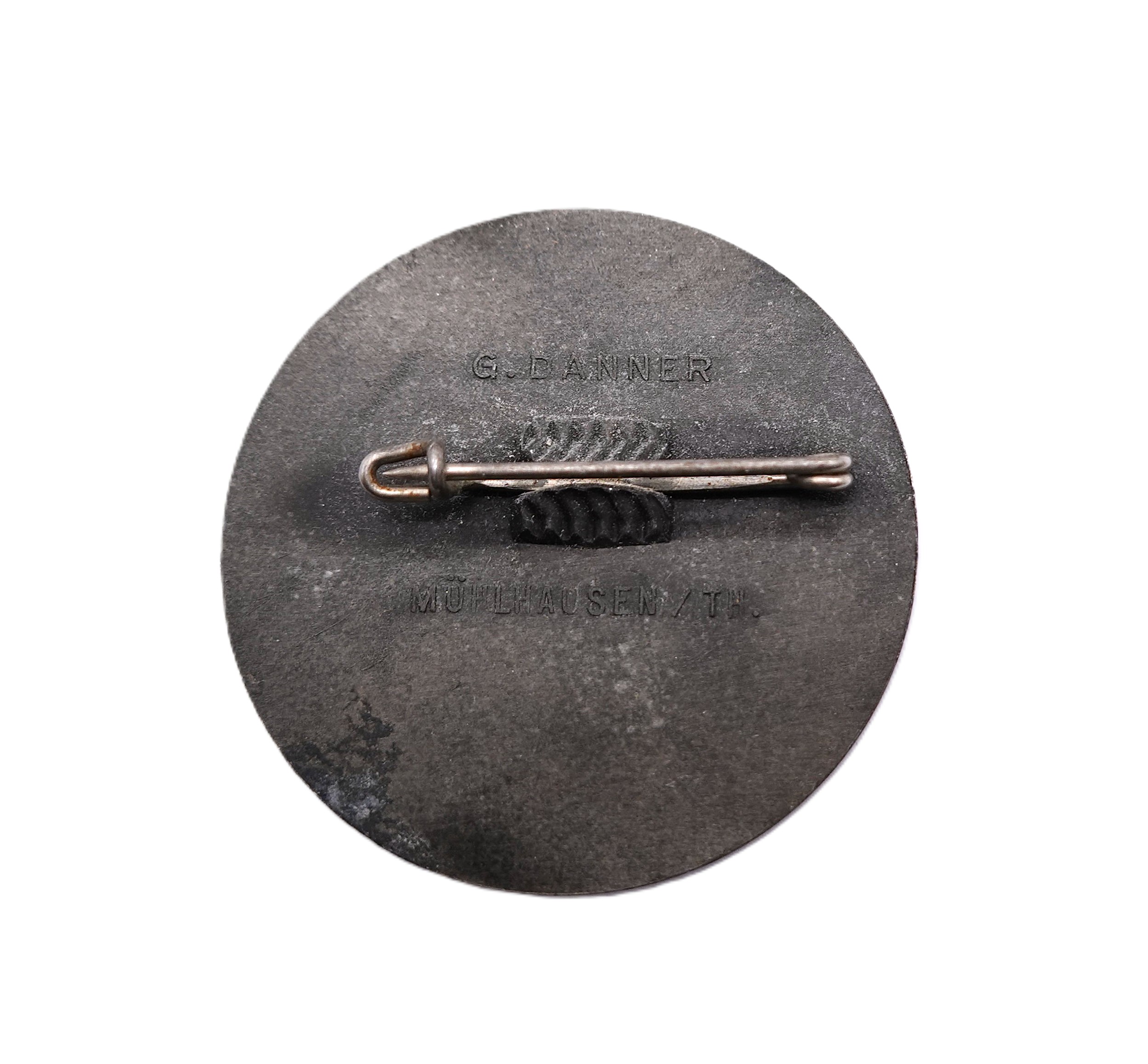 Abzeichen – Reichsparteitag 1937. Rückseitig der Hersteller G. Danner, Mühlhausen / TH. Getragener Zustand.