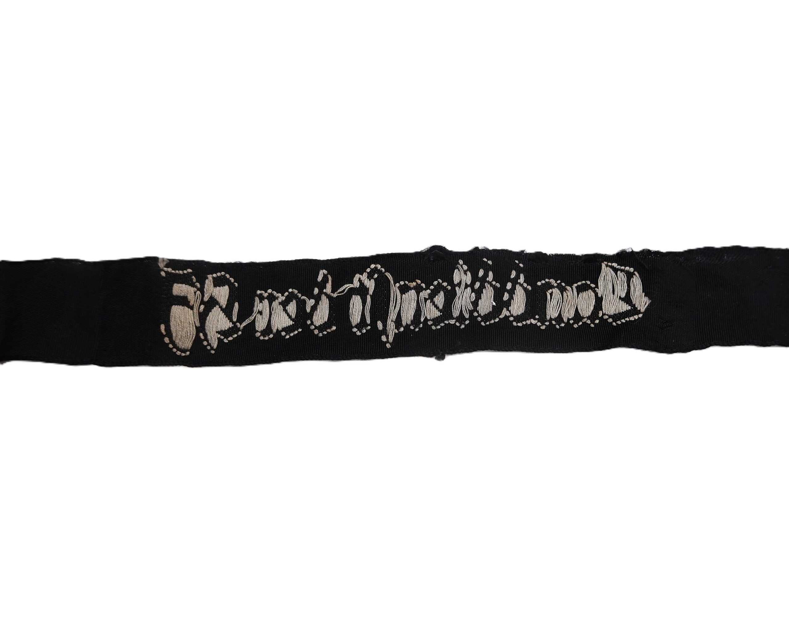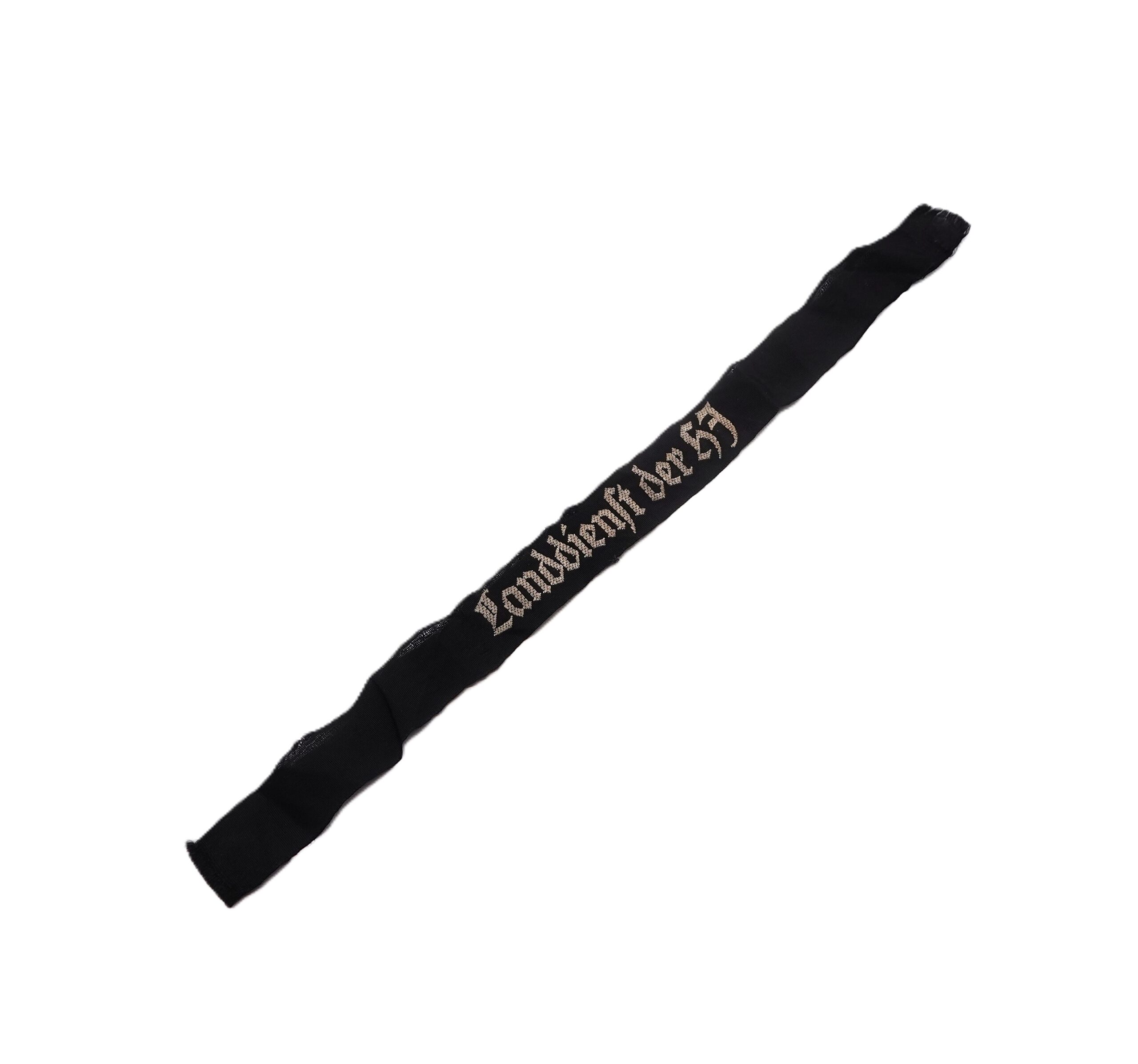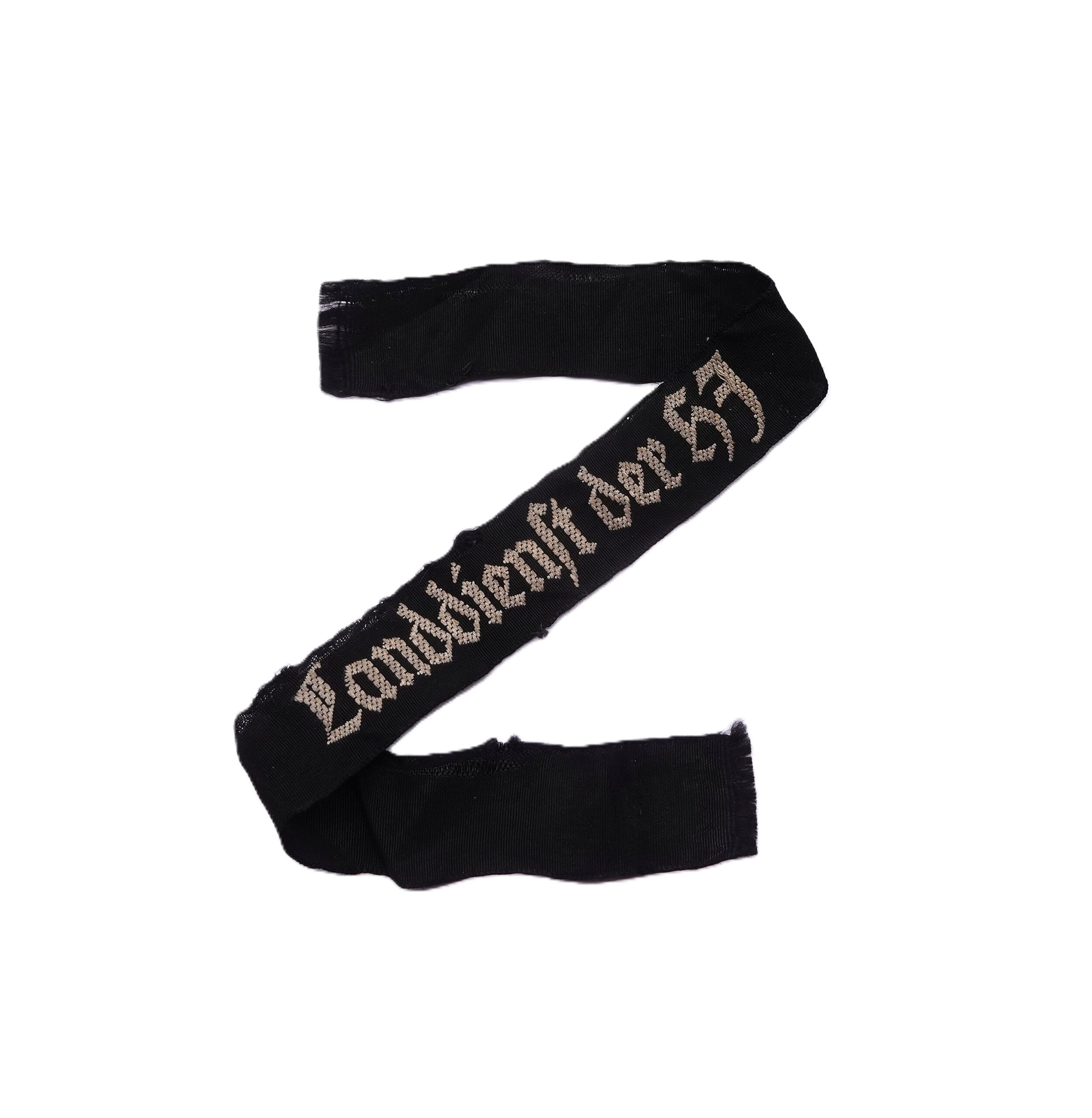 Ärmelband – Landdienst der HJ (Hitlerjugend). Bevo-gewebte Ausführung, weiße Schrift auf schwarzem Grund. Schöner getragener Zustand. Wurde von der Uniform abgetrennt. Länge 39 cm.