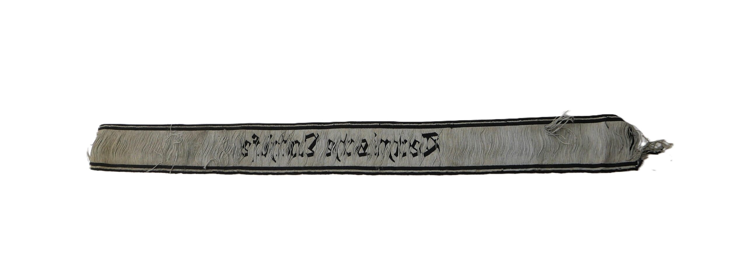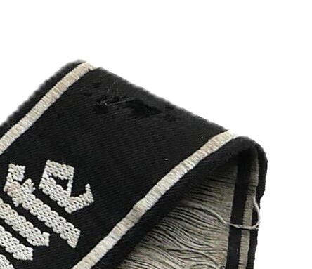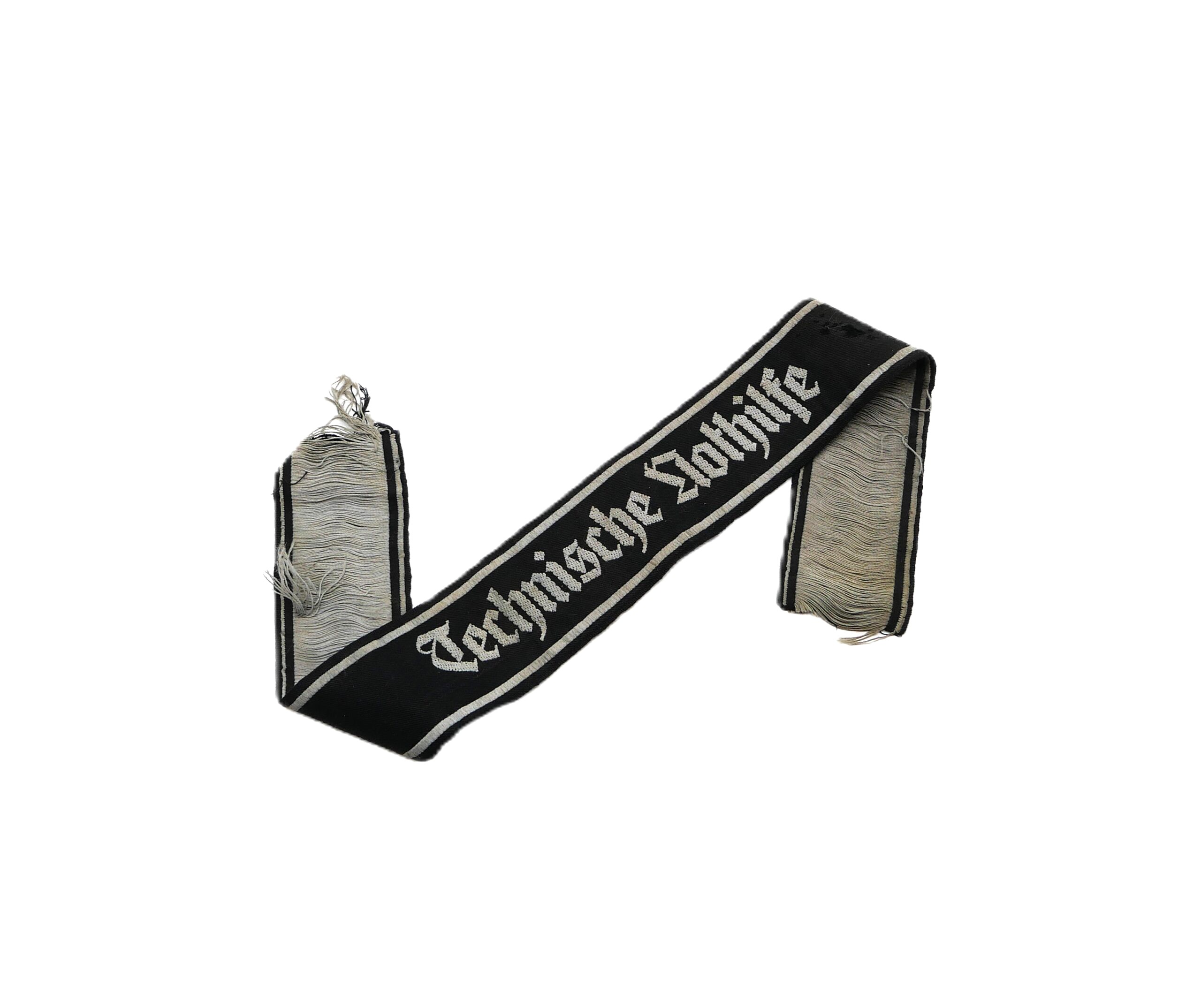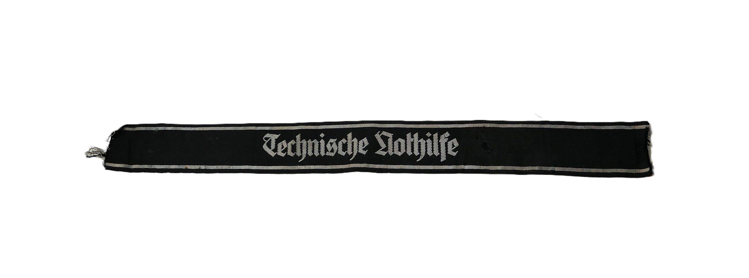 Ärmelband – Ärmelstreifen – Technische Nothilfe (TeNo). Gewebte Ausführung, Länge 42 cm, Breite 4 cm. Getragener Zustand mit kleineren oberflächlichen Beschädigungen.