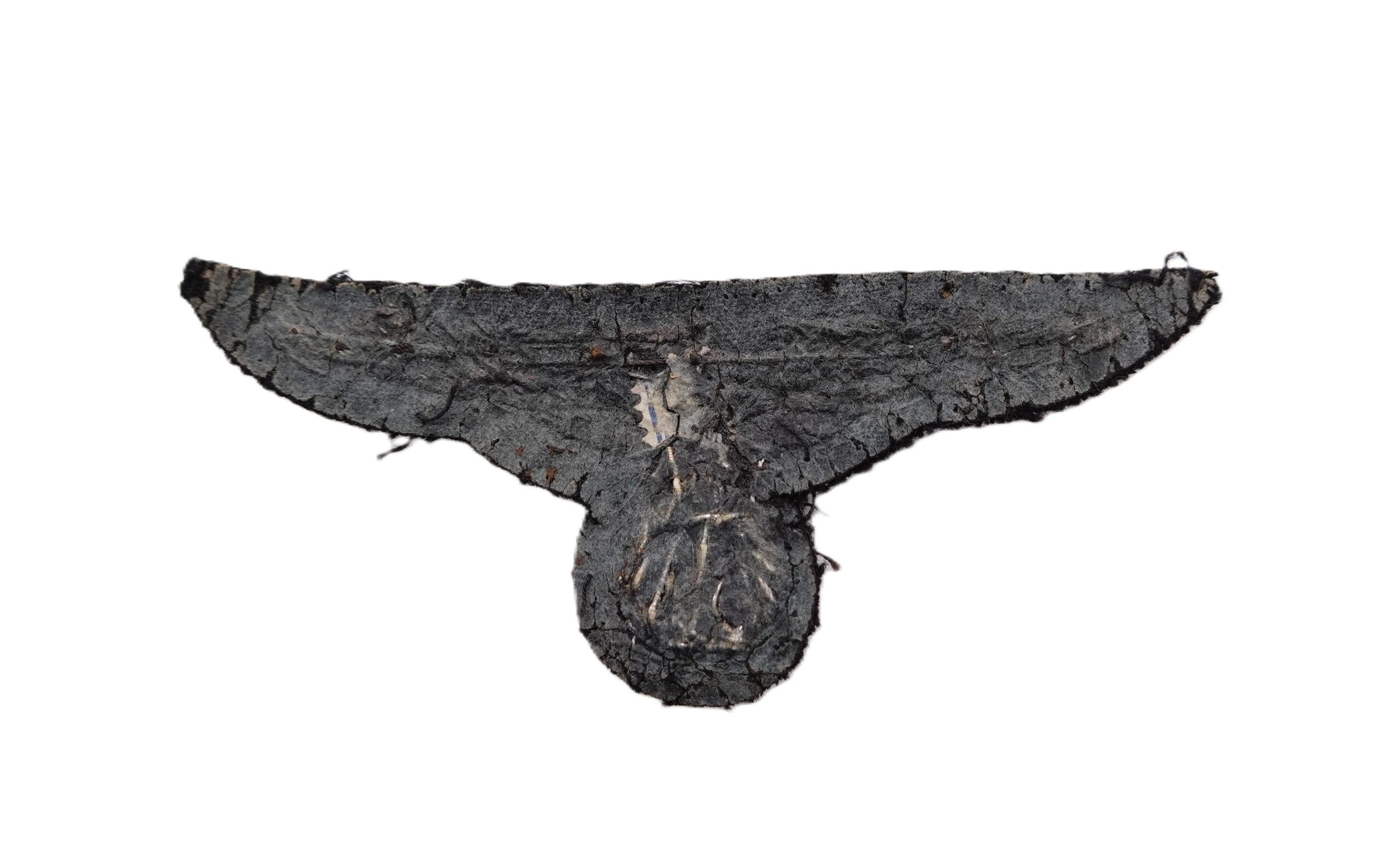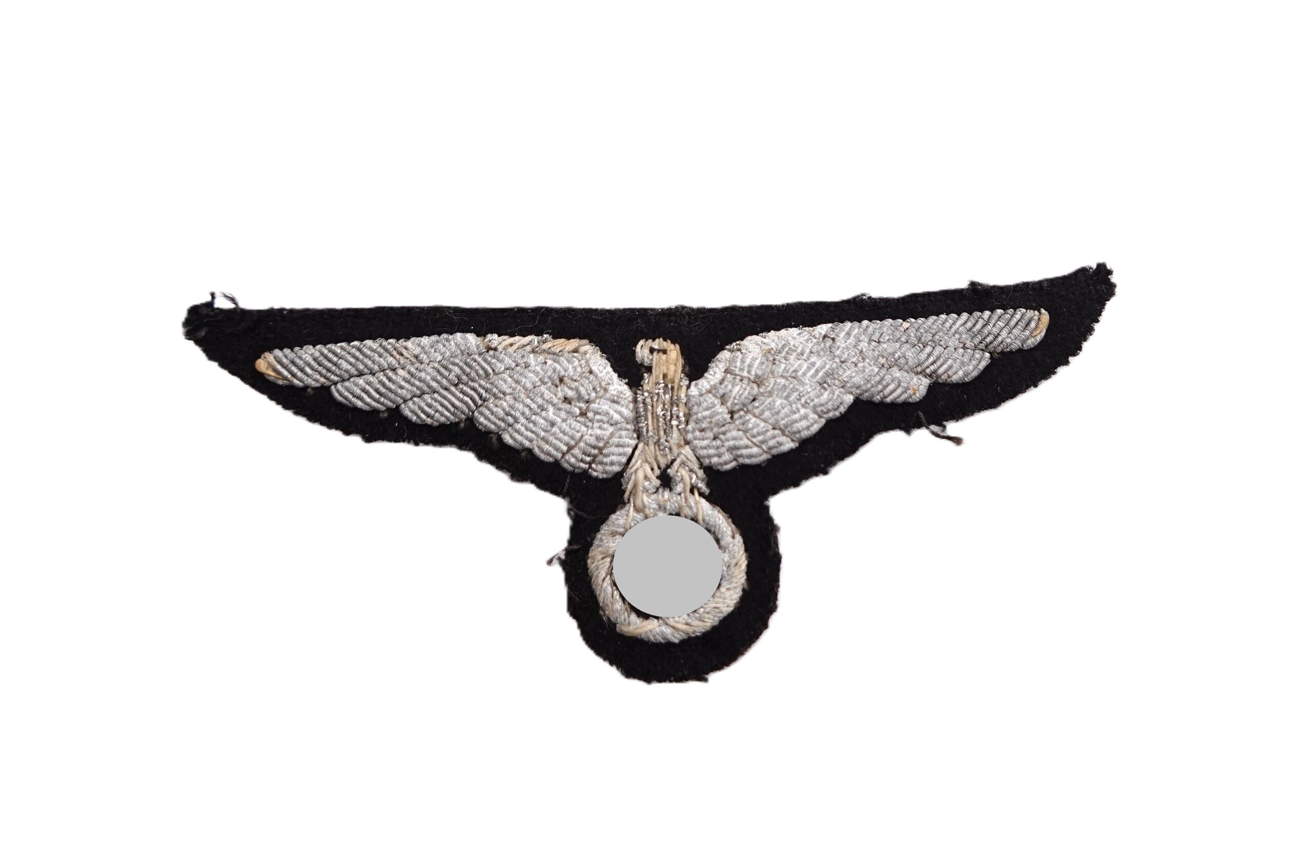Bahnschutz – Ärmeladler für Offiziere. Metallfaden handgestickt. Breite 9,7 cm. Rückseitig noch Reste des Preisschild. Wurde von der Uniform abgetrennt. Schöner gertragener Zustand.