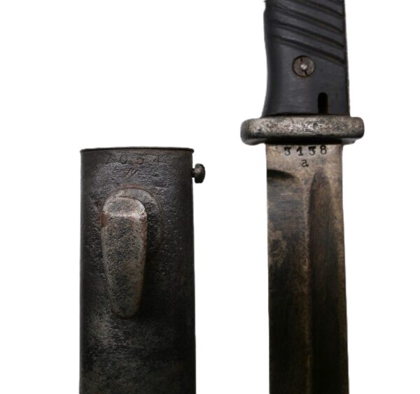 Bajonett 98K. Hersteller Mundlos. Bajonett und Scheide nicht nummerngleich. Scheide ohne Farbe und auf der Rückseite eine Beule. Drücker nicht gängig. Auf dem Klingenrücken die Zahl 40.