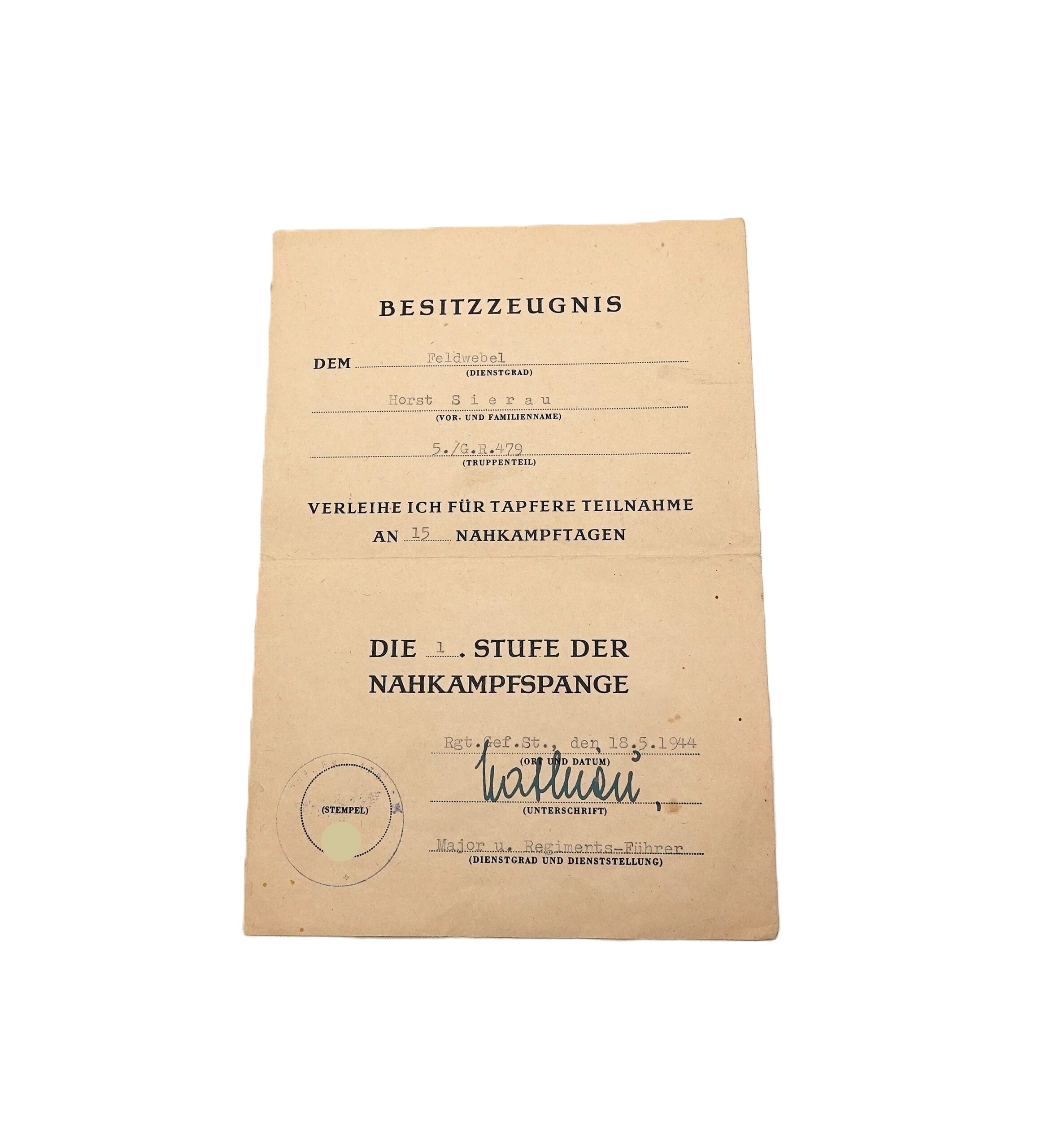 Besitzzeugnis – Nahkampfspange Bronze – 1. Stufe für 15 Nahkampftage. Für den Feldwebel Horst Sierau, Angehöriger des 5./G.R. 479. Ausgestellt im Rgt. Gef. St. am 18. 5. 1944. Urkunde wurde einmal gefaltet. Alterstypische Gebrauchsspuren.