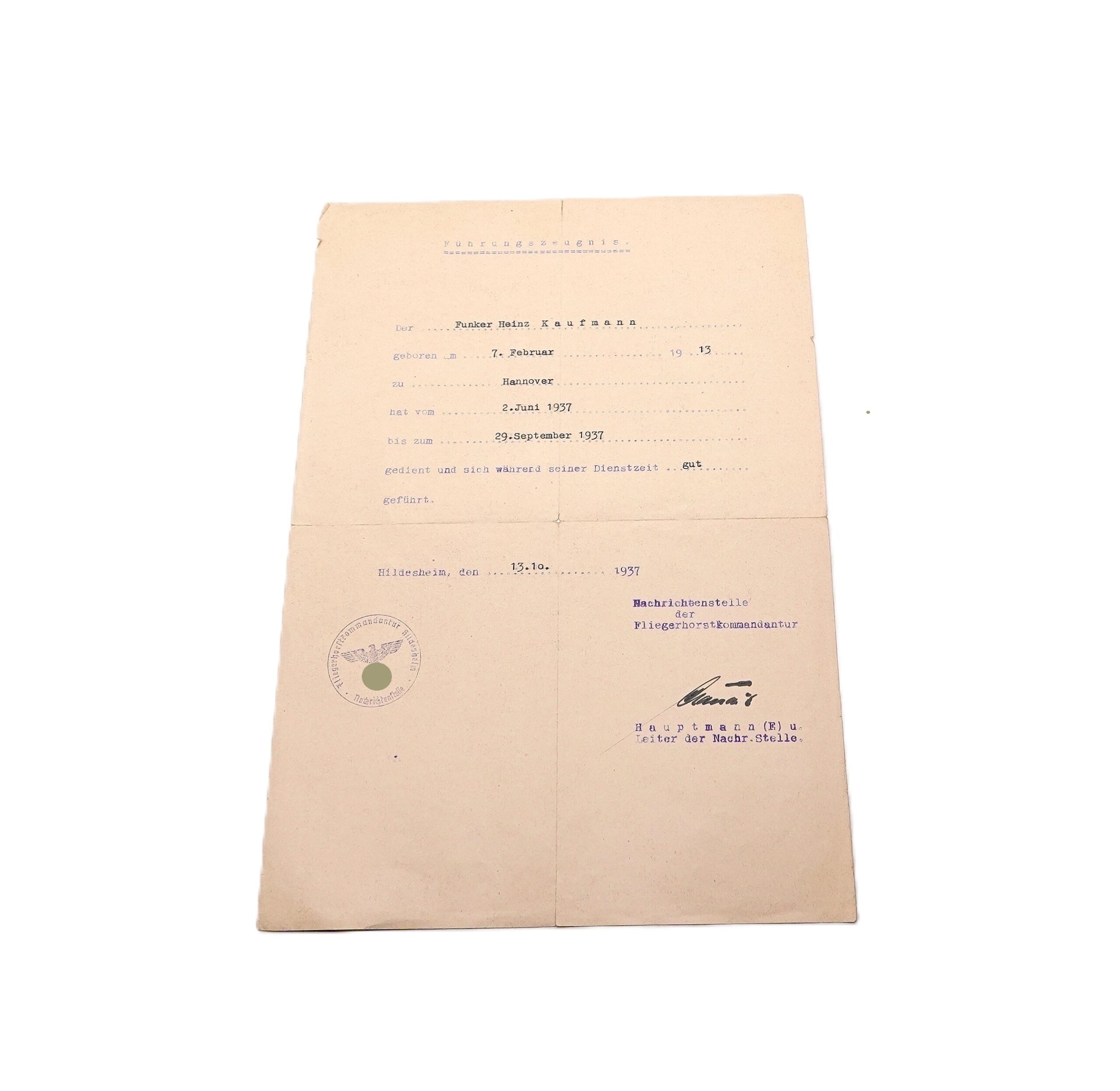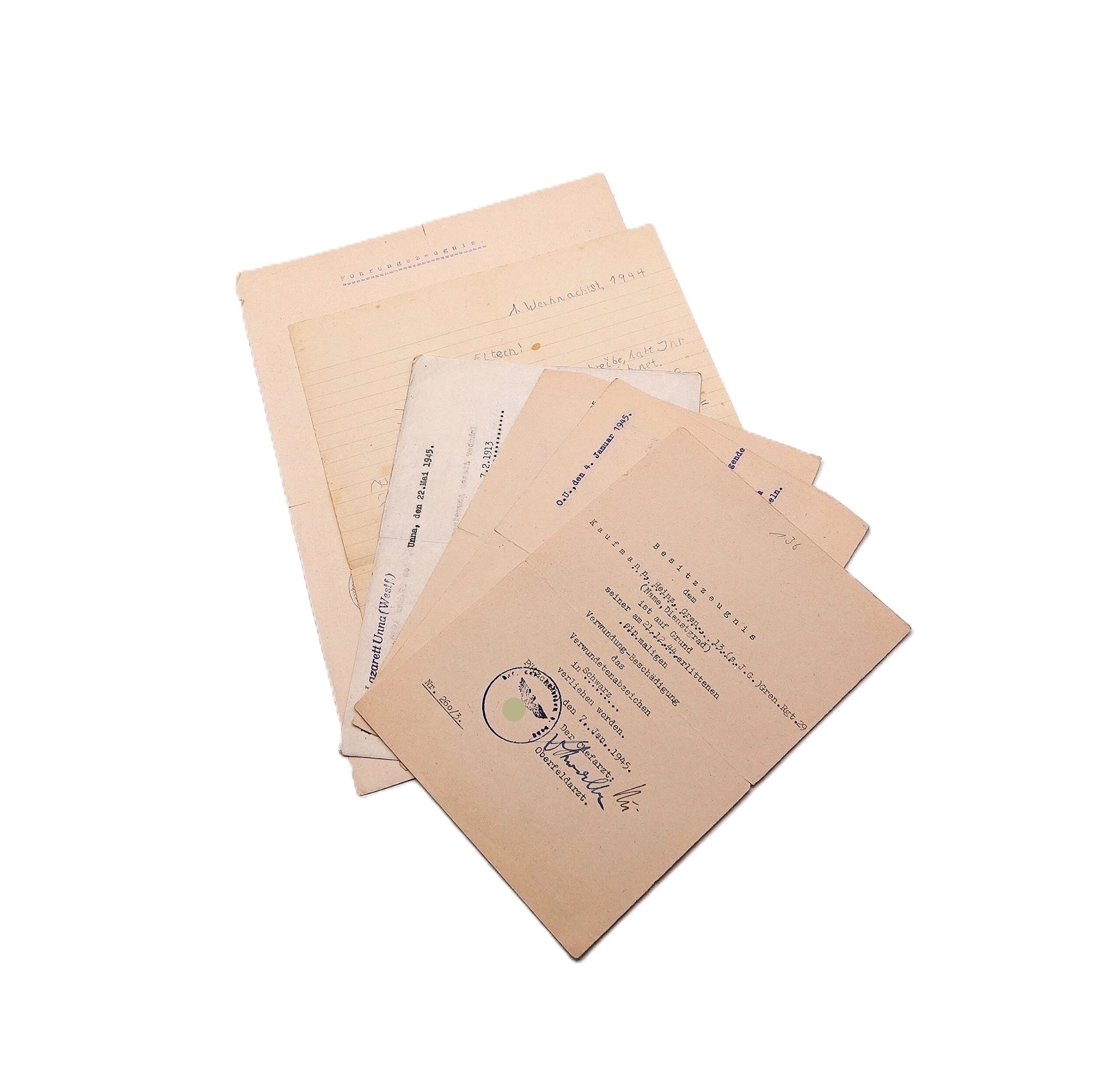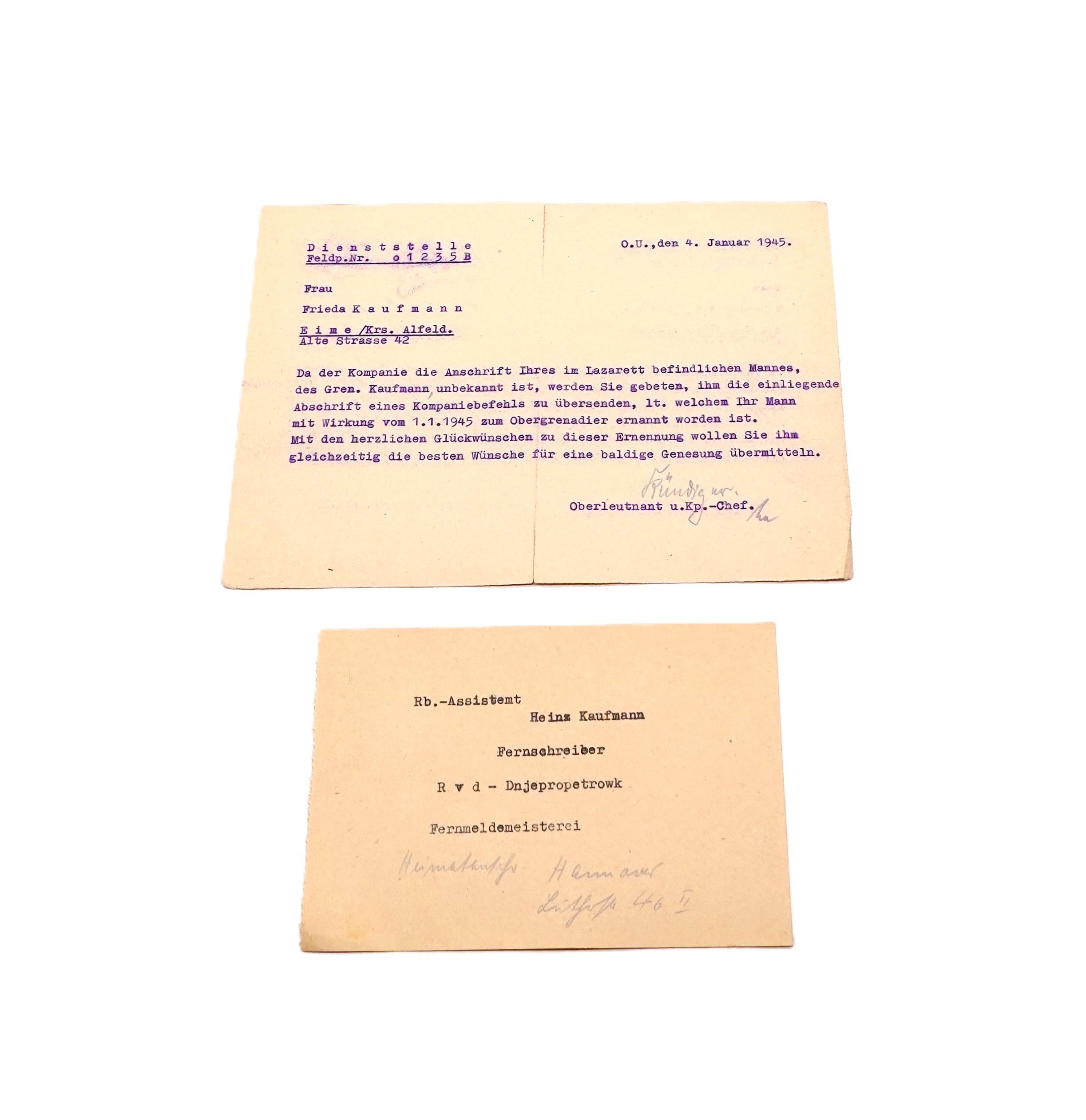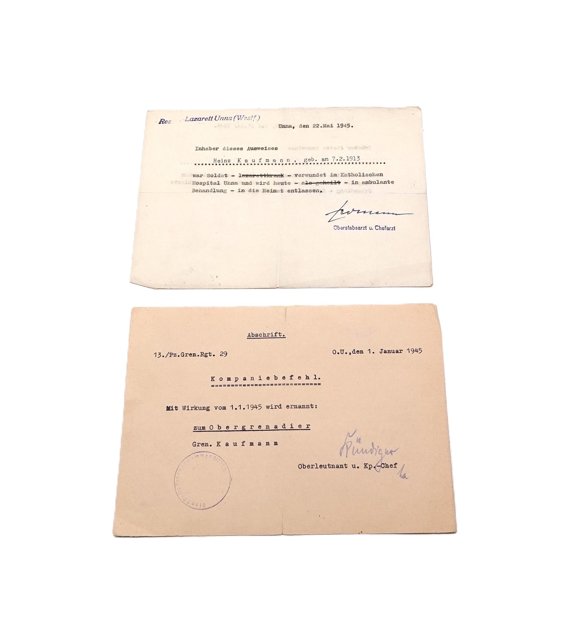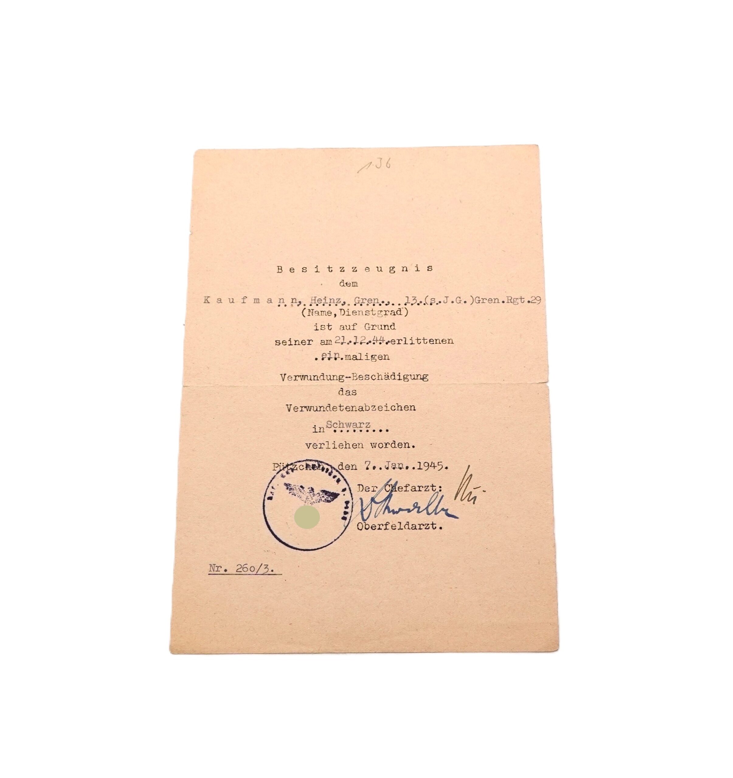 Besitzzeugnis zum schwarzen Verwundetenabzeichen. Ausgestellt am 7. Jan. 1945. Urkunde und einzelne Papiere, sowie ein Brief des Heinz Kaufmann, Angehöriger des Gren. Rgt. 29.