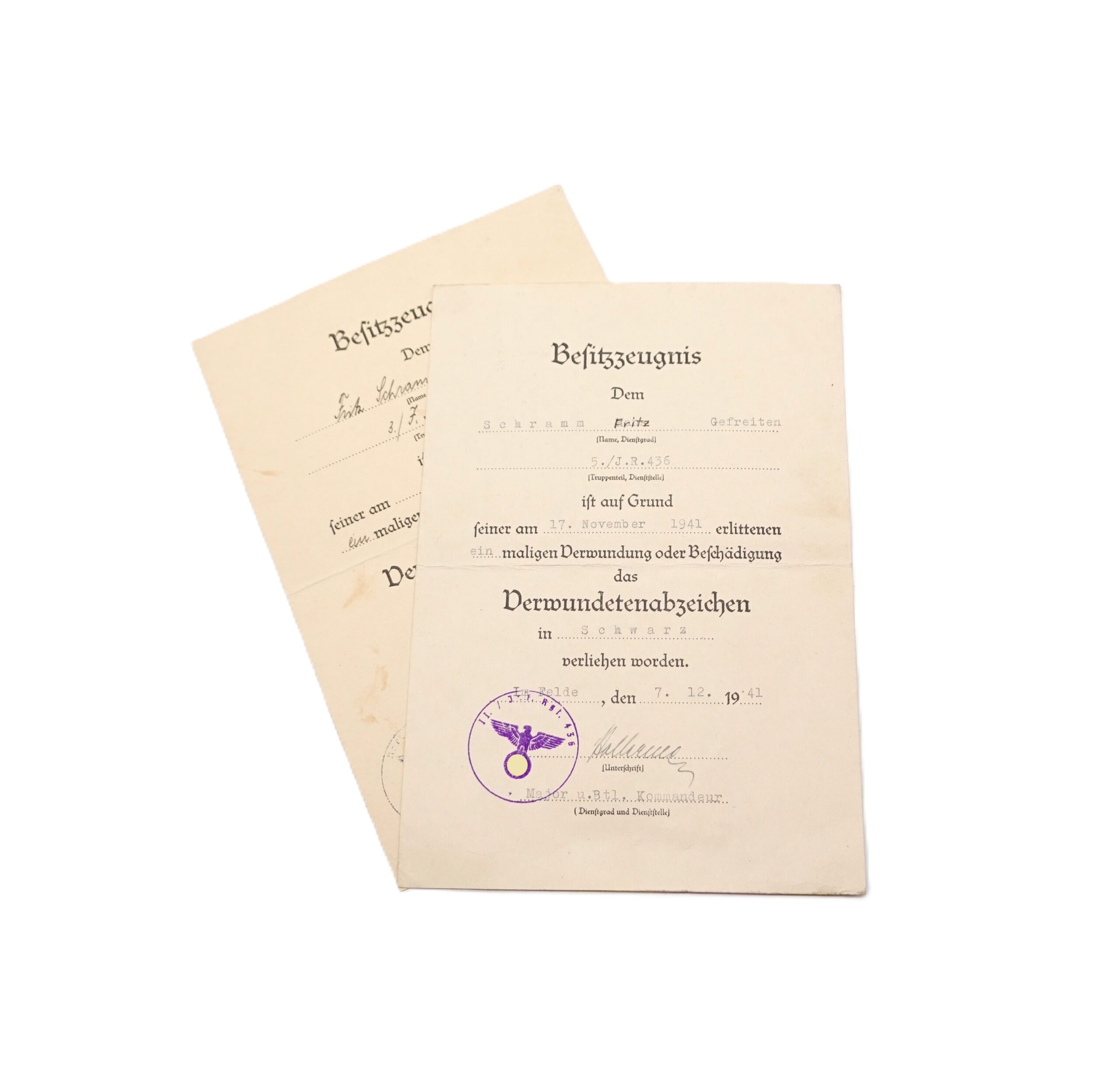 2 x Besitzzeugnis zum Verwundetenabzeichen des Unteroffiziers Fritz Schramm. Angehöriger des 3./I.R. 436.