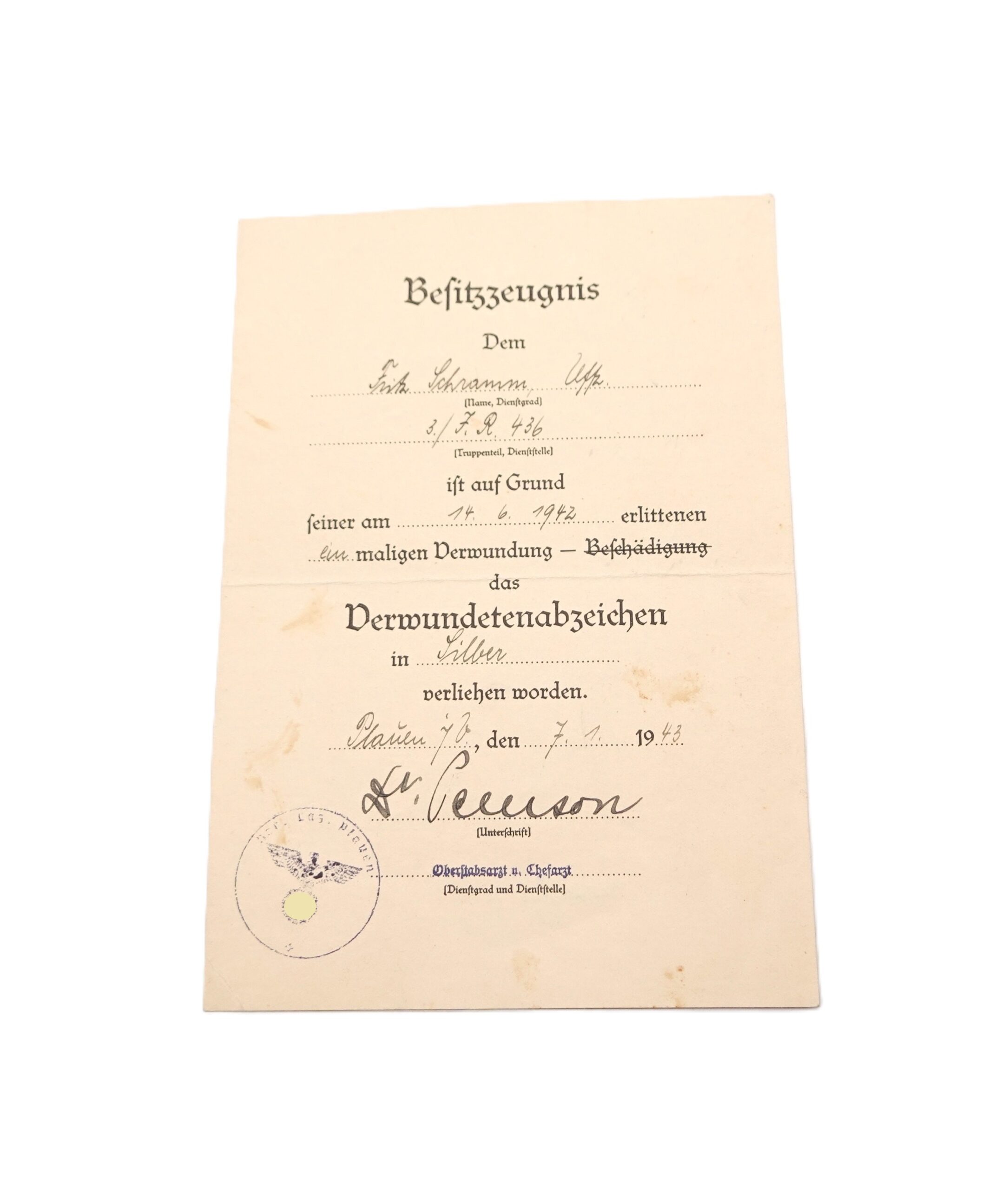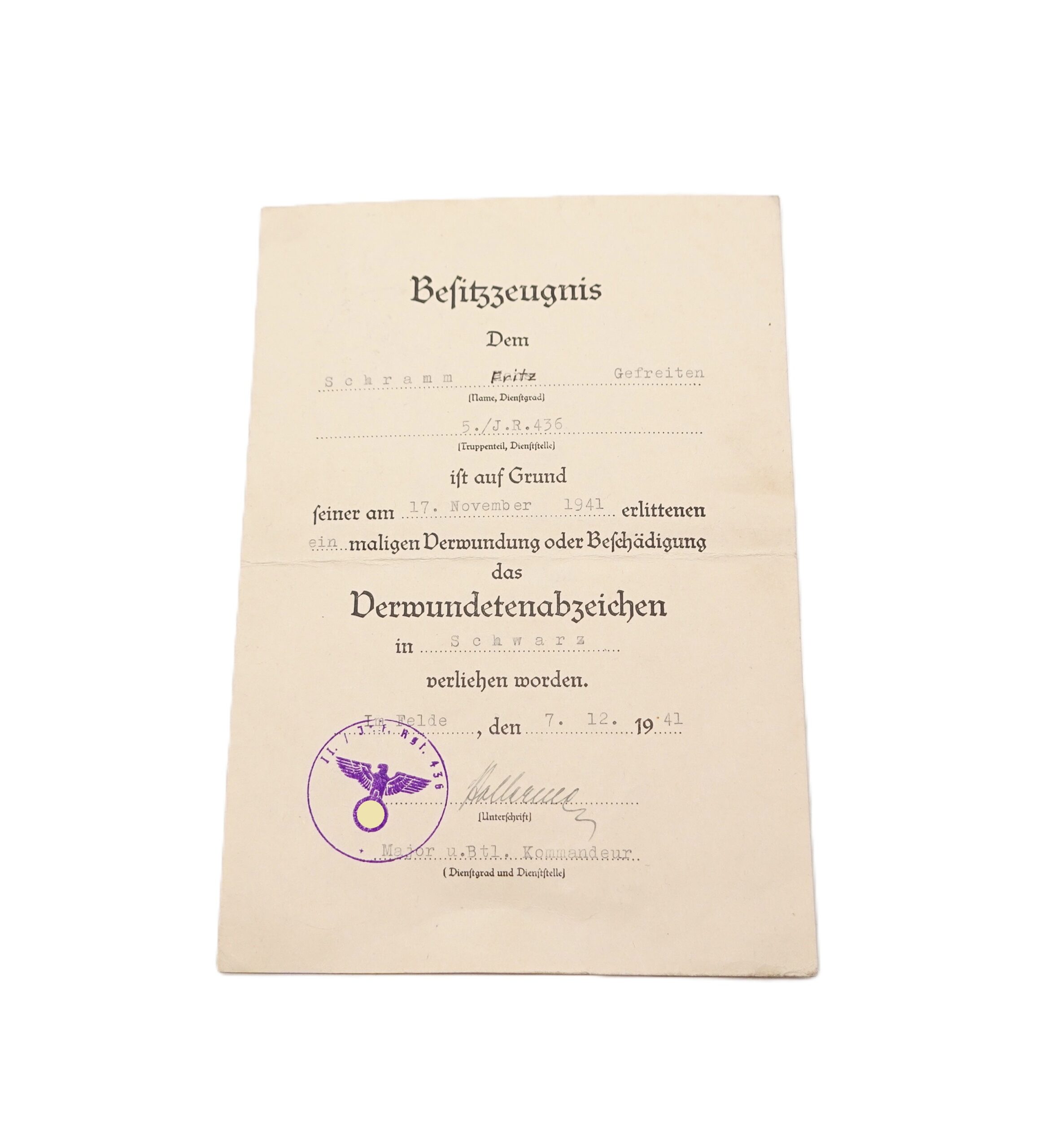 – Besitzzeugnis zum schwarzen Verwundetenabzeichen. Ausgestellt im Felde am 17. November 1941.