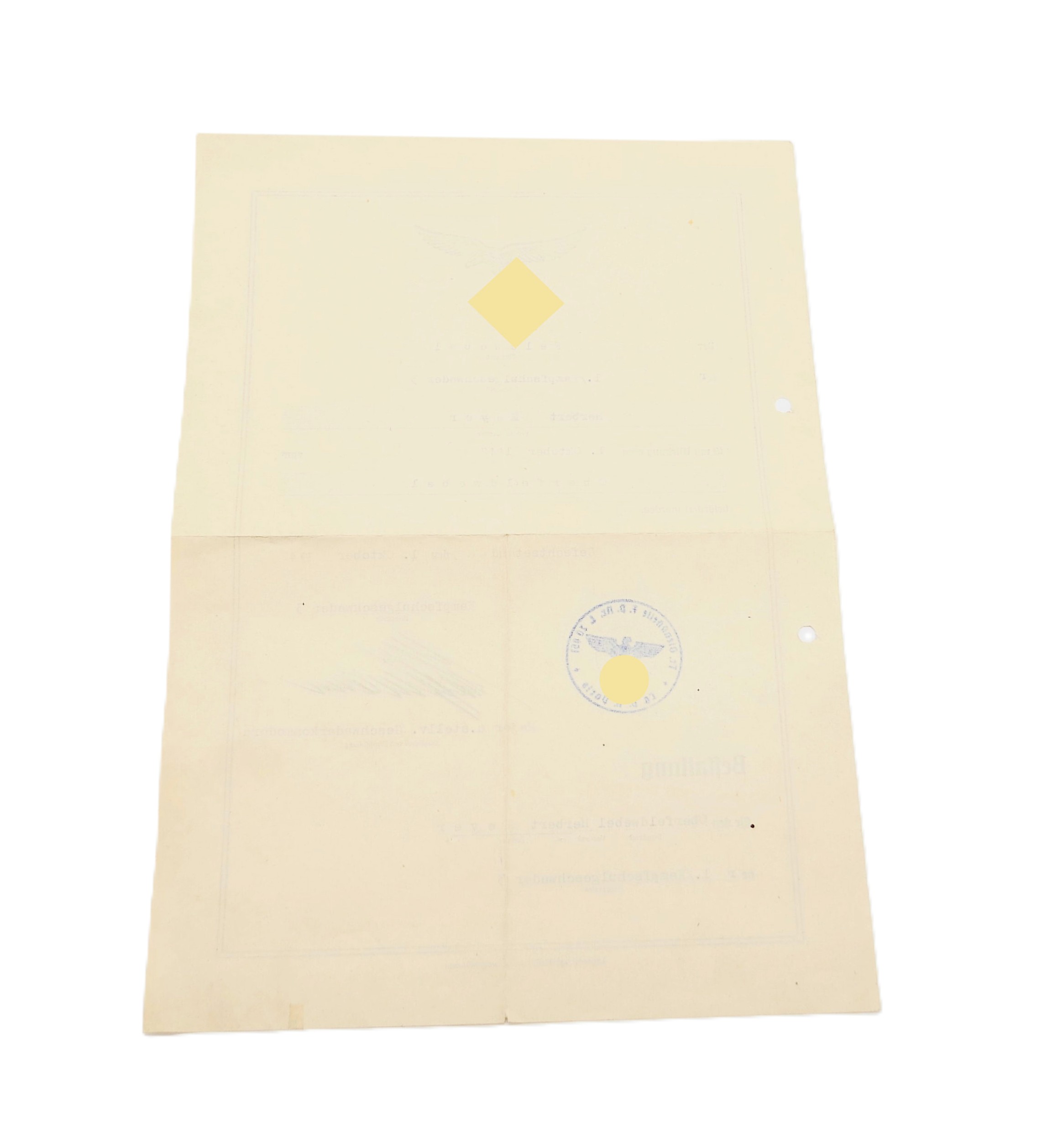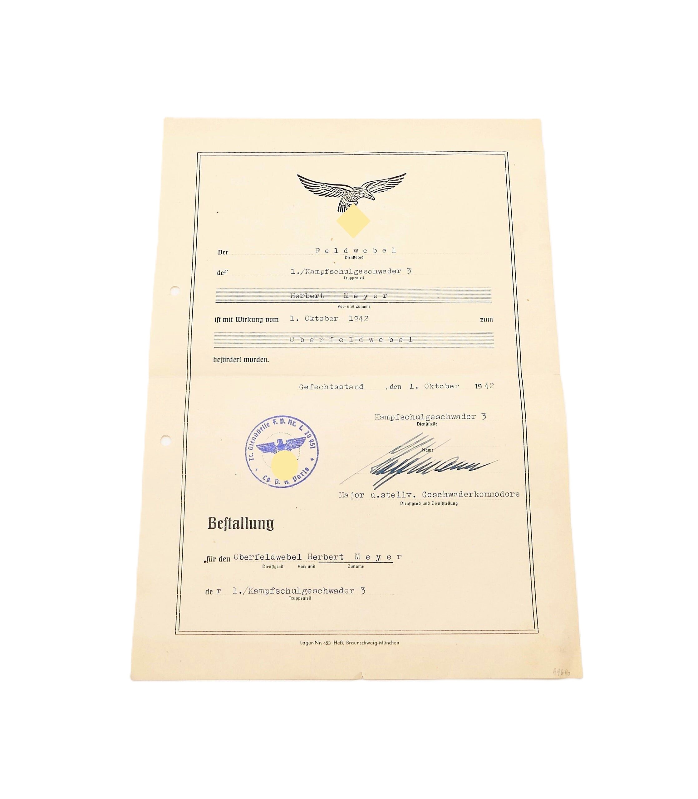 Bestallungsurkunde des Feldwebels Herbert Meyer, des 1./Kampfschulgeschwader 3, zum Oberfeldwebel. Ausgestellt am 1. Oktober 1942. Urkunde ist gelocht und zweimal gefaltet.