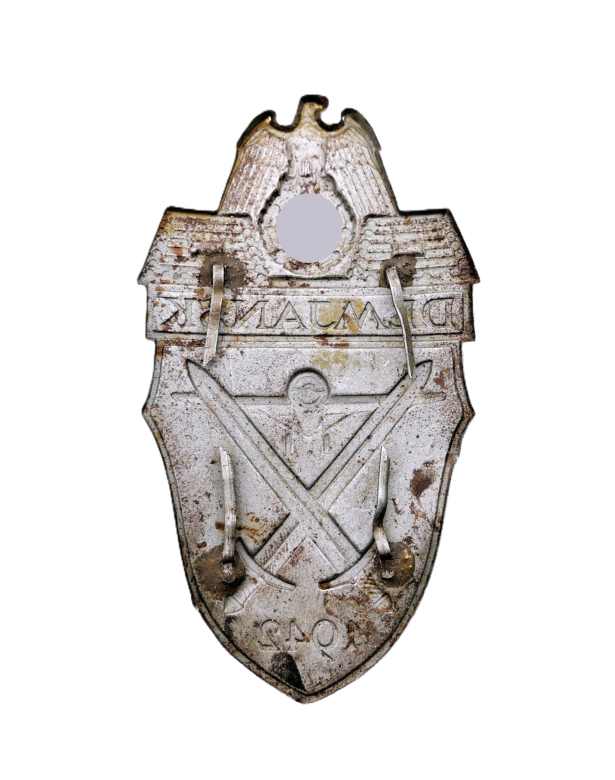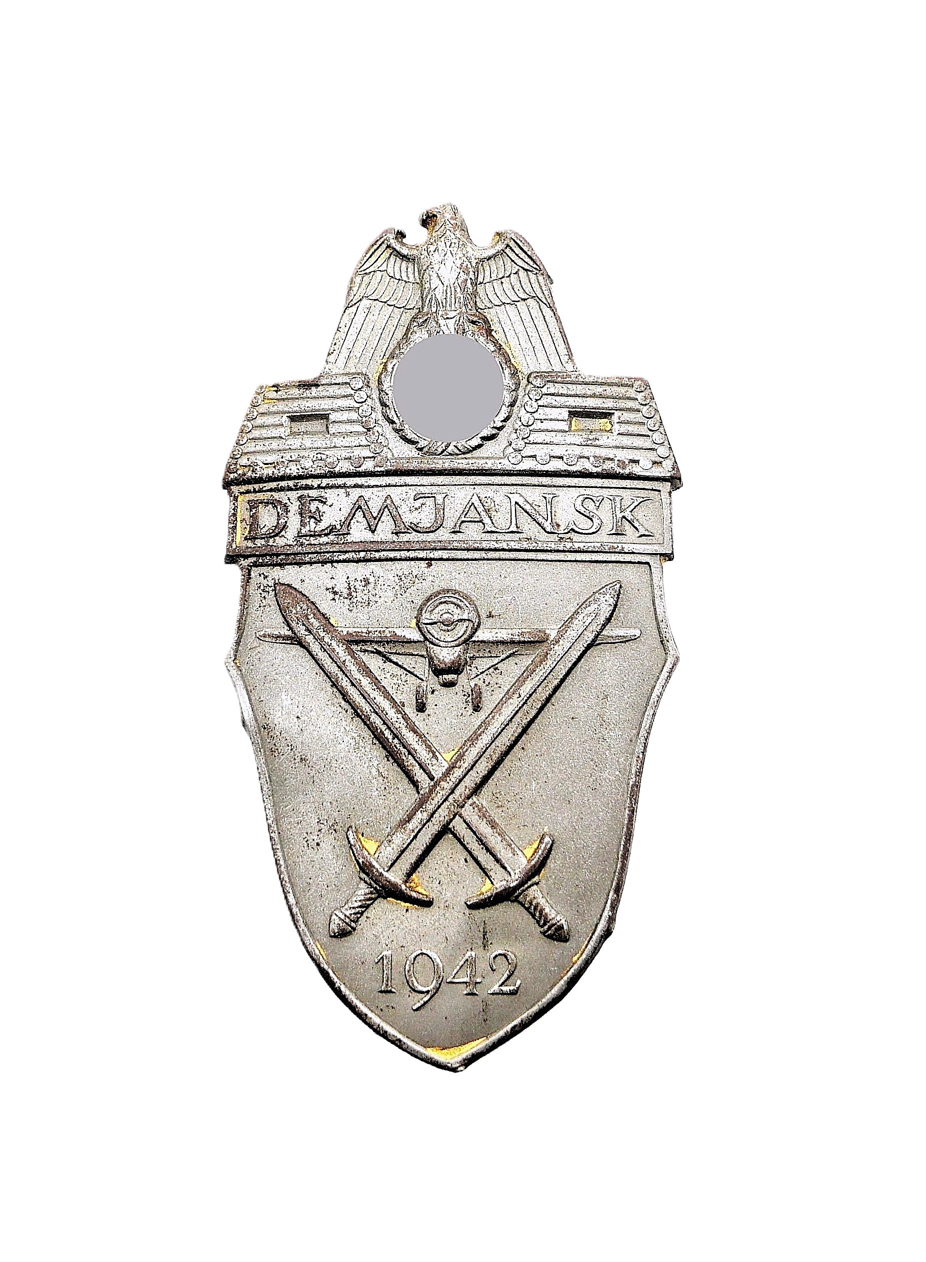 Demjanskschild. Stoffunterlage und Rückenplatte fehlen. Alle vier Splinten sind dran. Magnetisch. Getragener Zustand.