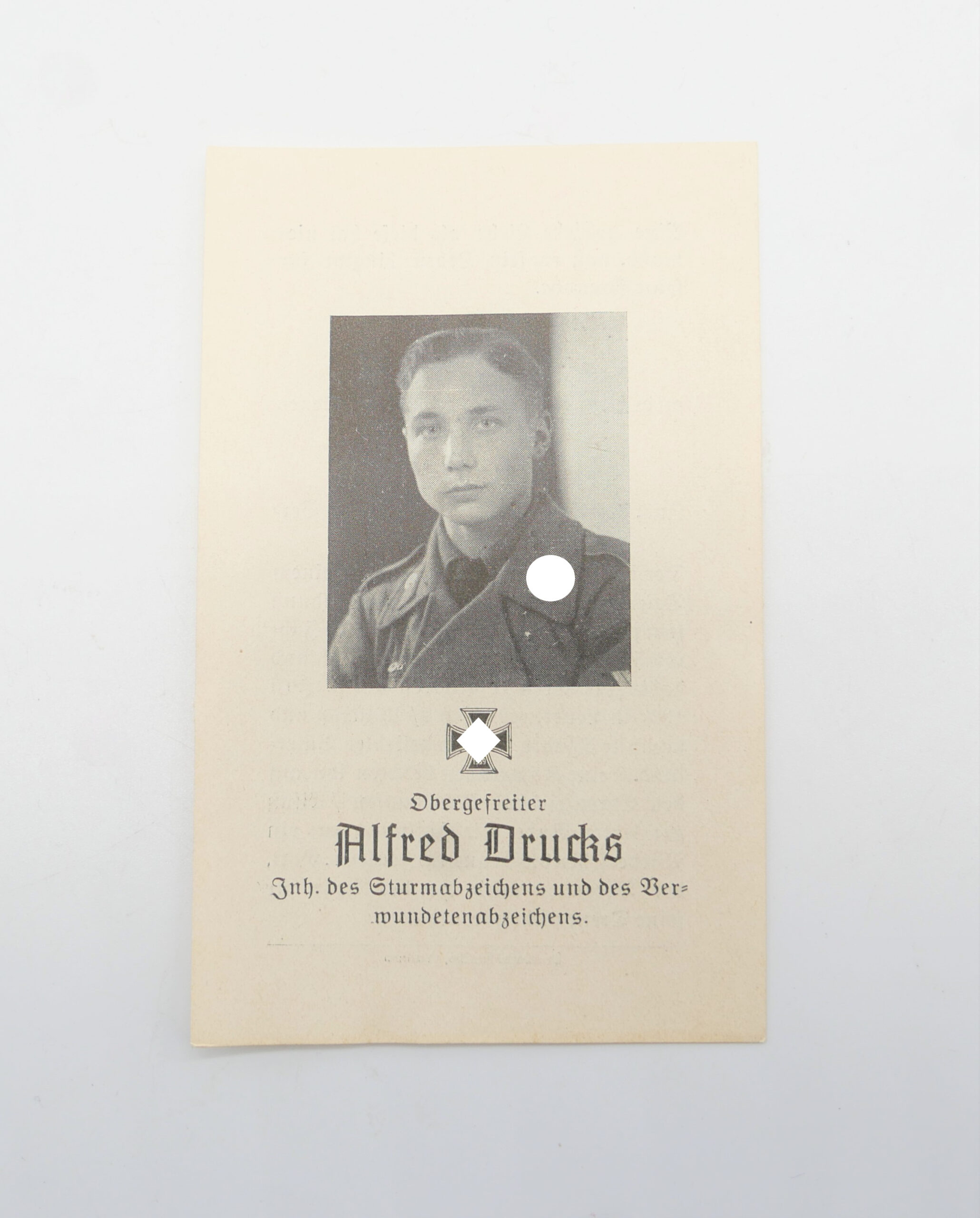Diverse Dokumente des Obergefreiten Alfred Drucks. Papiernachlass der sein trauriges Schicksal dokumentiert. Angefangen bei der DJ als Jungwolf bis zu seinen Sterbebild. Mit dabei drei Mitgliedaausweise der DJ/HJ. Schießbuch, zwei leere Wehrpass Hüllen (eine defekt), zwei Feldpostbriefe, RAD Entlassungsschein, Beteiligungsurkunde Berufswettkampf, VWA Urkunde, ein Foto einer Frau, Lehrbrief, Zeugnisheft, Ahnentafel, Begleitzettel für Verwundete, Sterbebild, etwas Papierkleinkram.