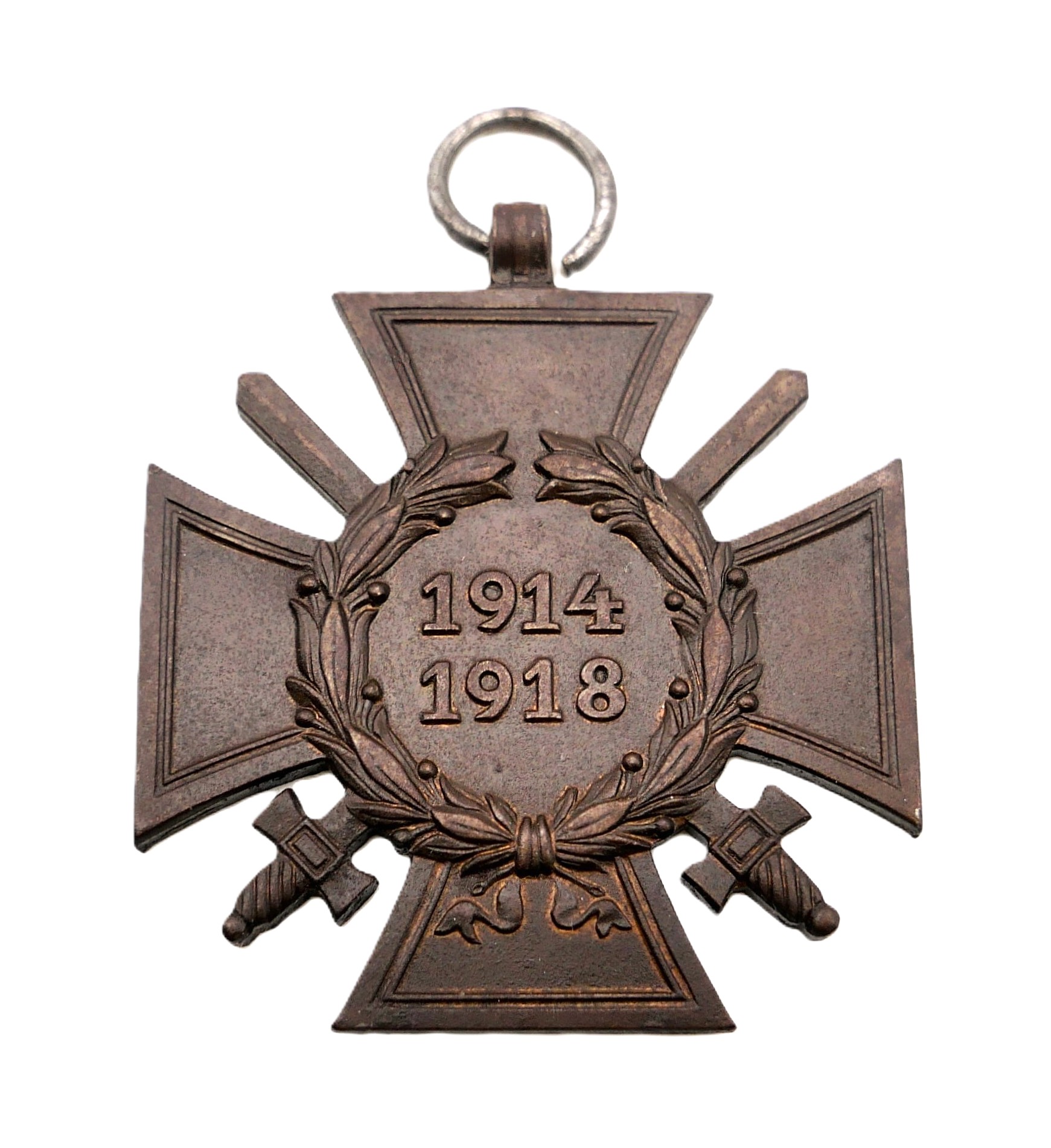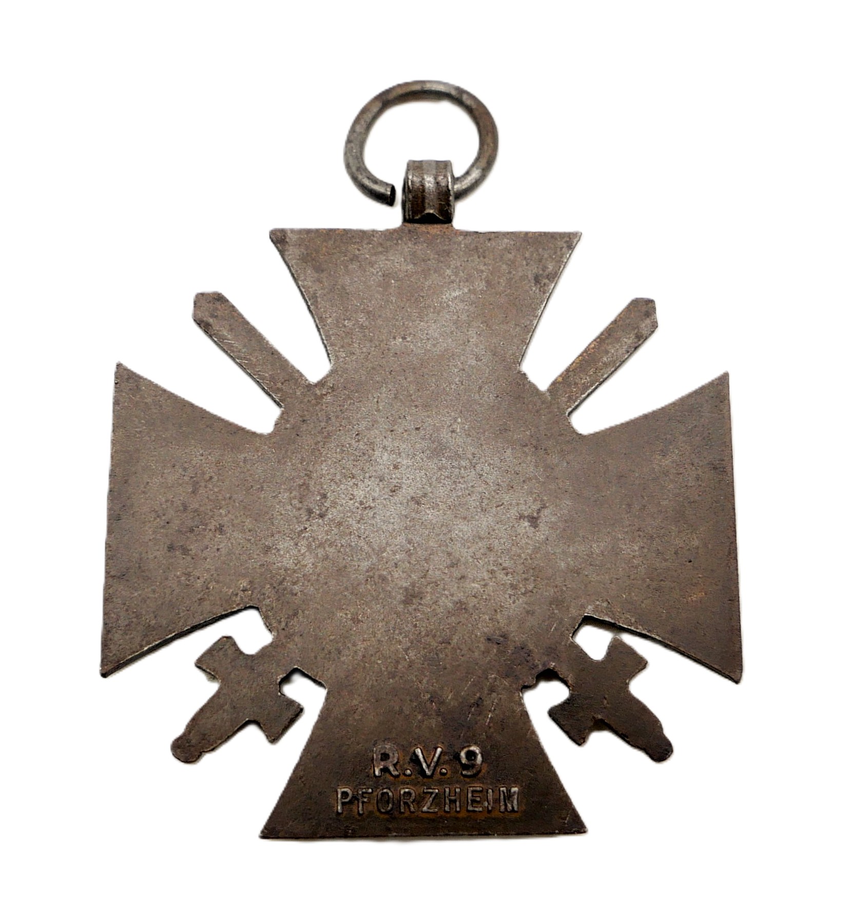 Ehrenkreuz für Frontkämpfer ohne Bandabschnitt. Hersteller R.V. 9, Pforzheim (Reichsverband Arbeitsgemeinschaft Heinrich Vogt, Pforzheim). Magnetisch. Getragener Zustand.