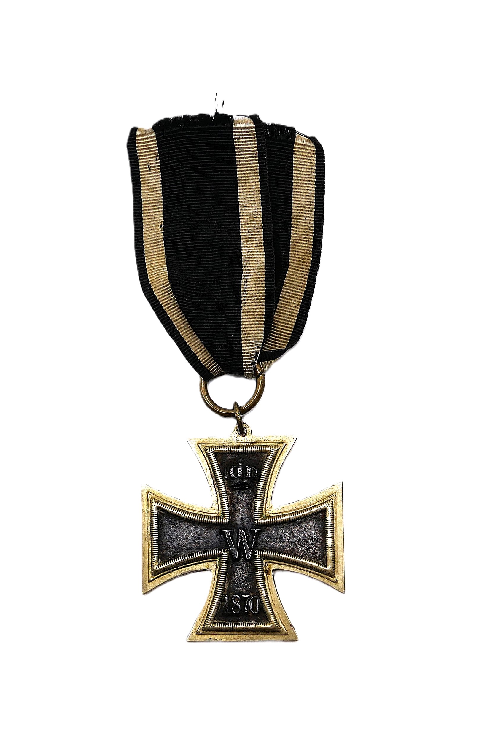 Eisernes Kreuz 2. Klasse 1870 am 11 cm langen Bandabschnitt. Mit Nase wie beim Ritterkreuz. Diese Nasenvariante wurde um 1895 hergestellt. Magnetischer Kern mit etwas Farbverlust. Gewicht 14,5 Gr.