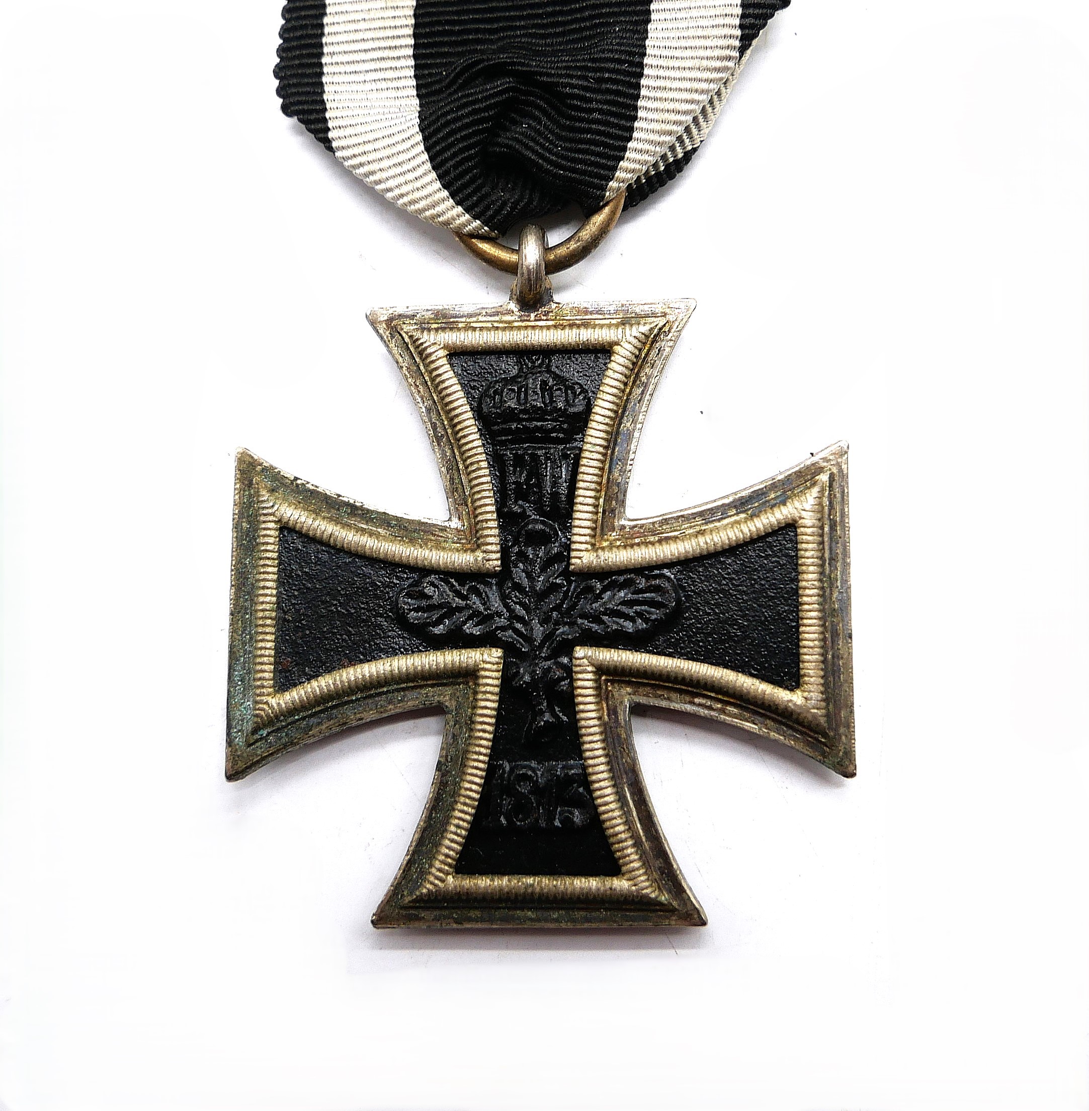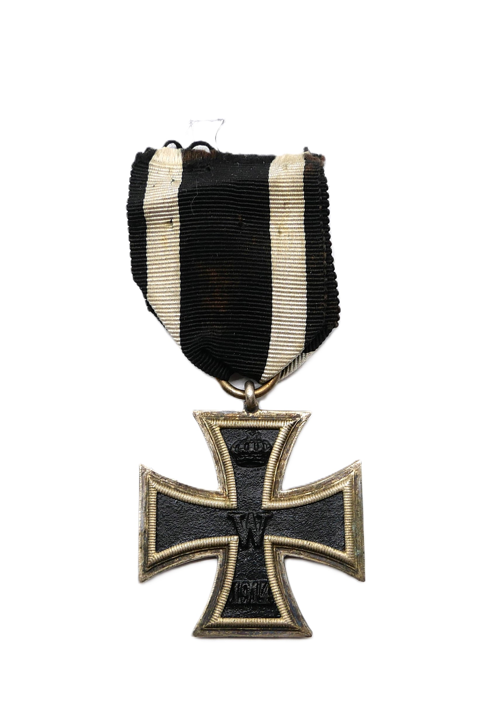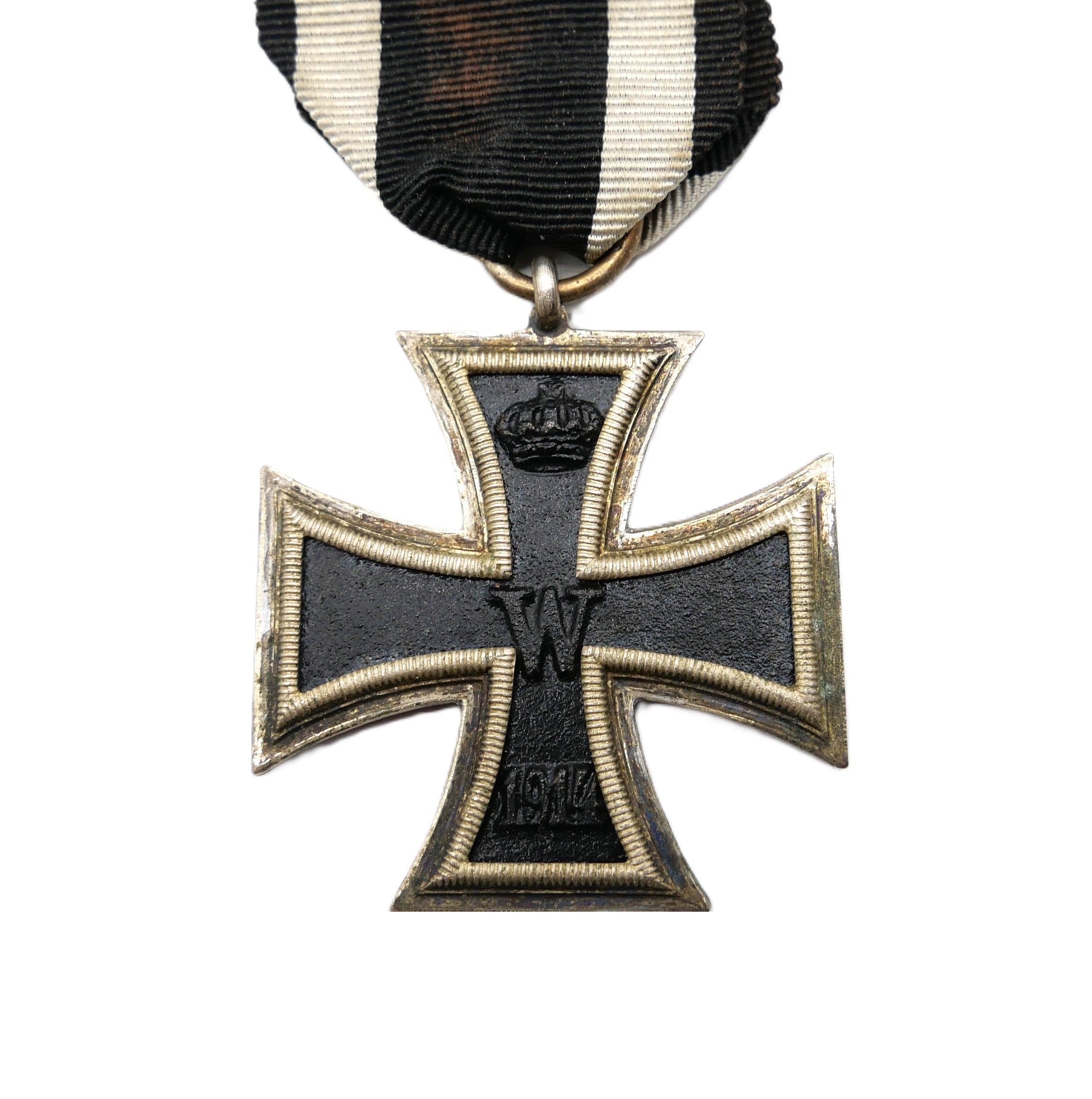 Eisernes Kreuz 2. Klasse 1914 am 8 cm langen Bandabschnitt. Seltene Prinzengröße ohne Hersteller. Masse 34,5 mm x 35 mm. Dreiteilig mit magnetischen Kern. Gewicht 9 Gramm.