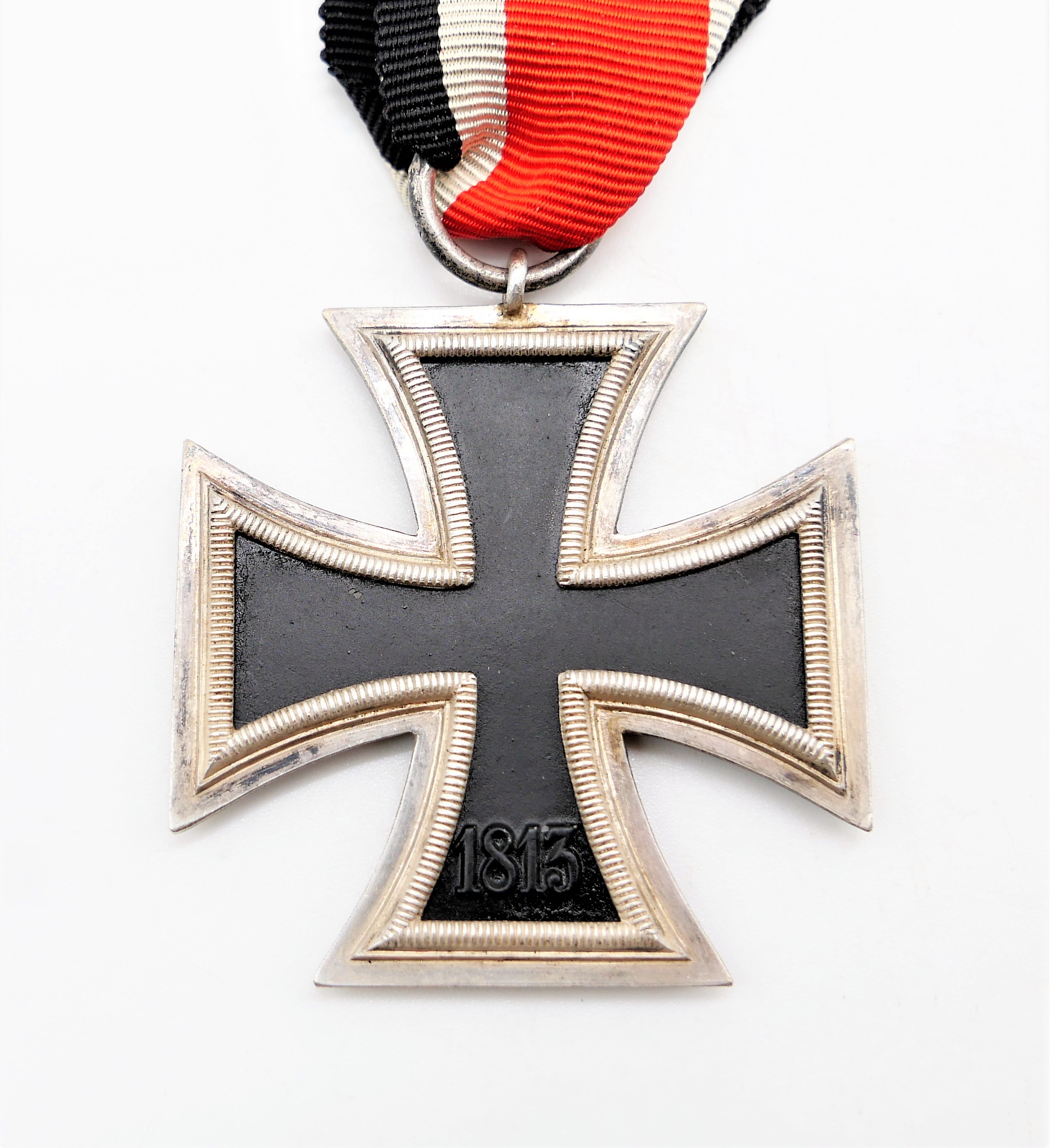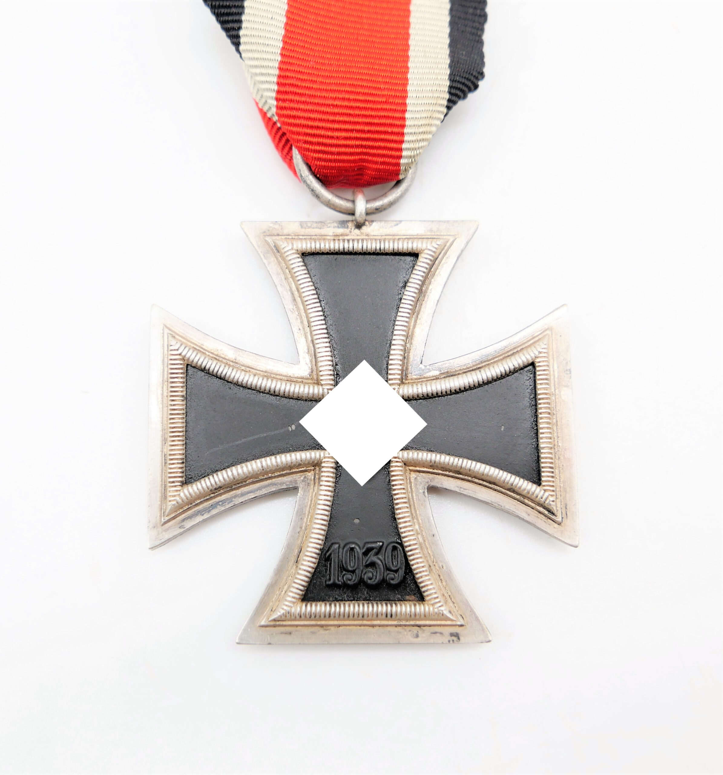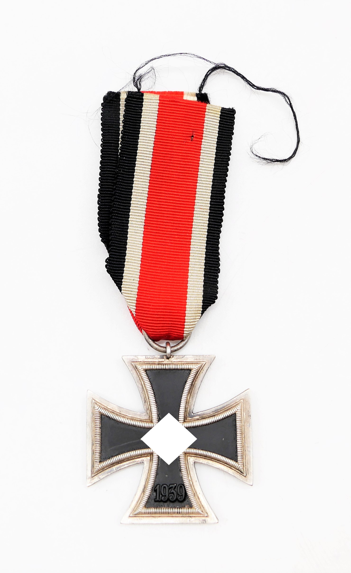Eisernes Kreuz 2. Klasse 1939 am 14 cm langen Bandabschnitt. Ohne Hersteller. Magnetischer Kern mit fast vollständiger Kernschwärze. HK hat einen Abplatzer. Gewicht 21,1 Gramm.