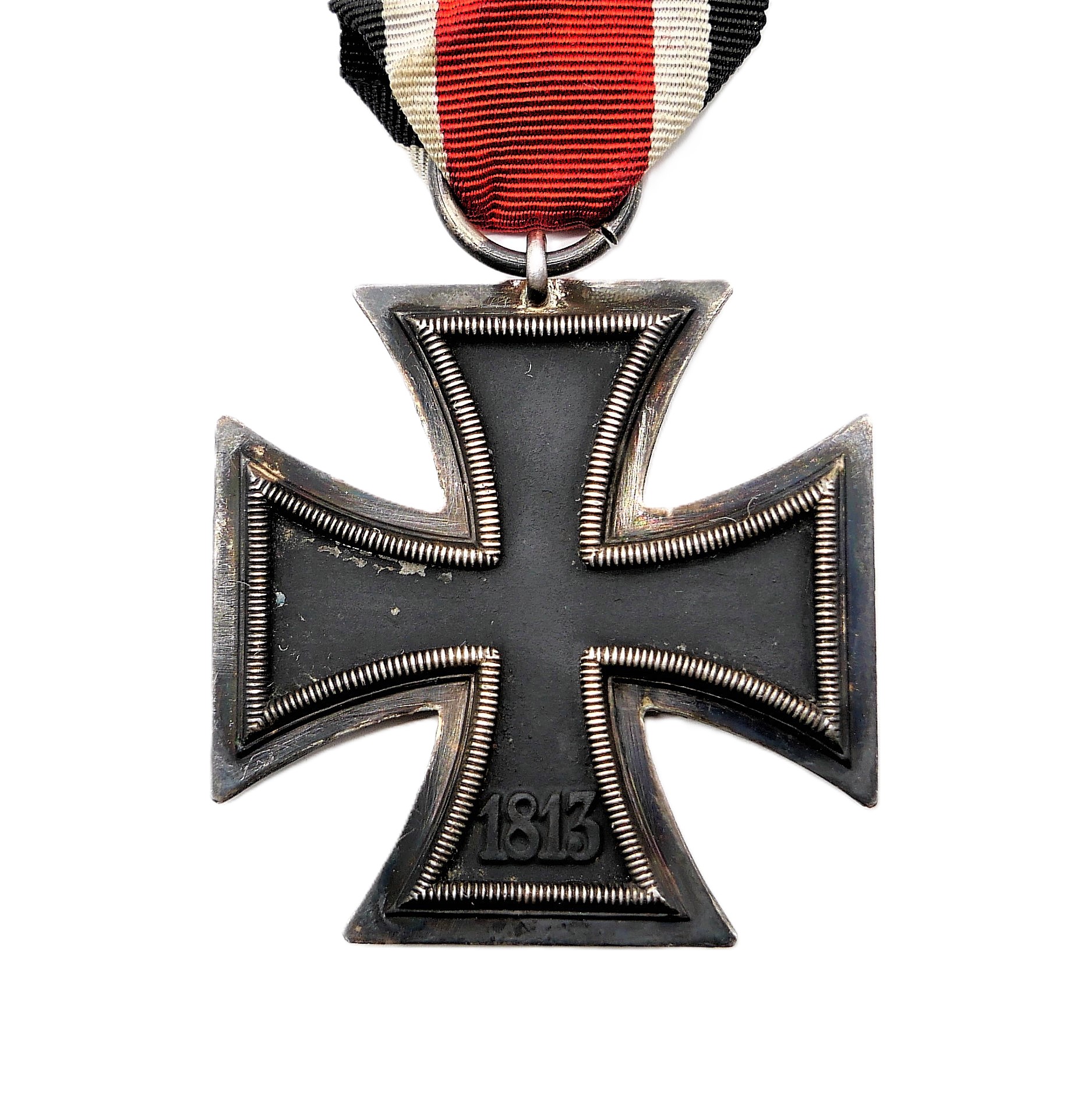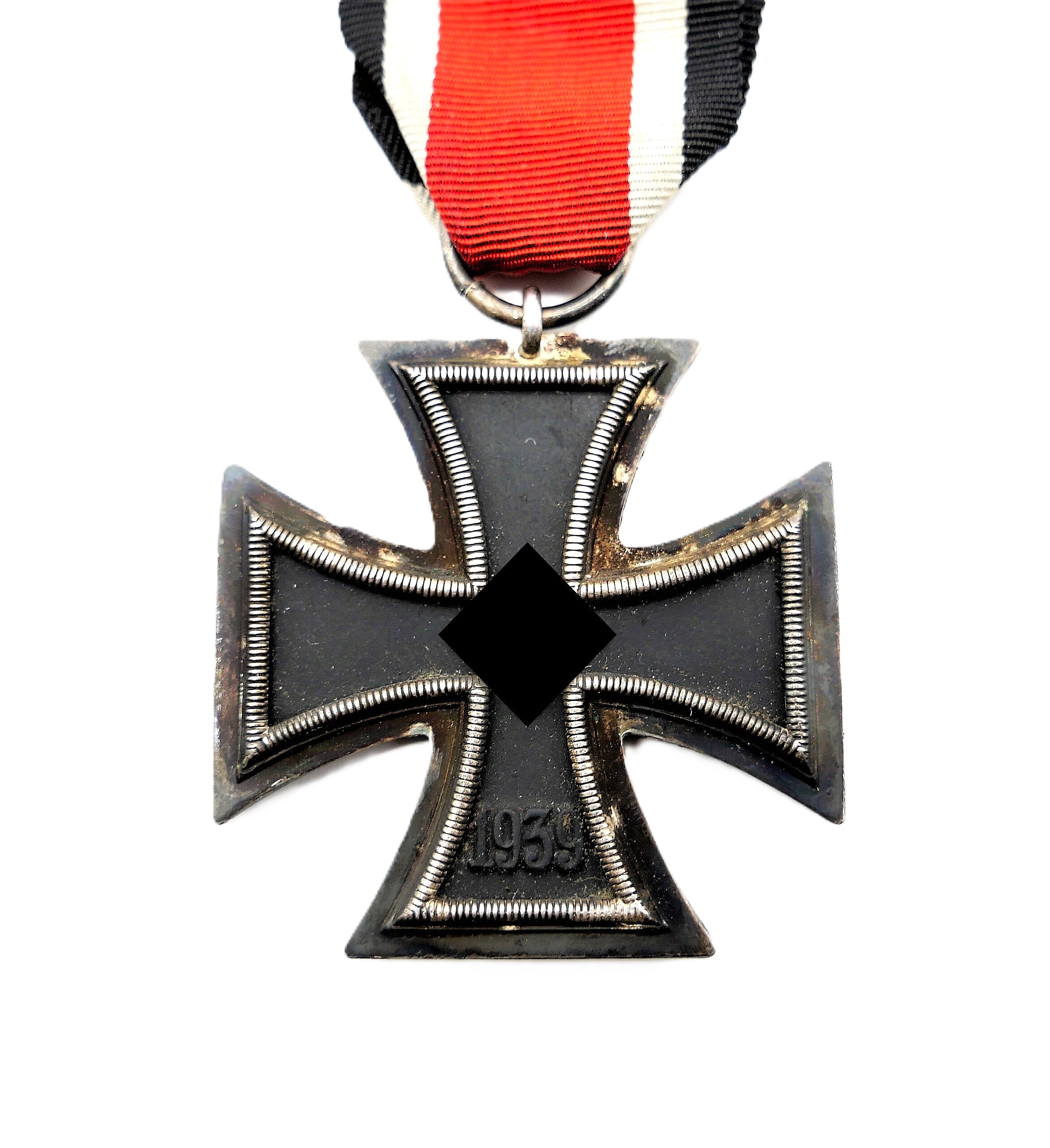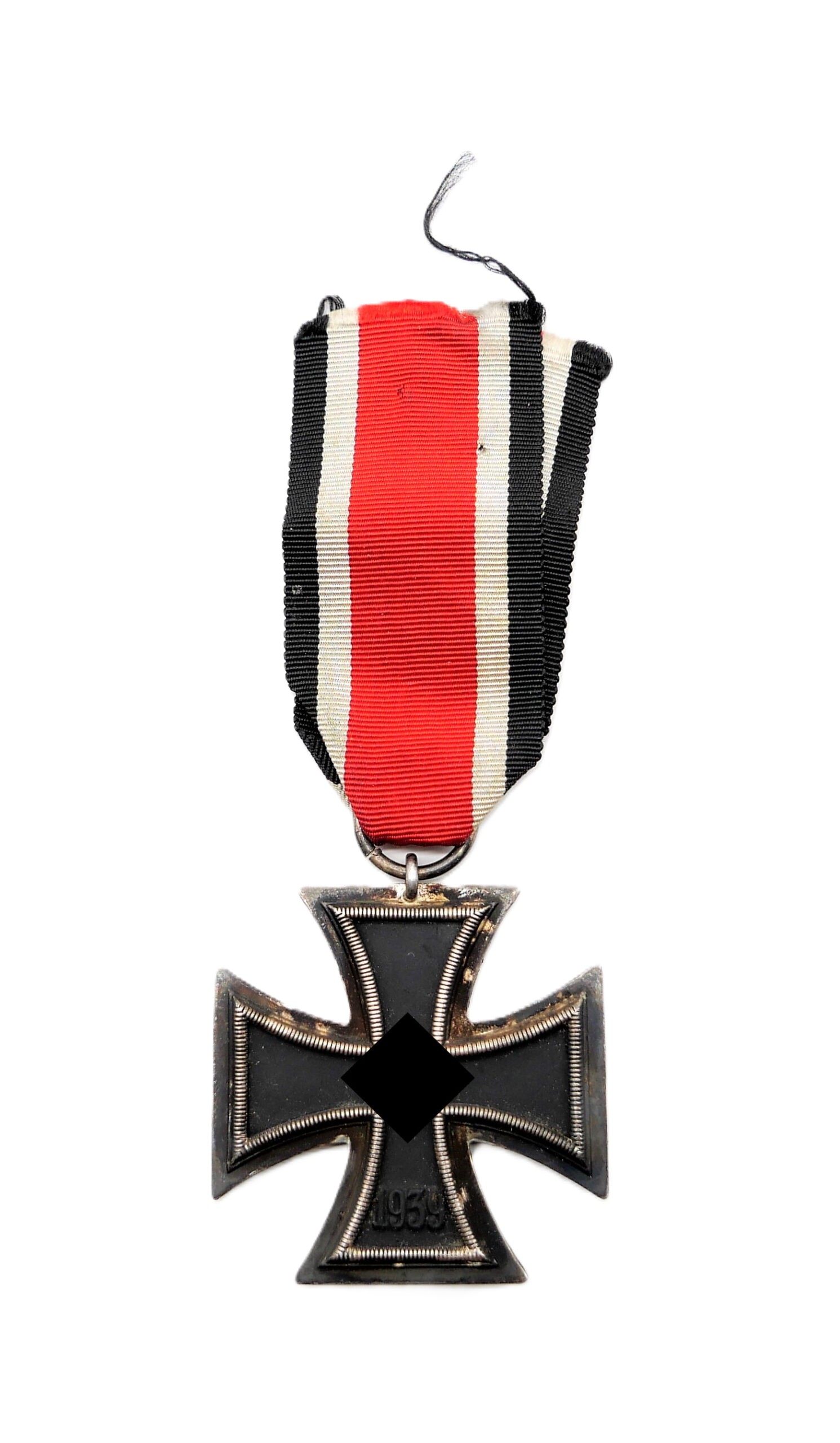 Eisernes Kreuz 2. Klasse 1939 am 13 cm langen Bandabschnitt. Ohne Hersteller. Mattschwarzer, magnetischer Kern mit fast voller Kernschwärze. Kleinere Fehlstellen auf der Rückseite. HK mit 95 % Farbe. Gewicht 18,3 Gramm.