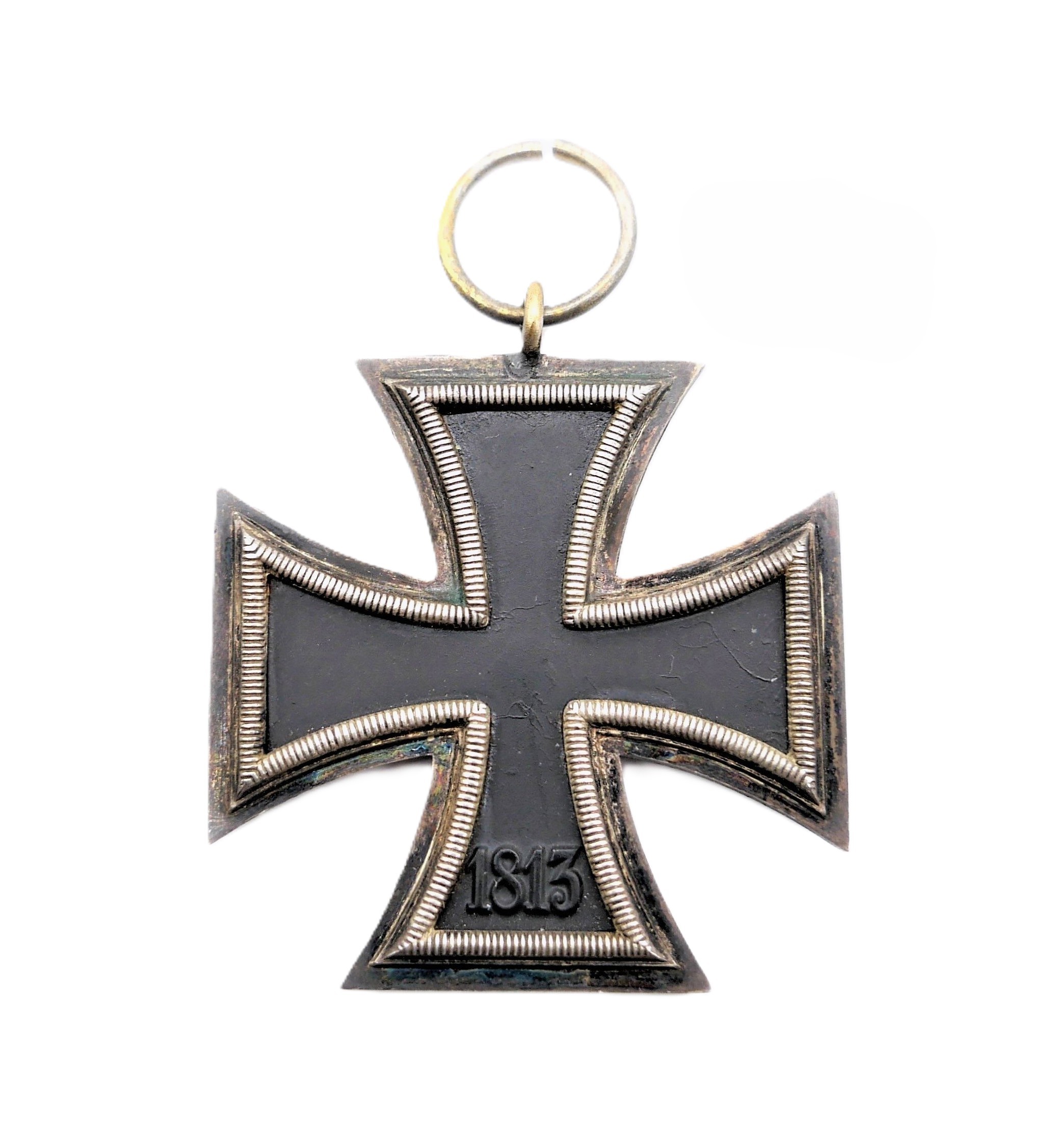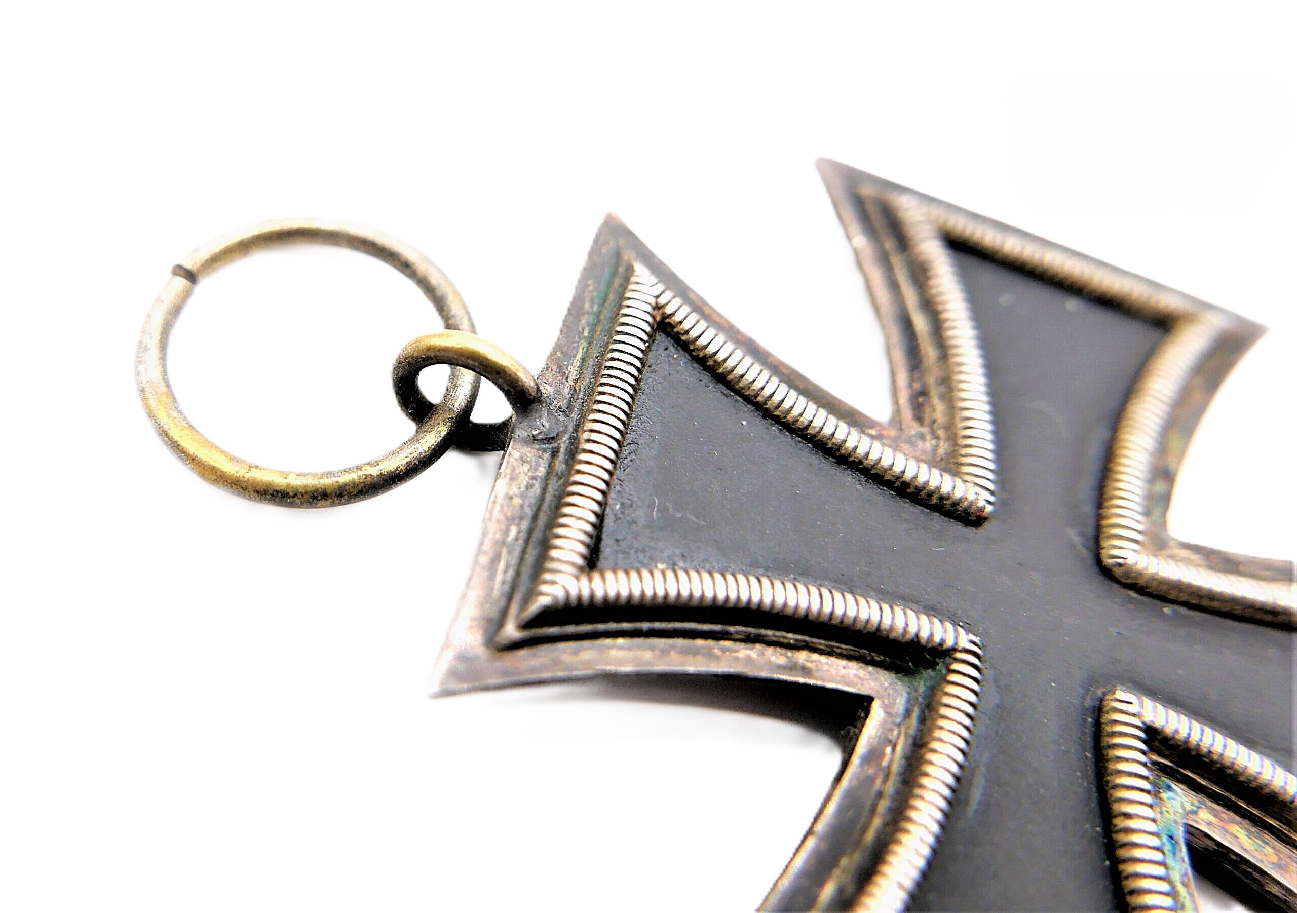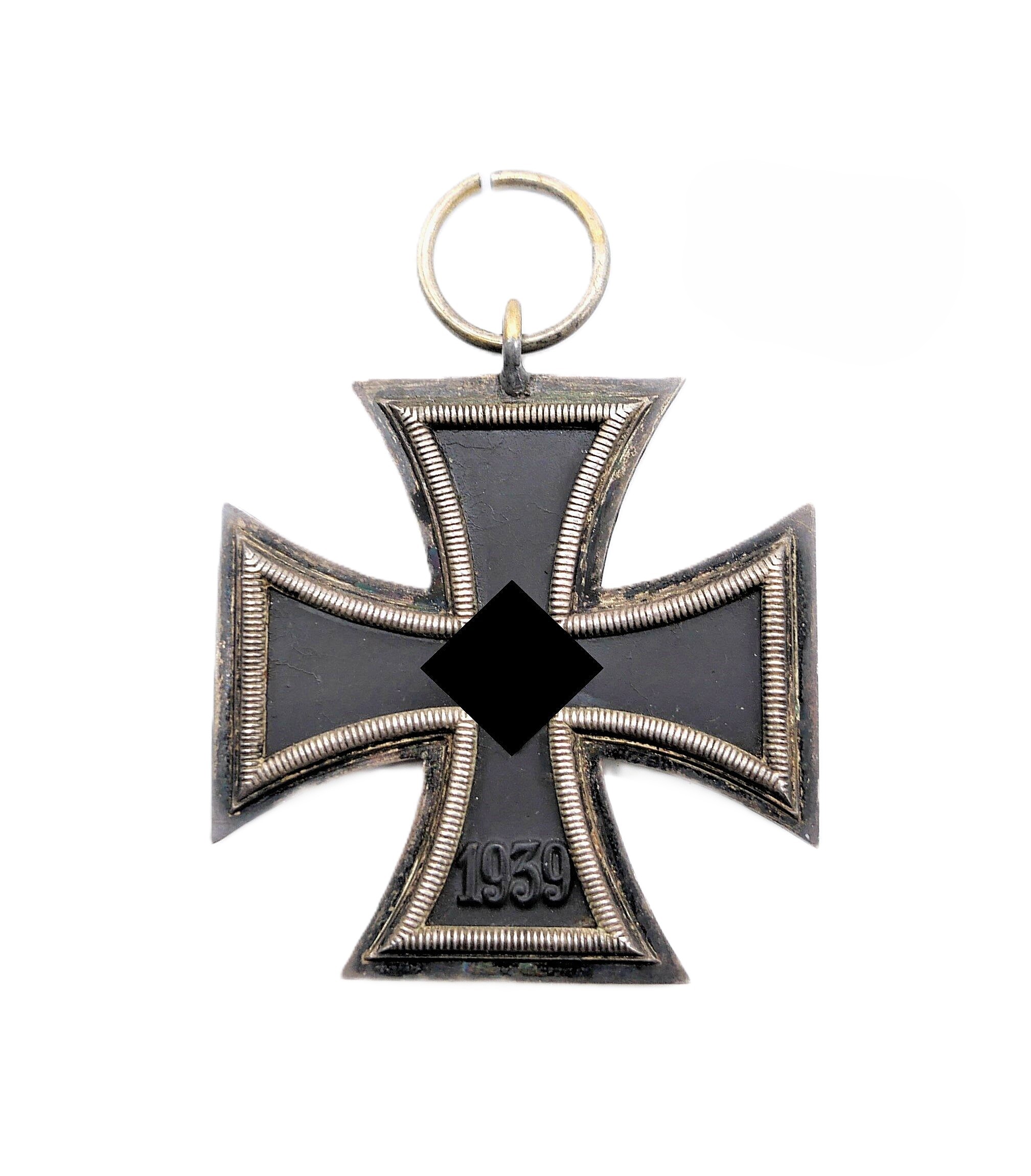 Eisernes Kreuz 2. Klasse 1939 ohne Bandabschnitt. Ohne Hersteller. Mattschwarzer, magnetischer Kern mit fast voller Kernschwärze. Ring wurde mal ersetzt und die Öse wohl mal etwas nachgelötet. HK mit 95 % Farbe. Gewicht 20,1 Gramm.