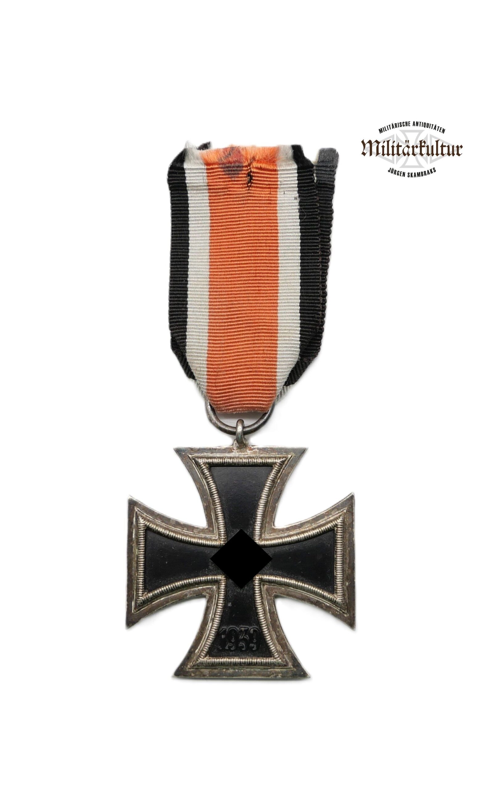 Eisernes Kreuz 2. Klasse 1939 am 11 cm langen Bandabschnitt. Ohne Punze. Wird aber dem Hersteller 100 (Rudolf Wächtler & Lange, Mittweida) zugesprochen. Das HK mit 60 % Restfarbe. Magnetischer Kern. Gewicht 20,4 Gramm.