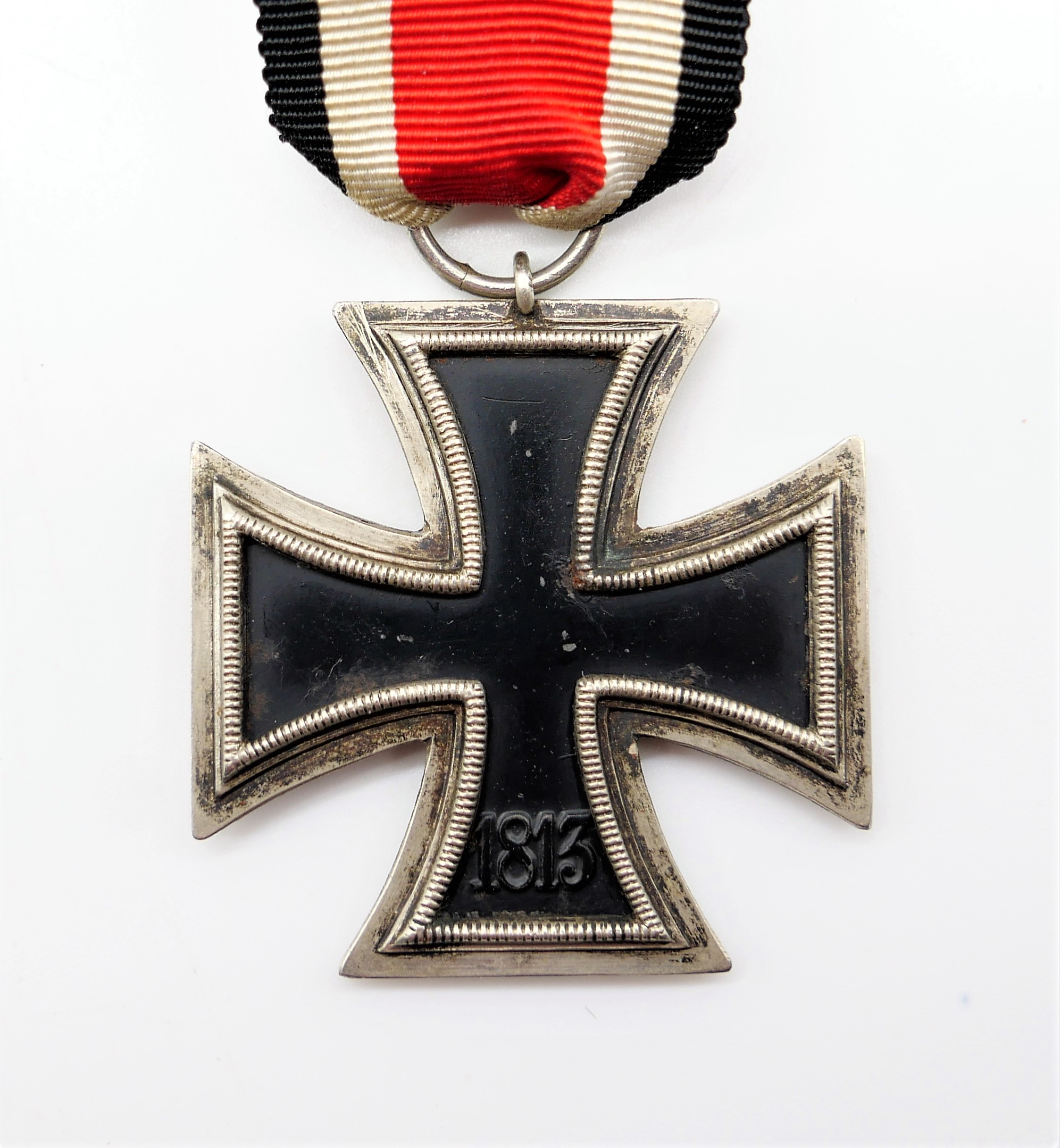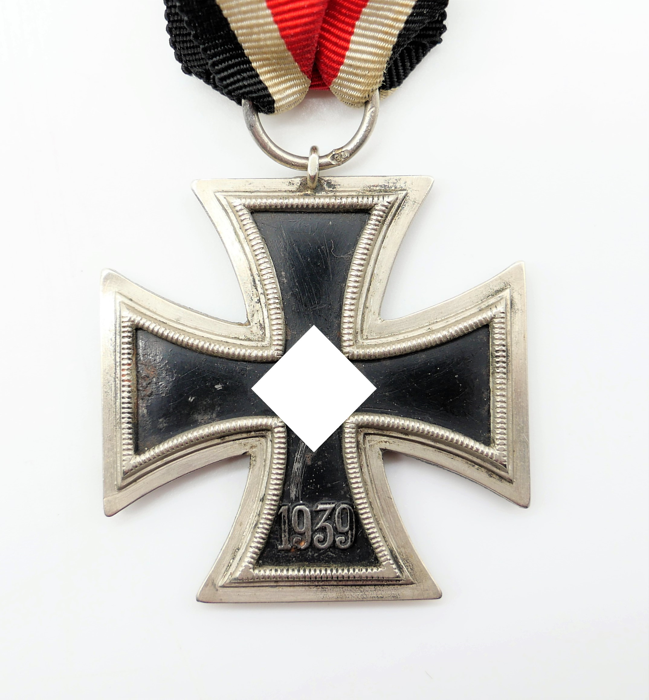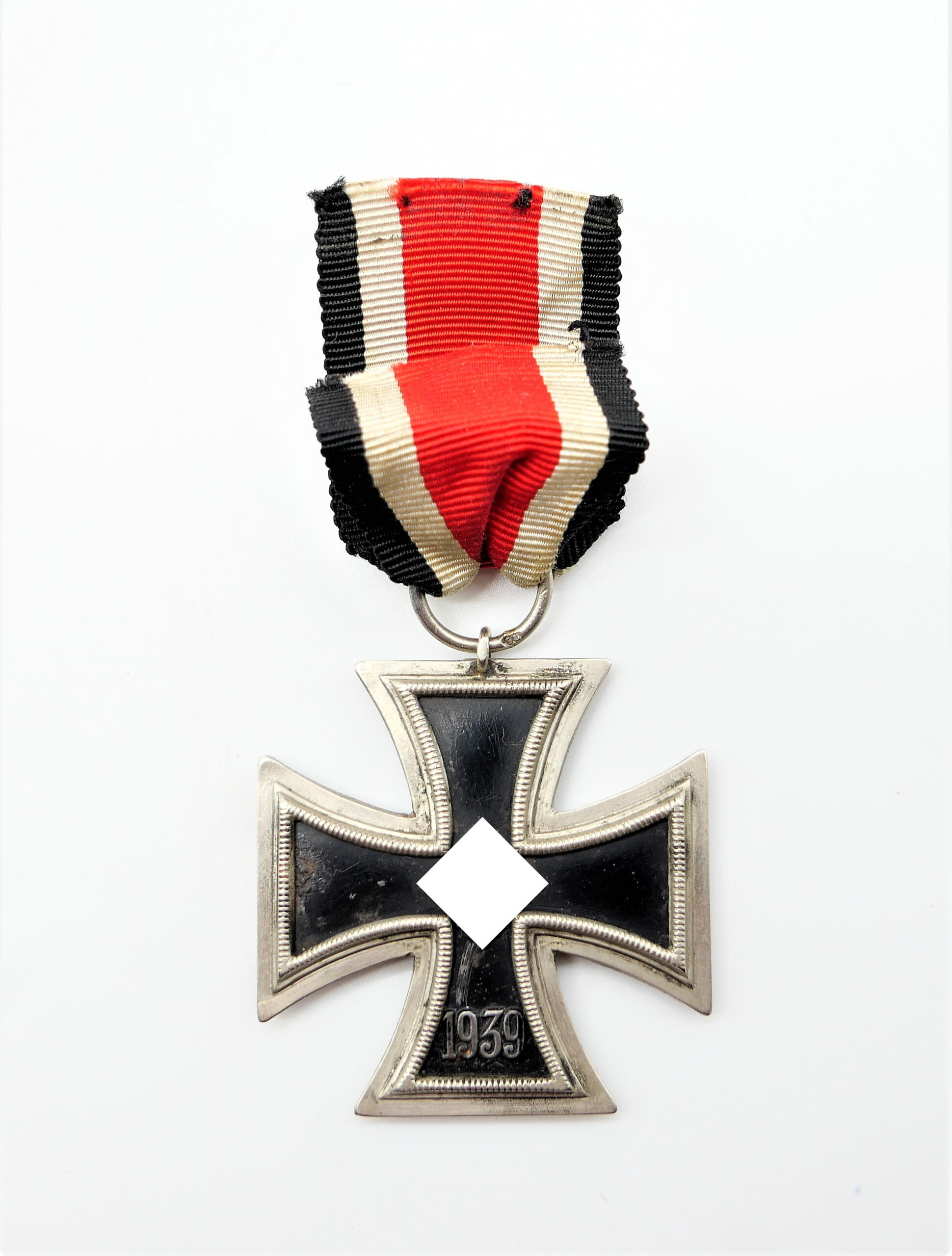Eisernes Kreuz 2. Klasse 1939 am 7 cm langen Bandabschnitt. Mit Punze 75 eines bisher unbekannten Herstellers. Magnetischer Kern. Kernschwärze mit Fehl- und Roststellen. HK ohne Farbe. Riffelung des Rahmen teilweise glatt gerieben. Schöner gelebter Zustand eines mittlerweile selten gewordenen Herstellers. Gewicht 20,8 Gramm.