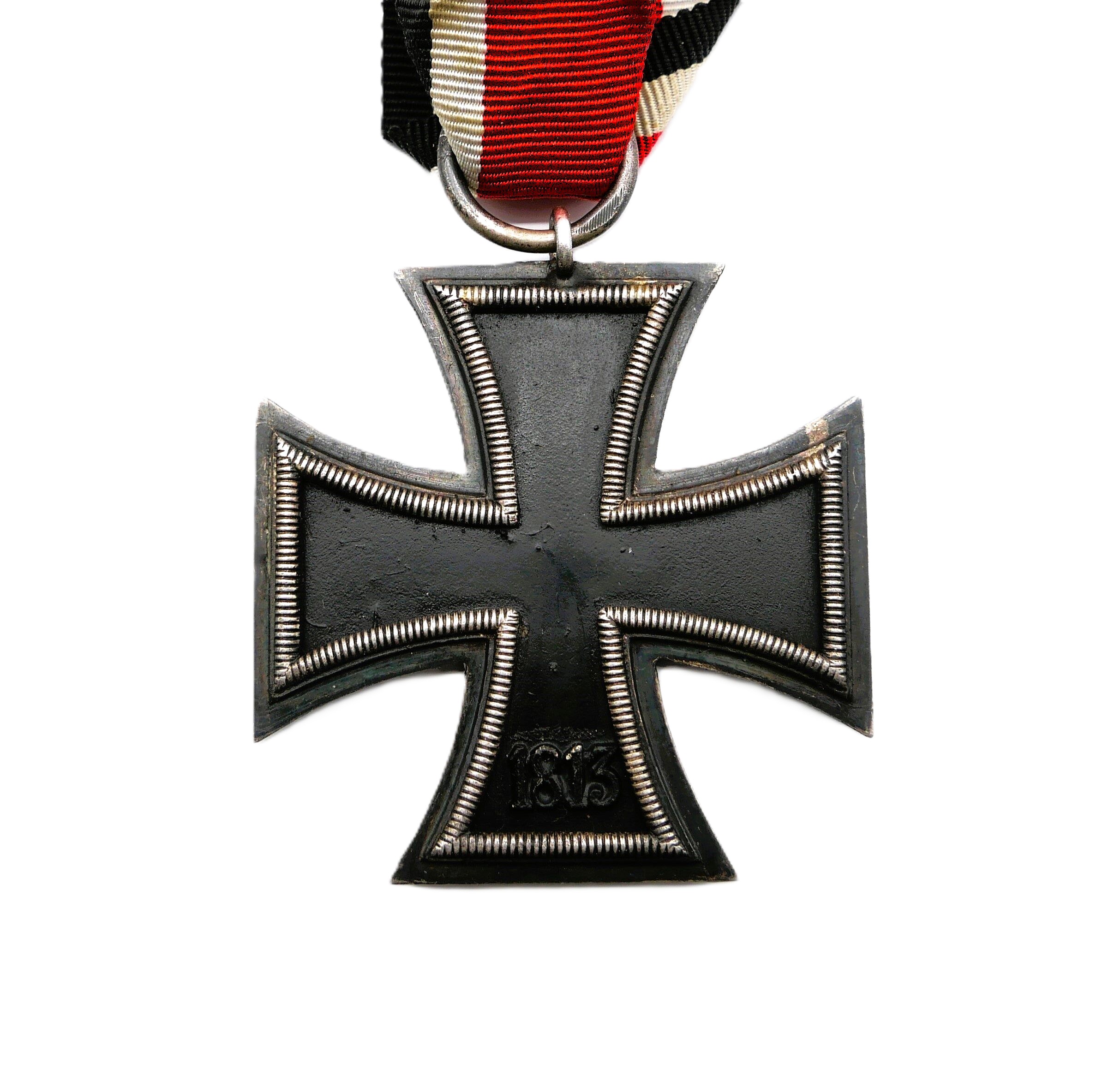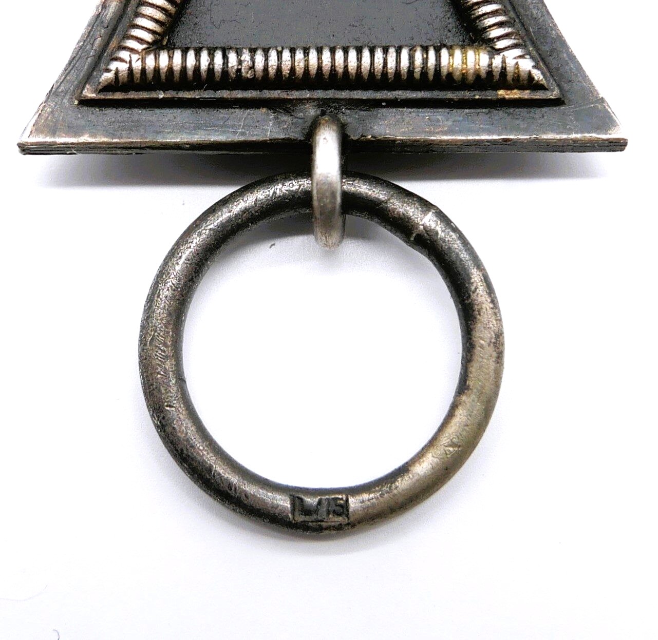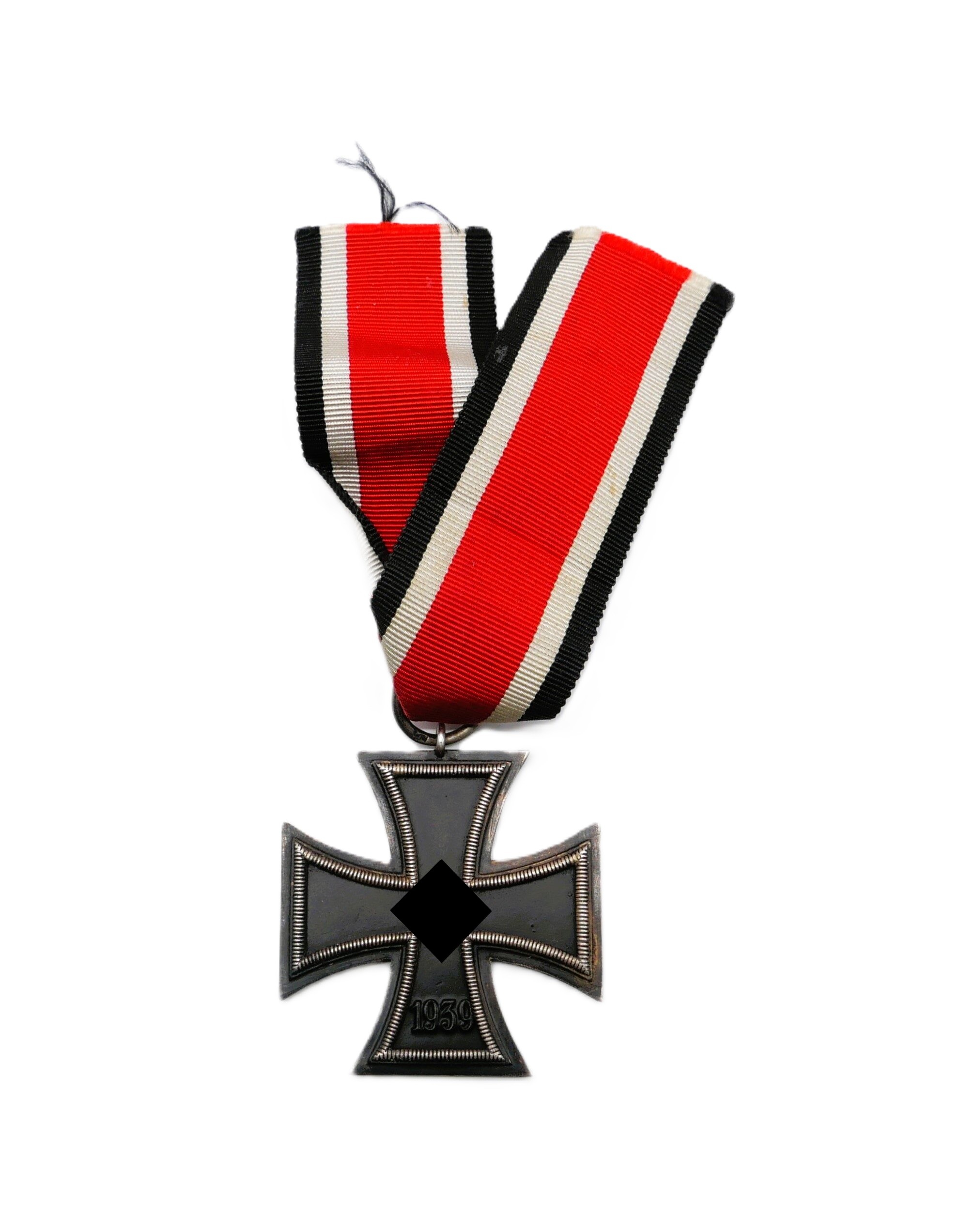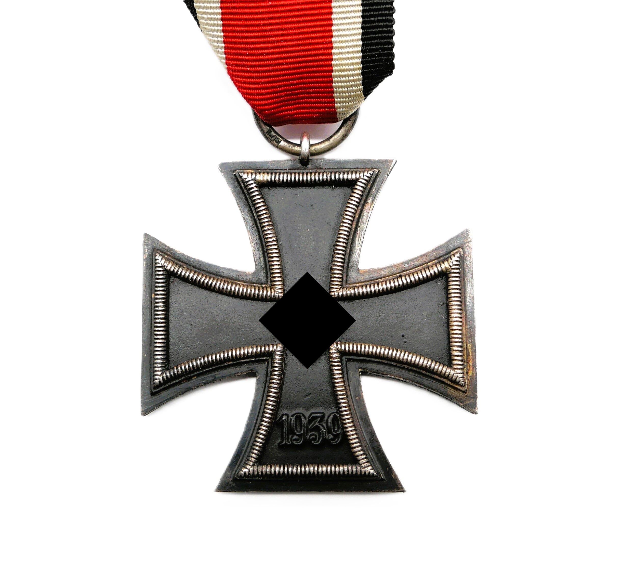 Eisernes Kreuz 2. Klasse 1939 am 16,5 cm langen Bandabschnitt. Dieser wurde mal ergänzt. Hersteller L/15 (Otto Schickle, Pforzheim). Nicht magnetischer Kern, mit fast voller Schwärze. Gewicht 18,8 Gramm. Sehr seltenes EK.