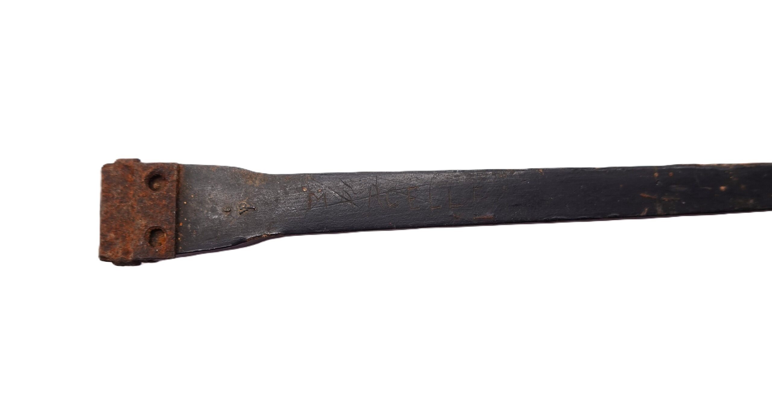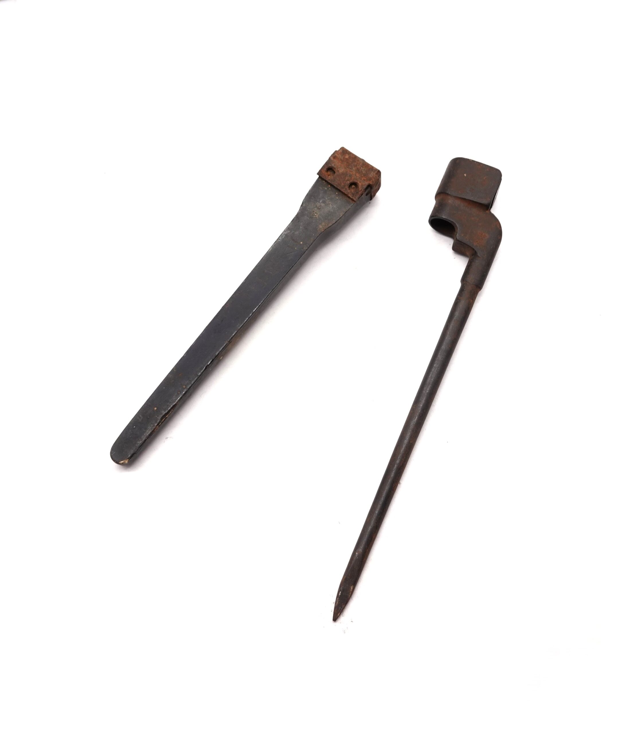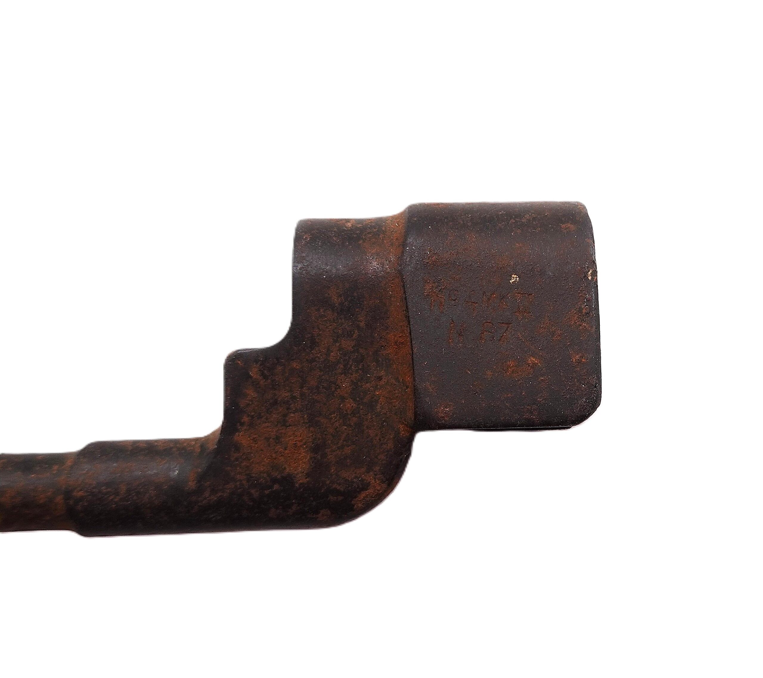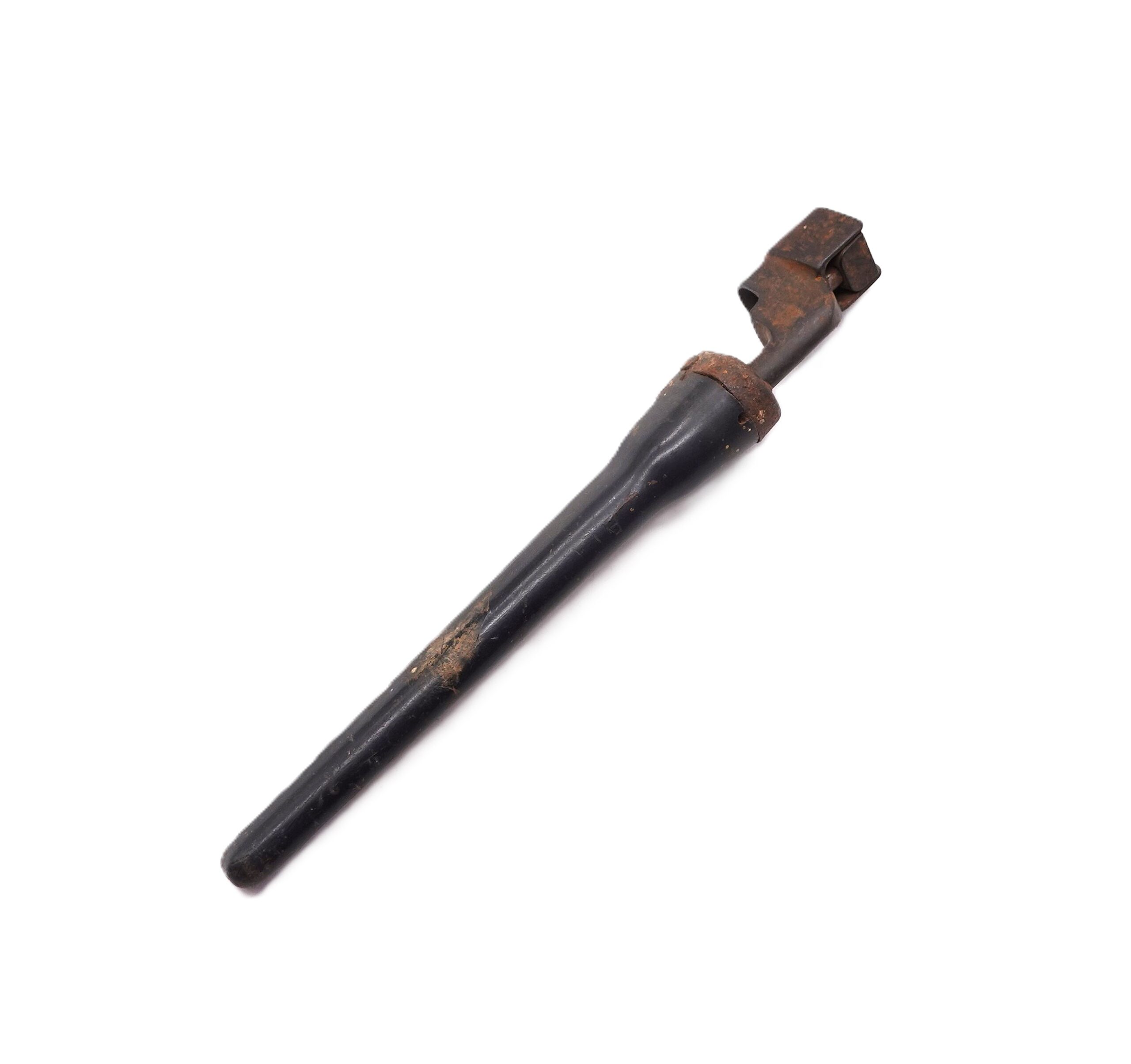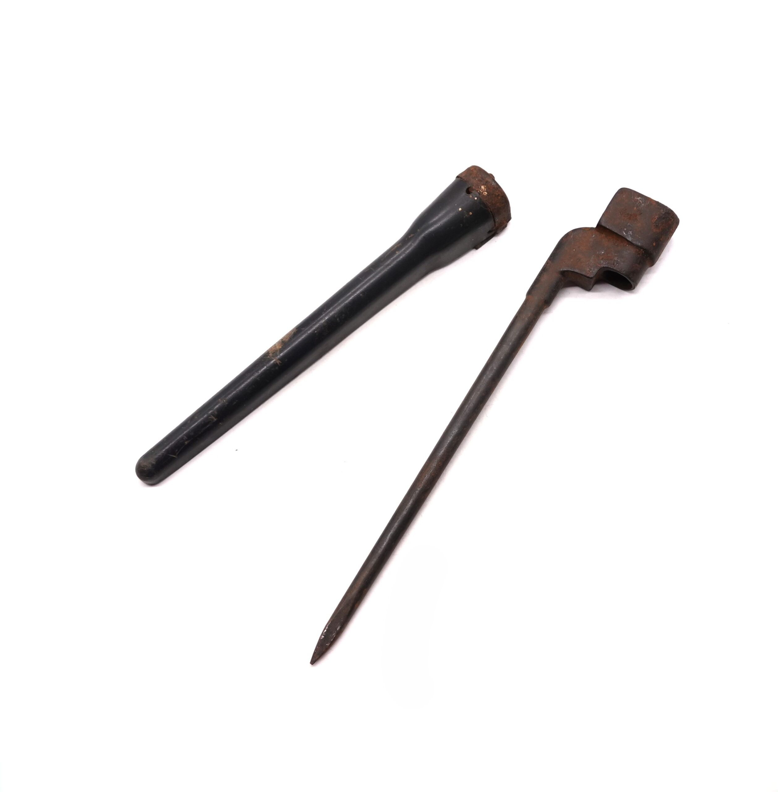 England – Britisches Spike Bajonett No 4 MK II – Singer Manufacturing No 67 mit US Victory Scheide aus Kunststoff. Für das Lee-Enfield Gewehr. Ein Dachbodenfund zum Aufarbeiten oder als Ersatzteilträger. Auf der Rückseite der Scheide ist der Name MARCELLE eingeritzt. Öse an der Scheide fehlt.