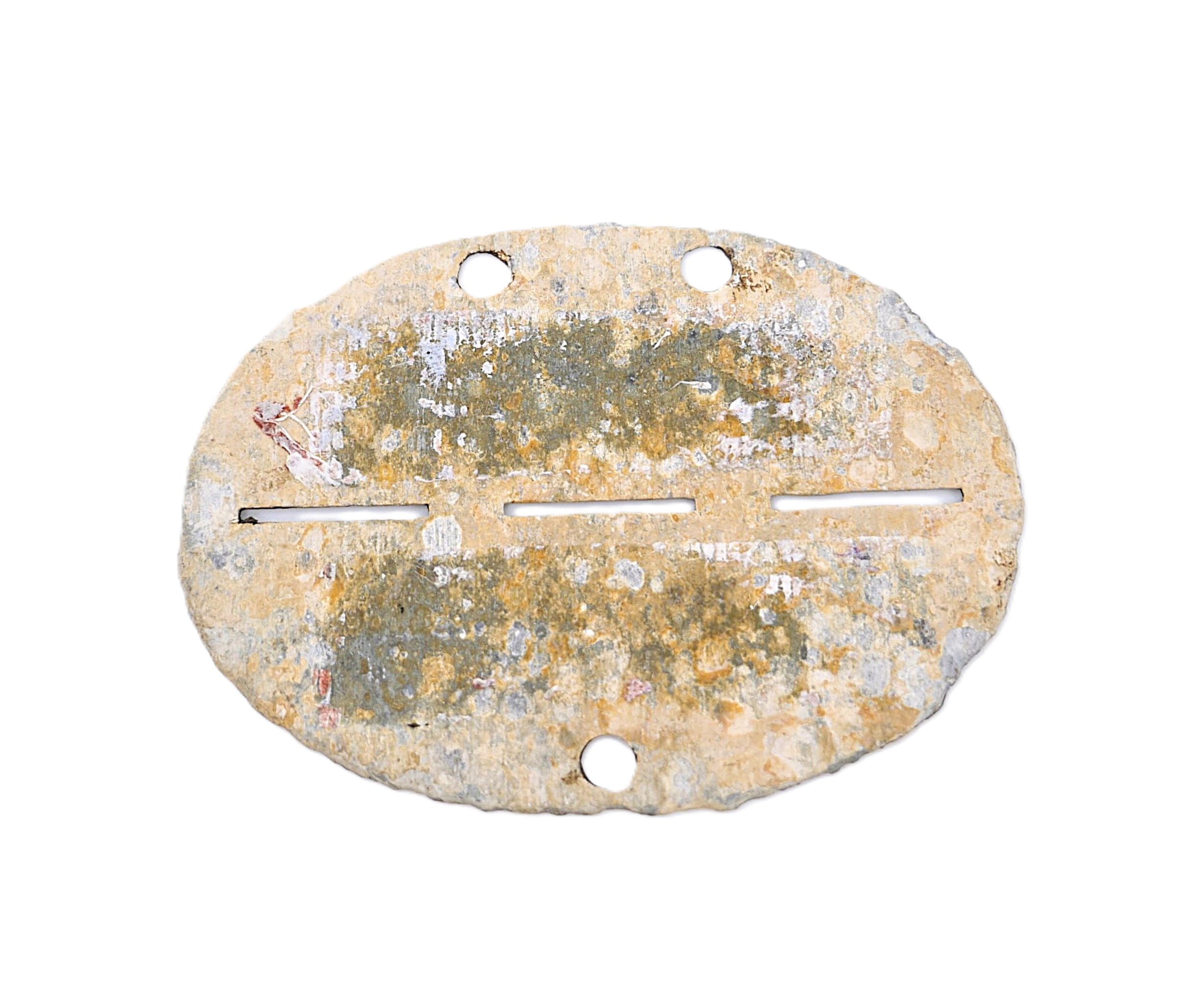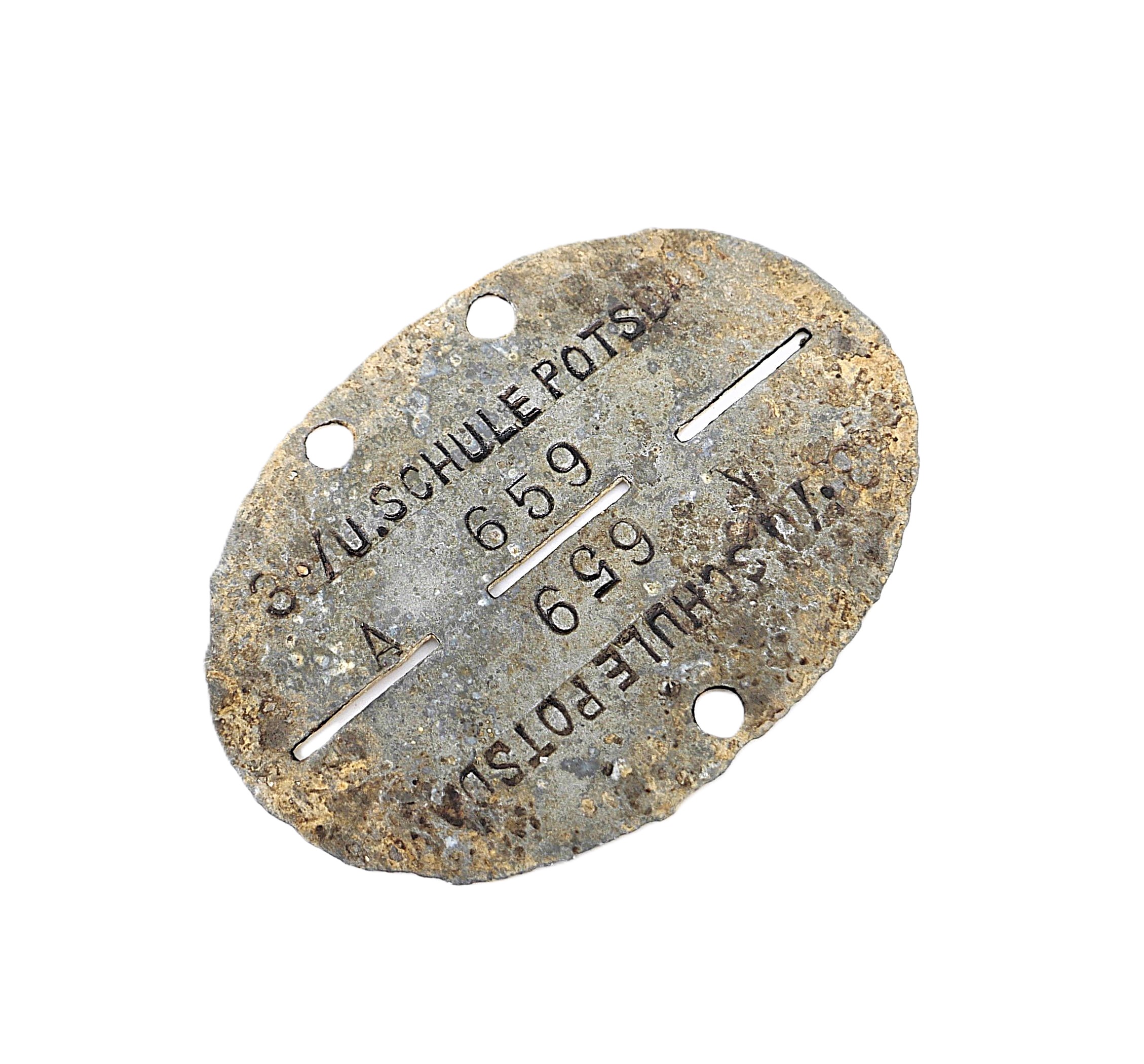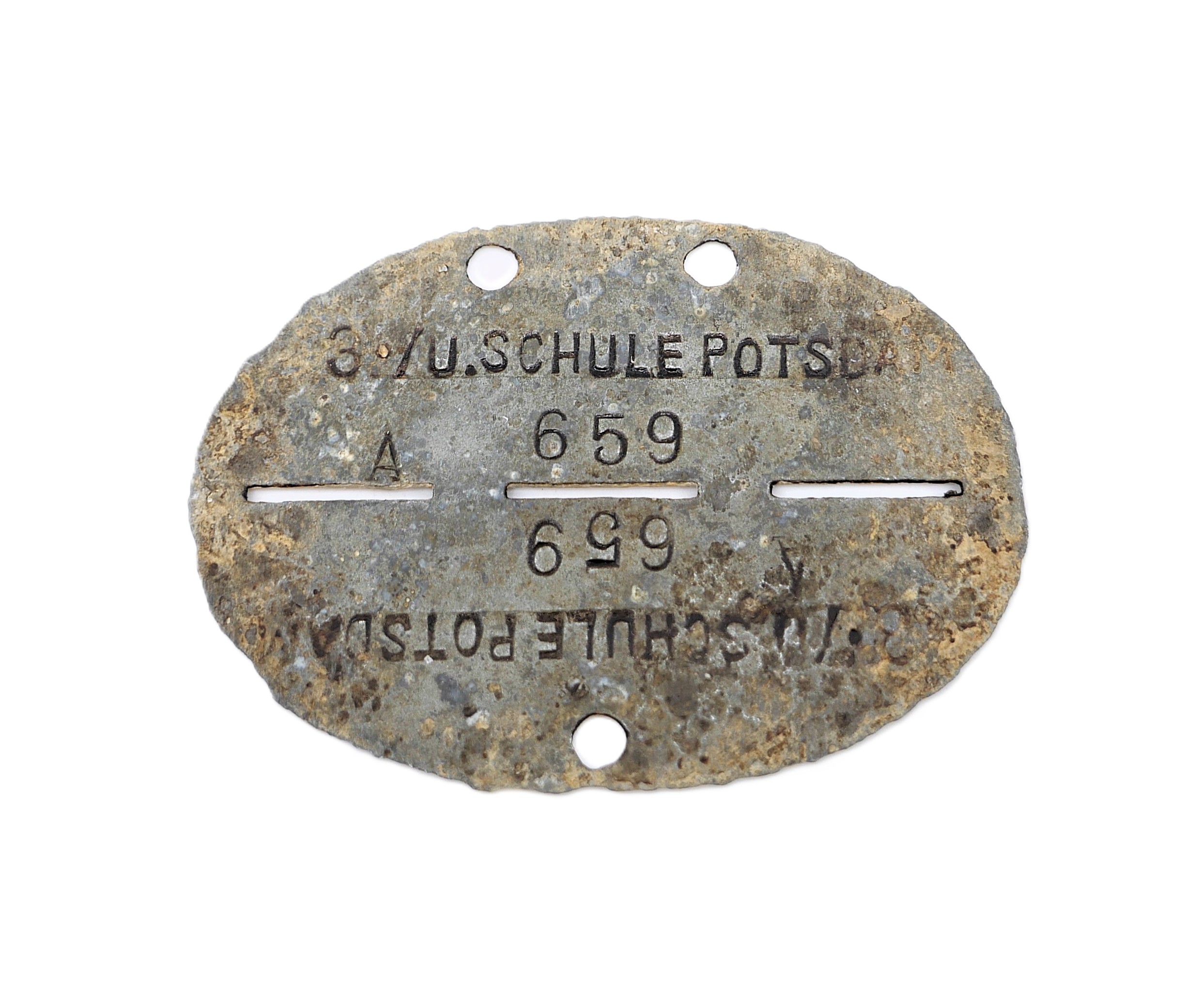Erkennungsmarke – 3./U. Schule Potsdam. Bodenfund. Rückseitig mit Kleberesten. War wohl mal irgenwo aufgeklebt.