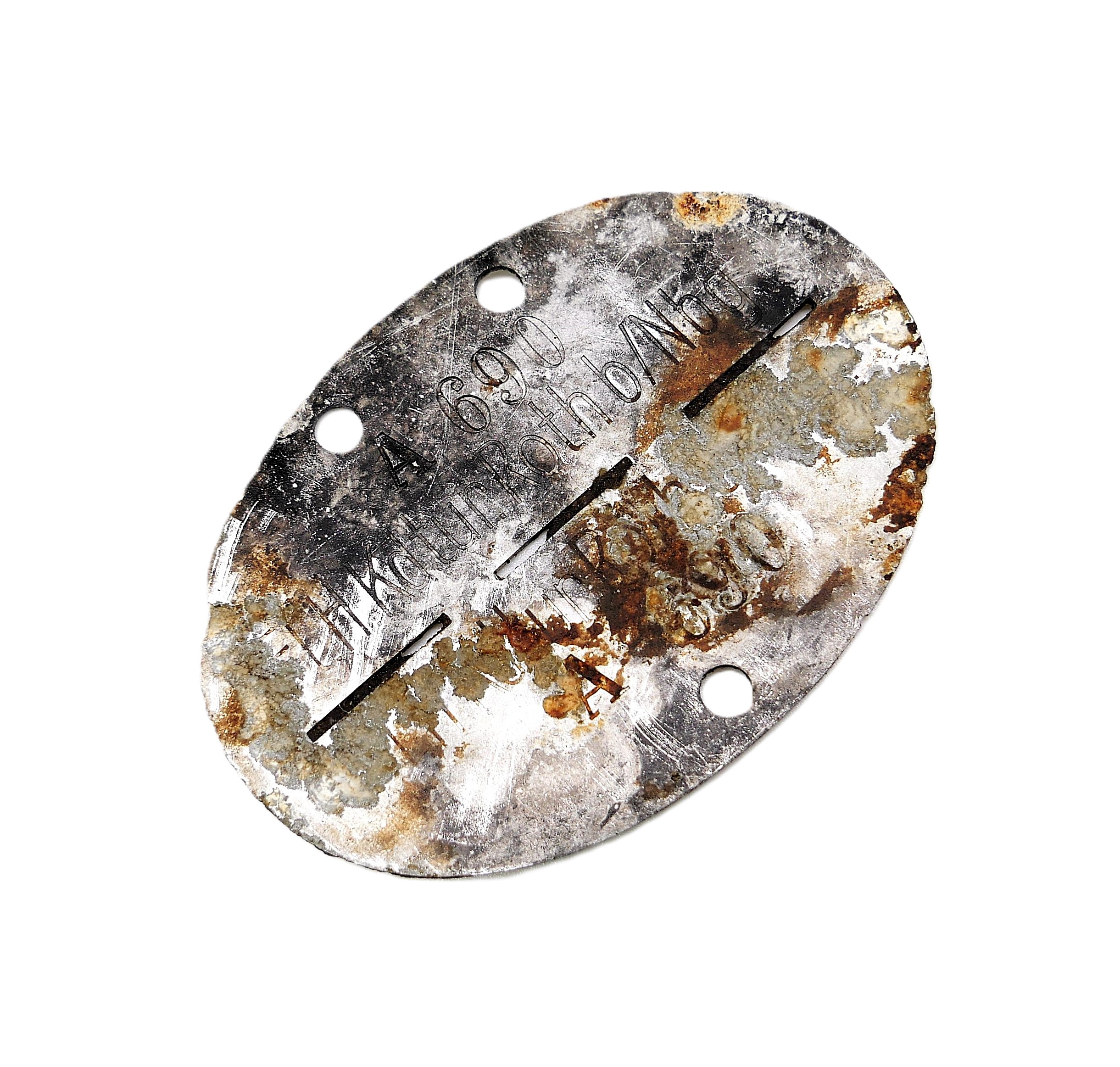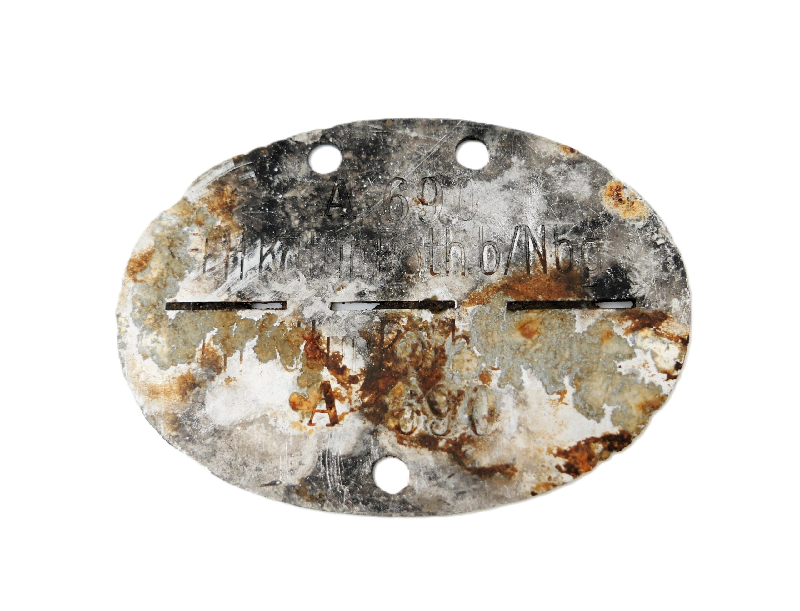 Erkennungsmarke – A 690 F.L.H. Kdtur. Roth b/Nbg.Bodenfund.