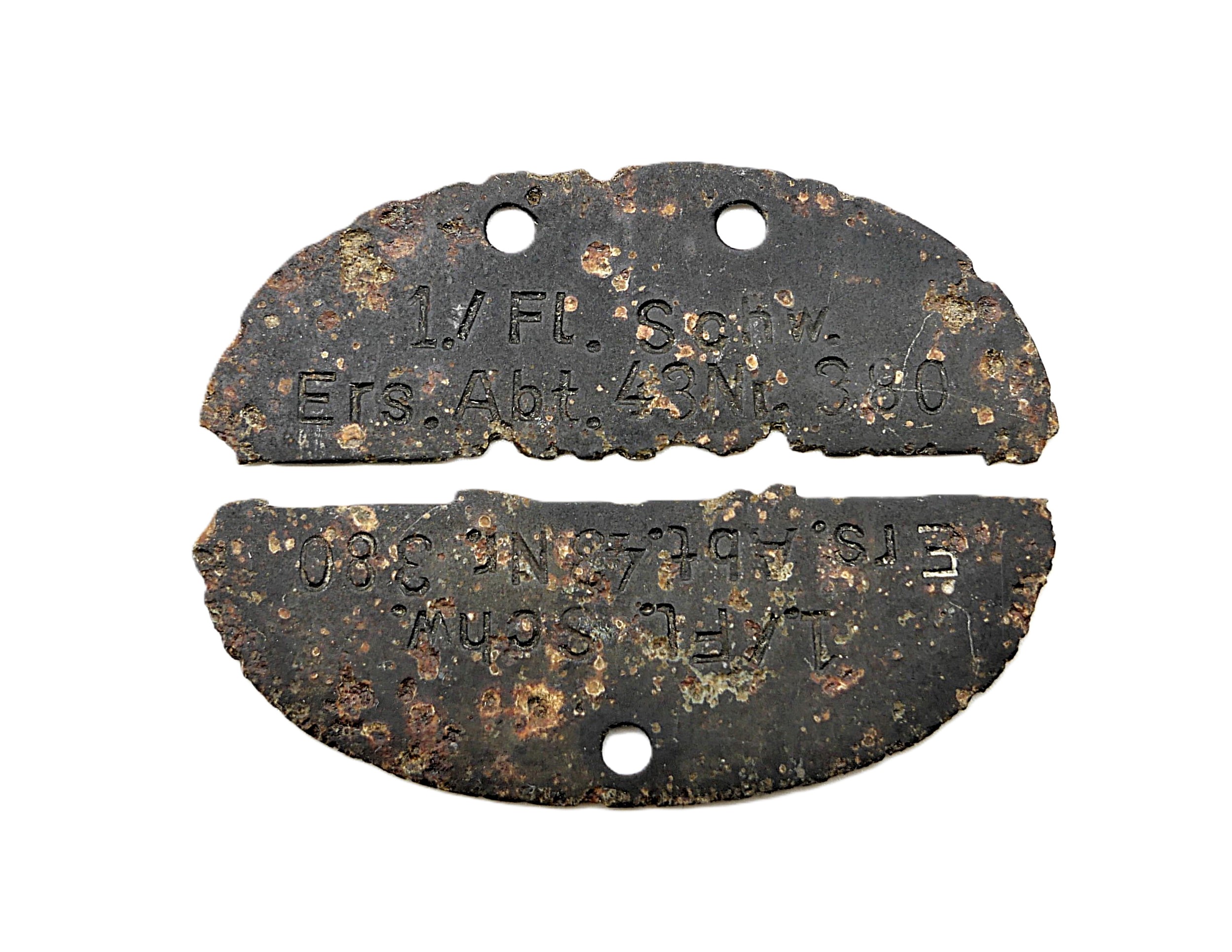 Erkennungsmarke – I. /Fl. Schw. Ers. Abt. 43 Nr. 380. Marke ist in zwei Hälften zerbrochen. Schöner Bodenfund.