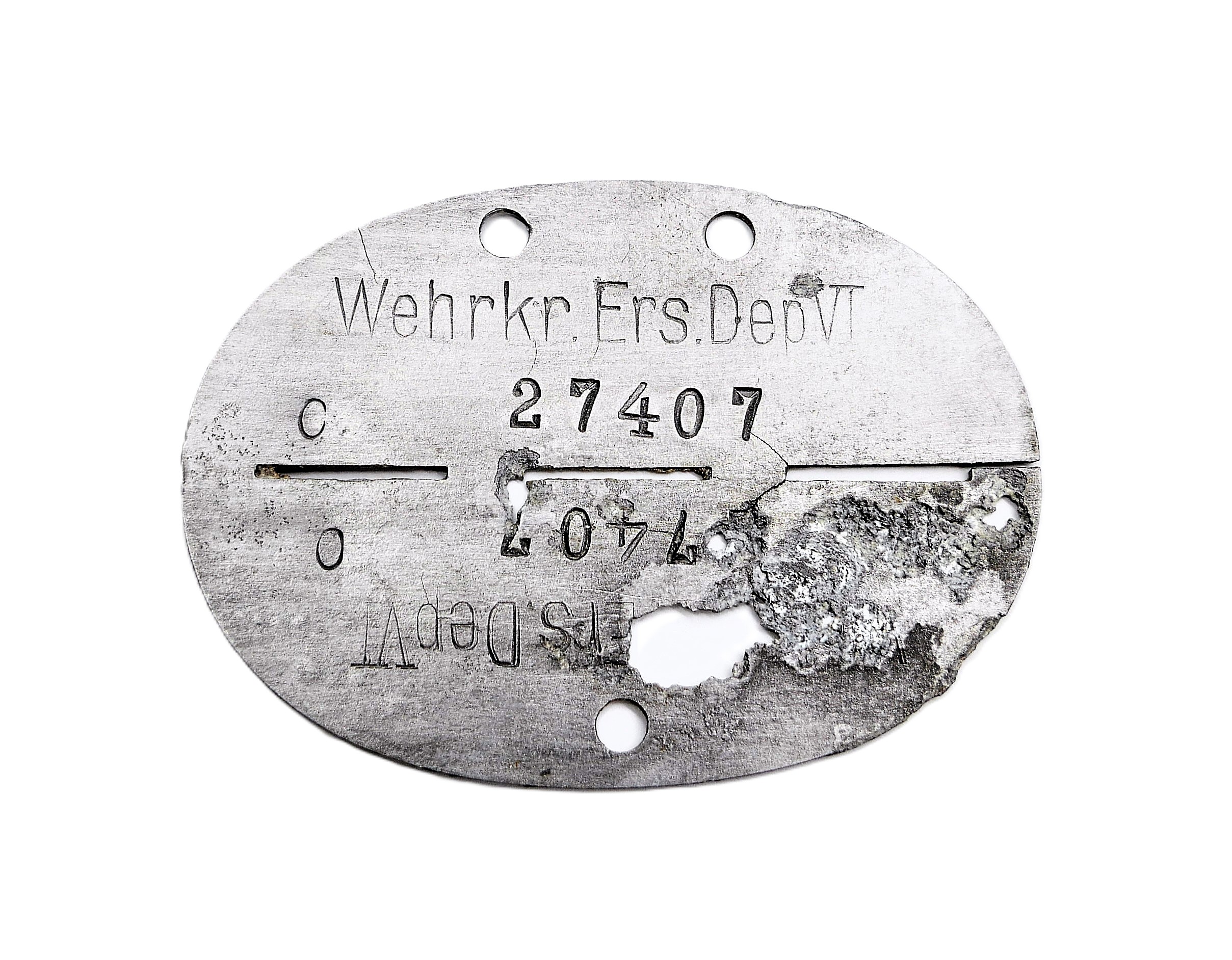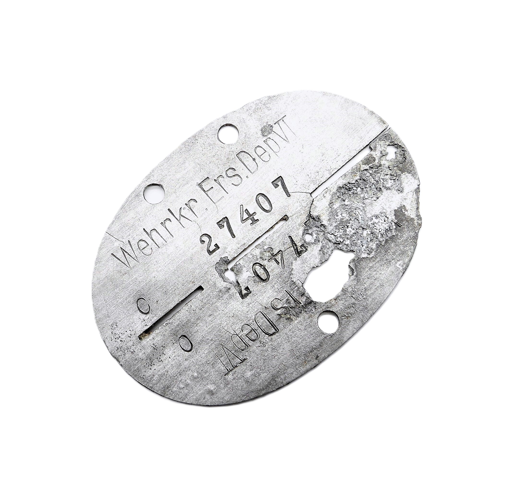 Erkennungsmarke – WEHRKREIS – ERS. DEP. VI, 27407, Blutgruppe 0. Bodenfund.