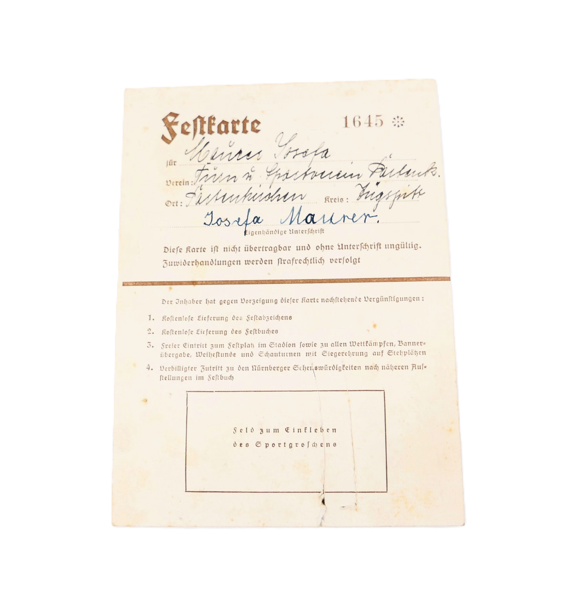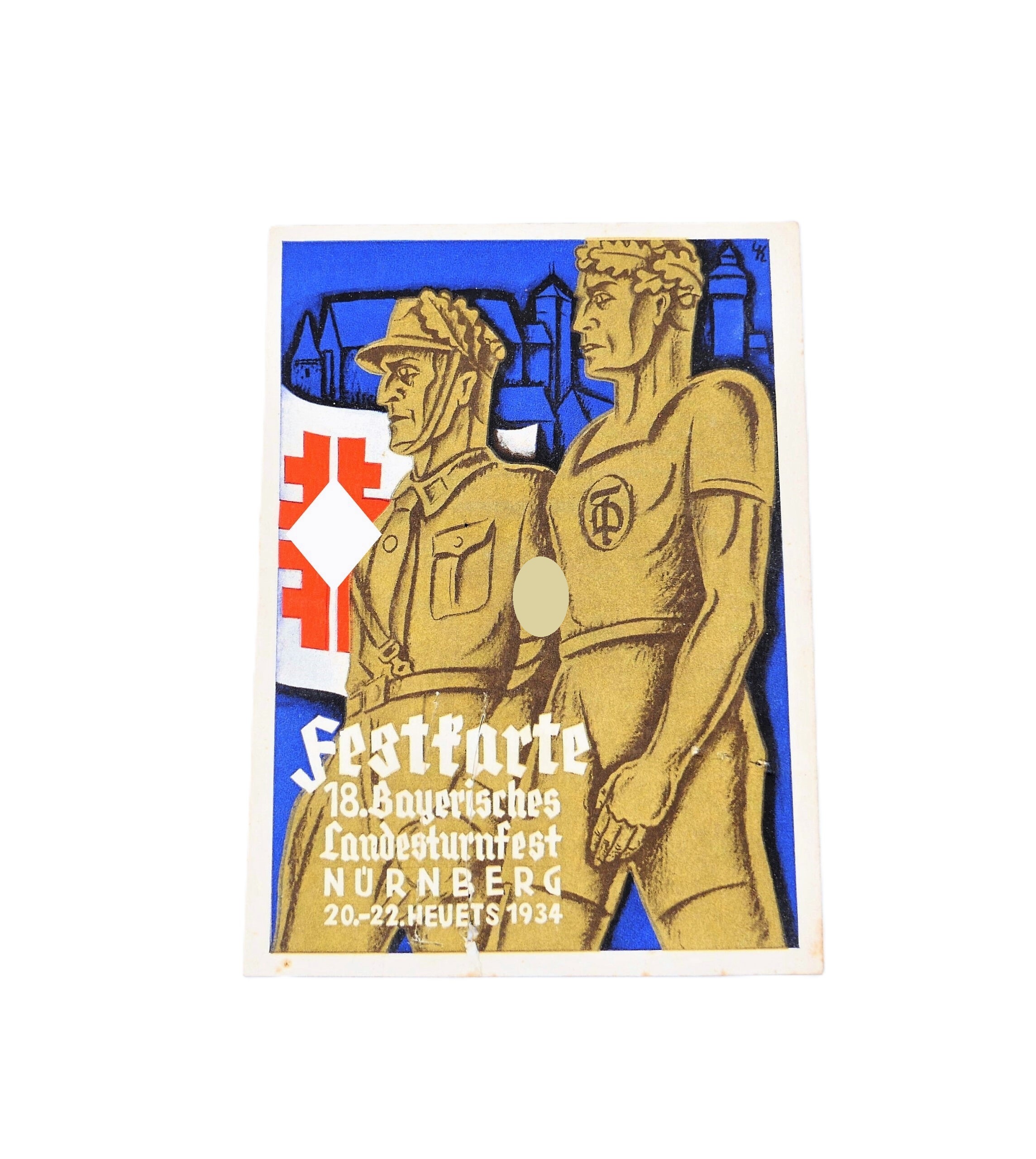 Festkarte – Nummer 1645 – 18. Bayrisches Landesturnfest – Nürnberg 20. – 22. Heuets 1934. Hat unten mittig zwei Einschnitte von etwa 5 cm Länge. Einer ist nicht durchgängig. Sehr seltene Festkarte.