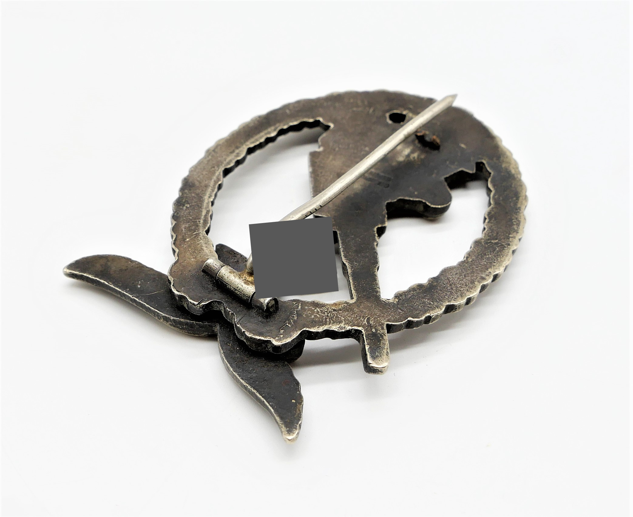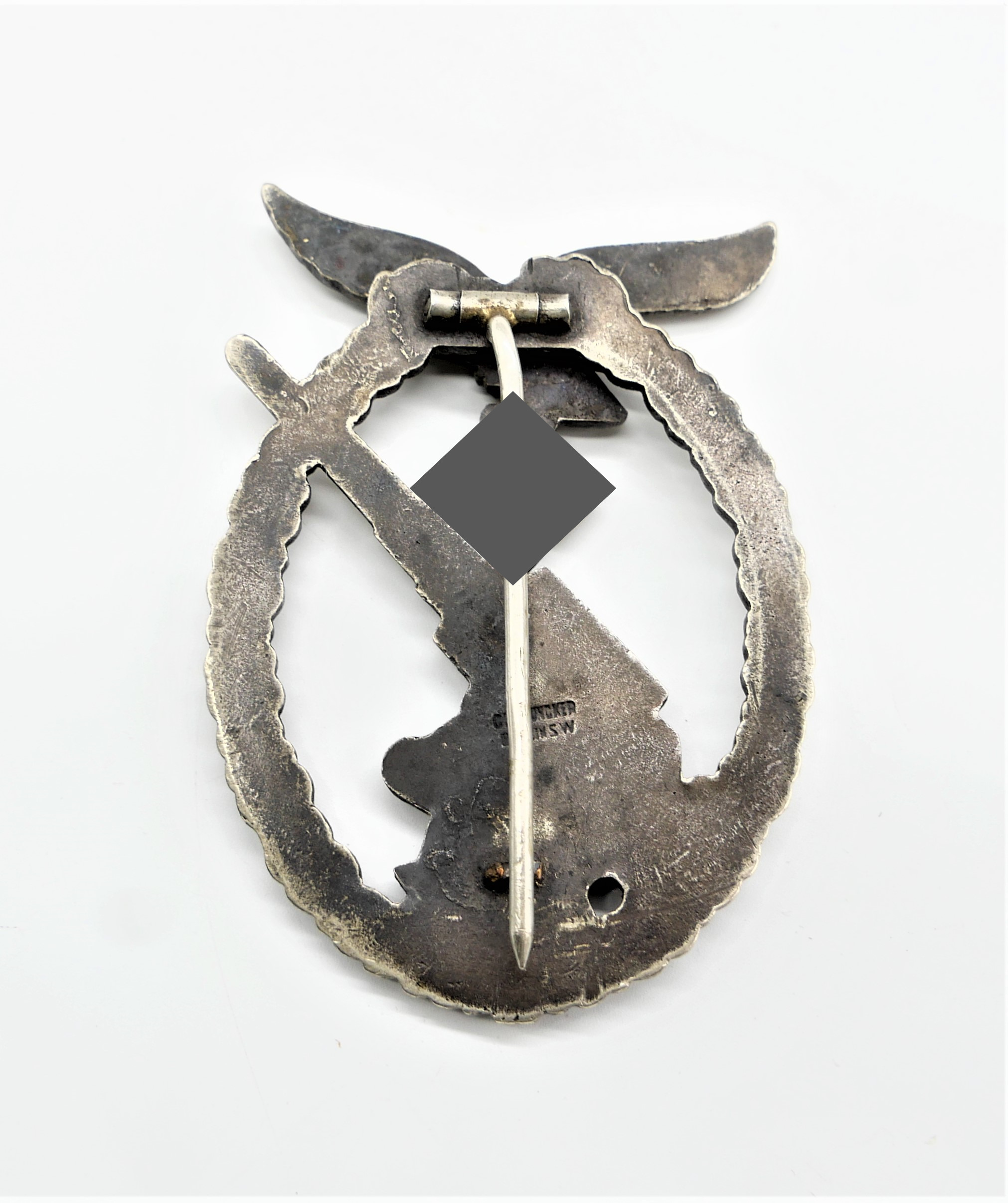Flakkampfabzeichen der Luftwaffe aus Buntmetall. Hersteller C.E. Juncker, Berlin SW. Nadelhaken fehlt. Schönes, getragenes Stück.