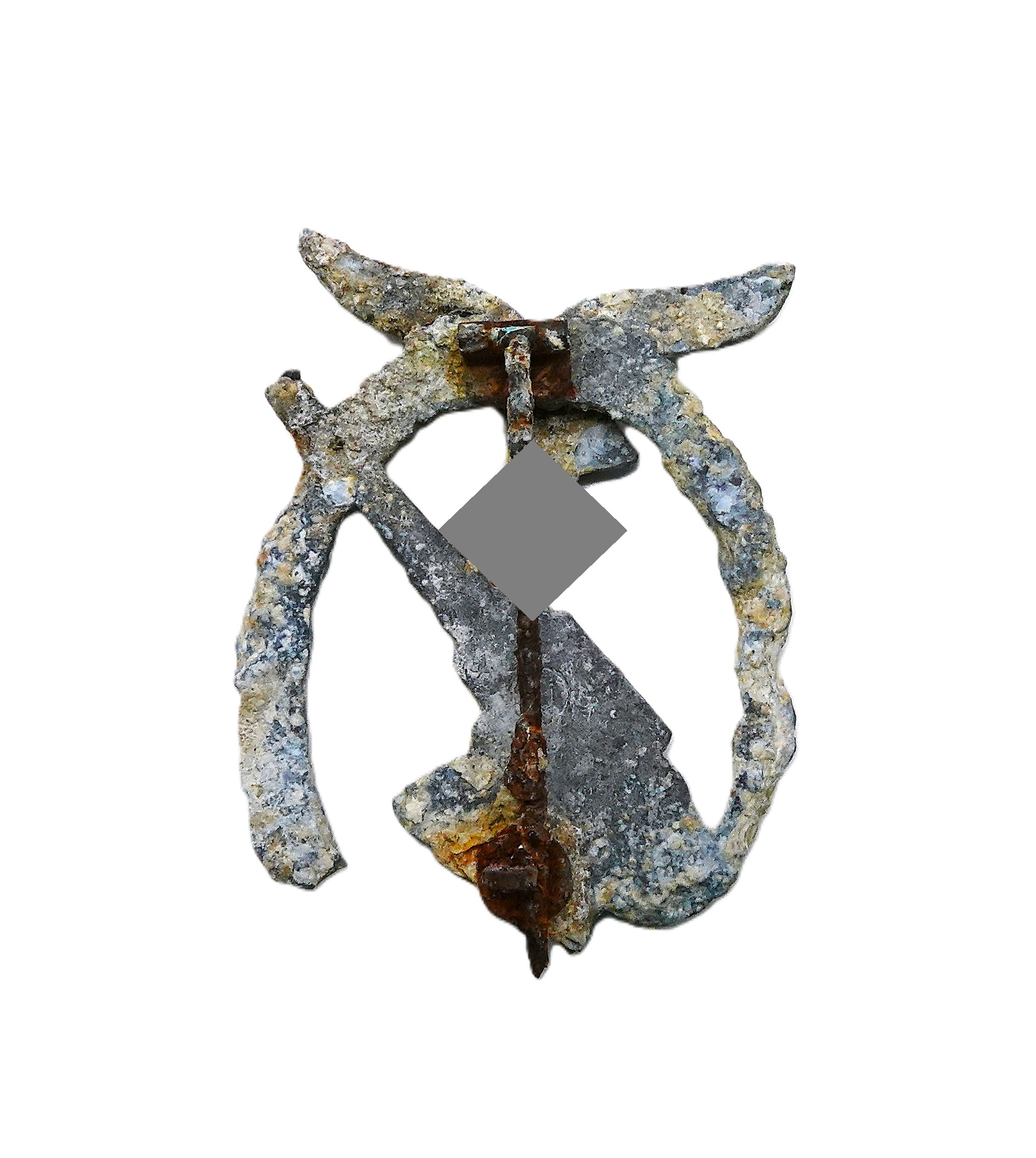 Flakkampfabzeichen der Luftwaffe. Zinkstück des Hersteller E. Ferdinand Wiedmann, Frankfurt/Am Main. Bodenfund mit kompletten Nadelsystem. Läßt sich nicht öffnen.