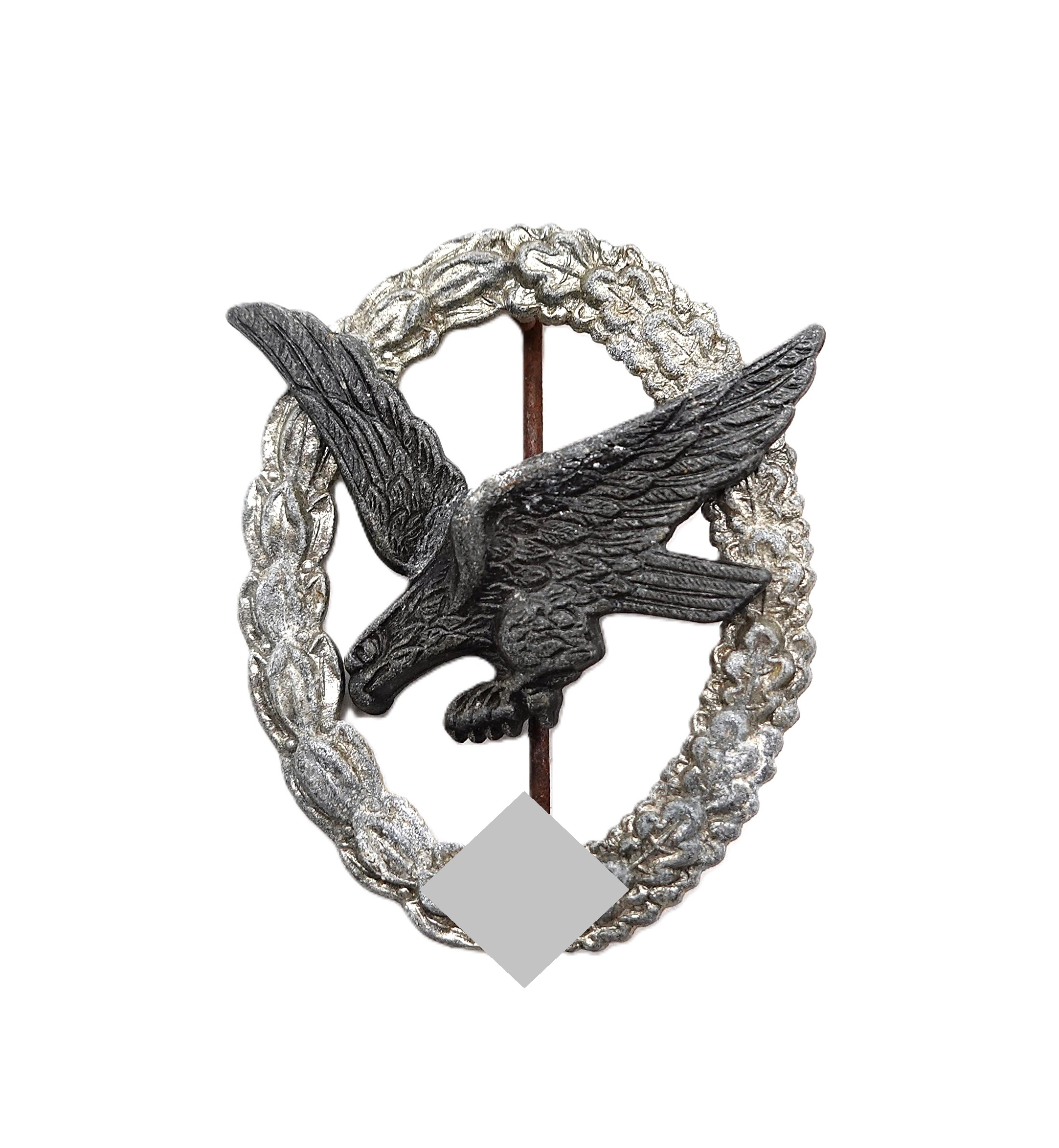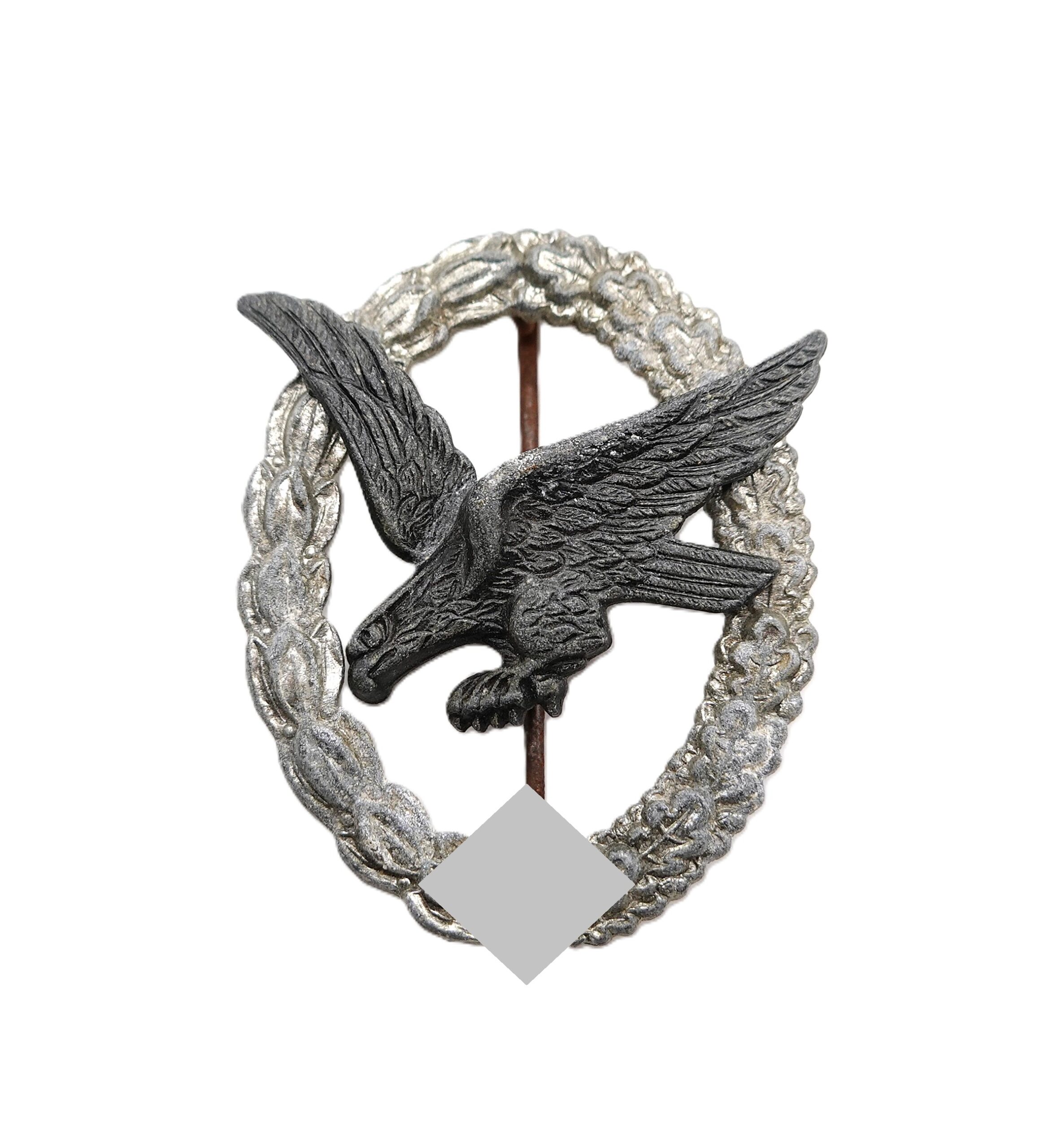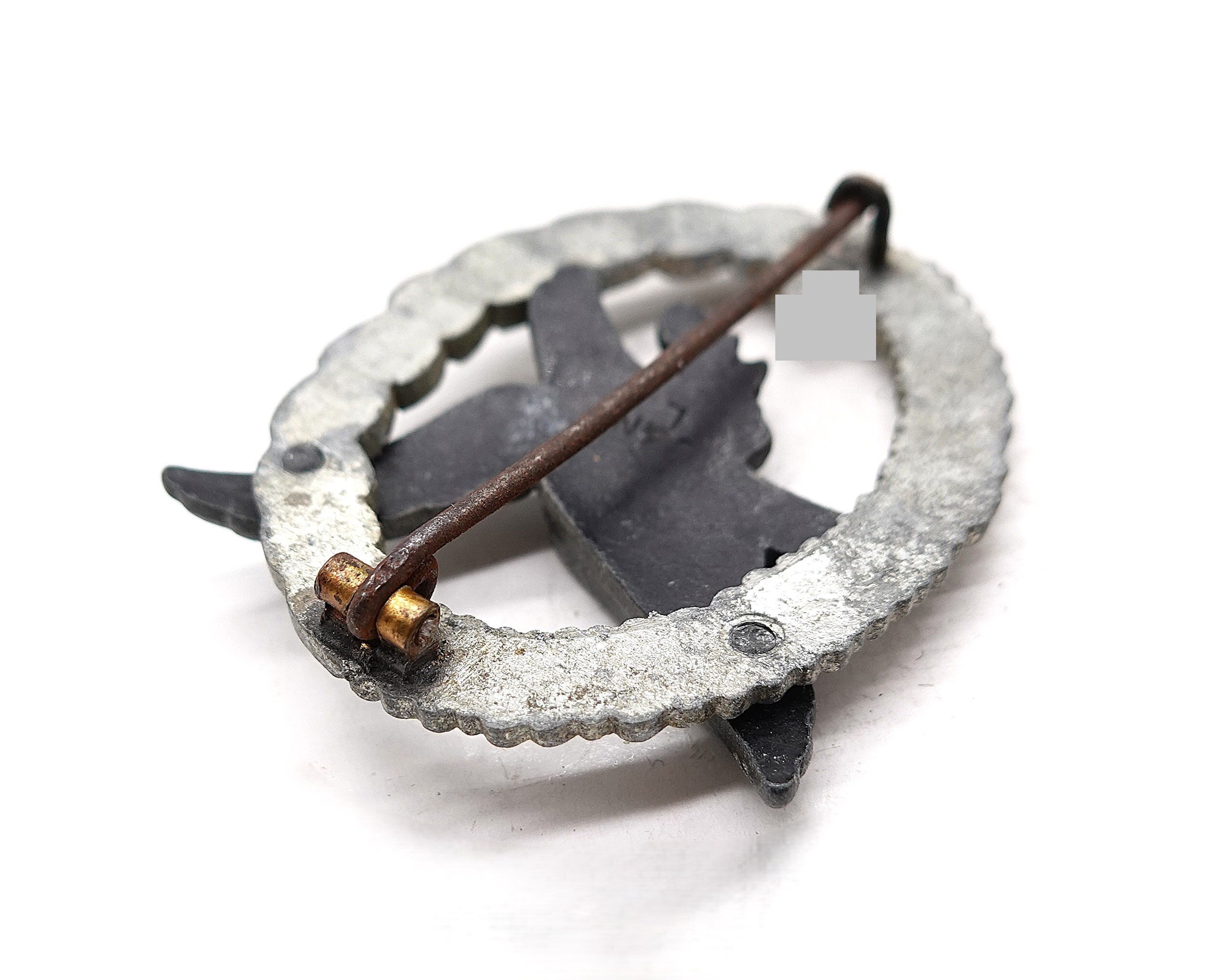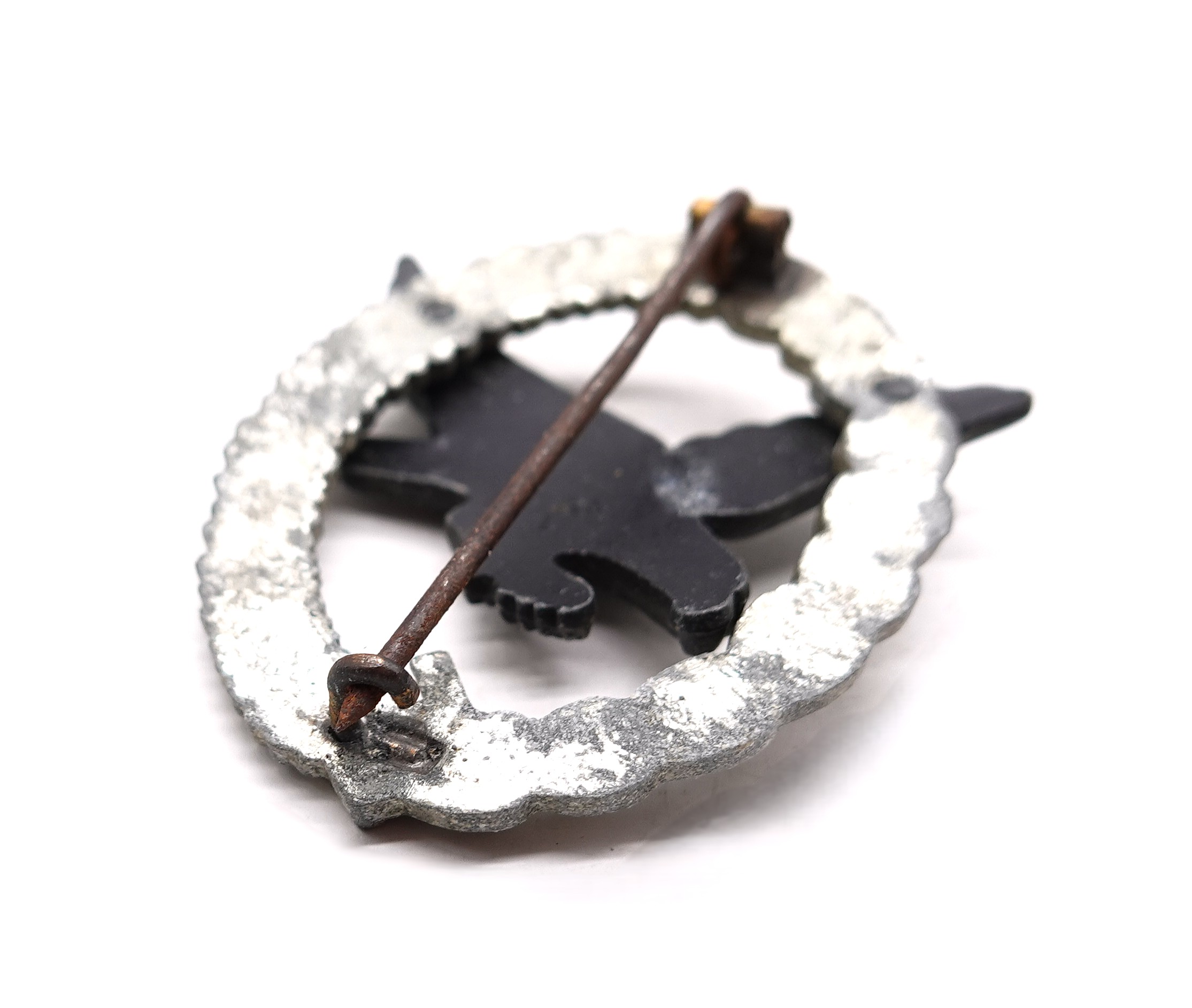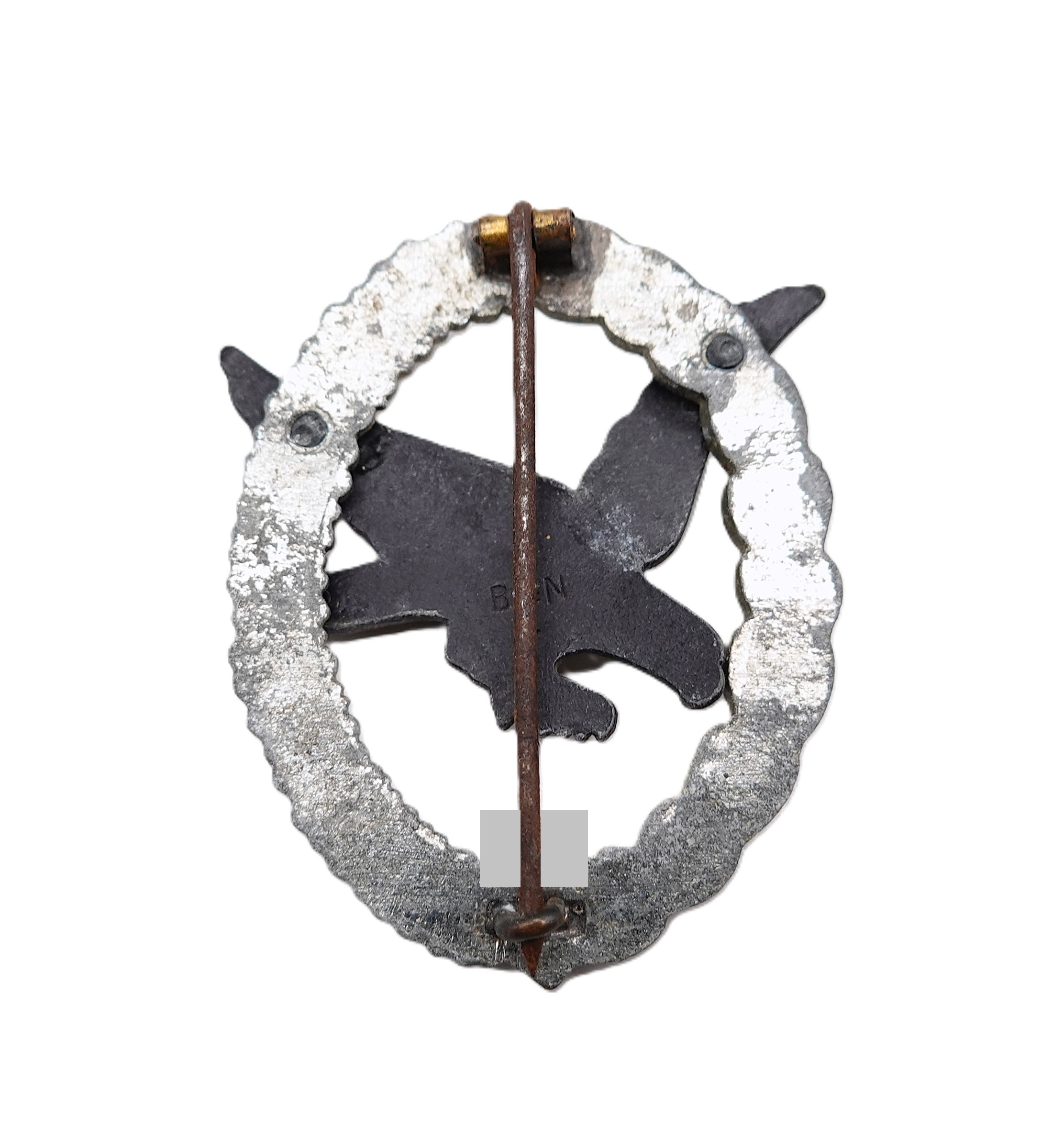 Fliegerschützenabzeichen ohne Blitzbündel. Hersteller B & N L (Berg & Nolte, Lüdenscheid). Getragenes Zinkstück mit noch schöner Restversilberung. Hat wohl mal von vorne einen Schlag abbekommen. Dadurch ist der linke Flügel angebrochen und der Adler ist etwas nach hinten gedrückt. Ist aber alles fest.