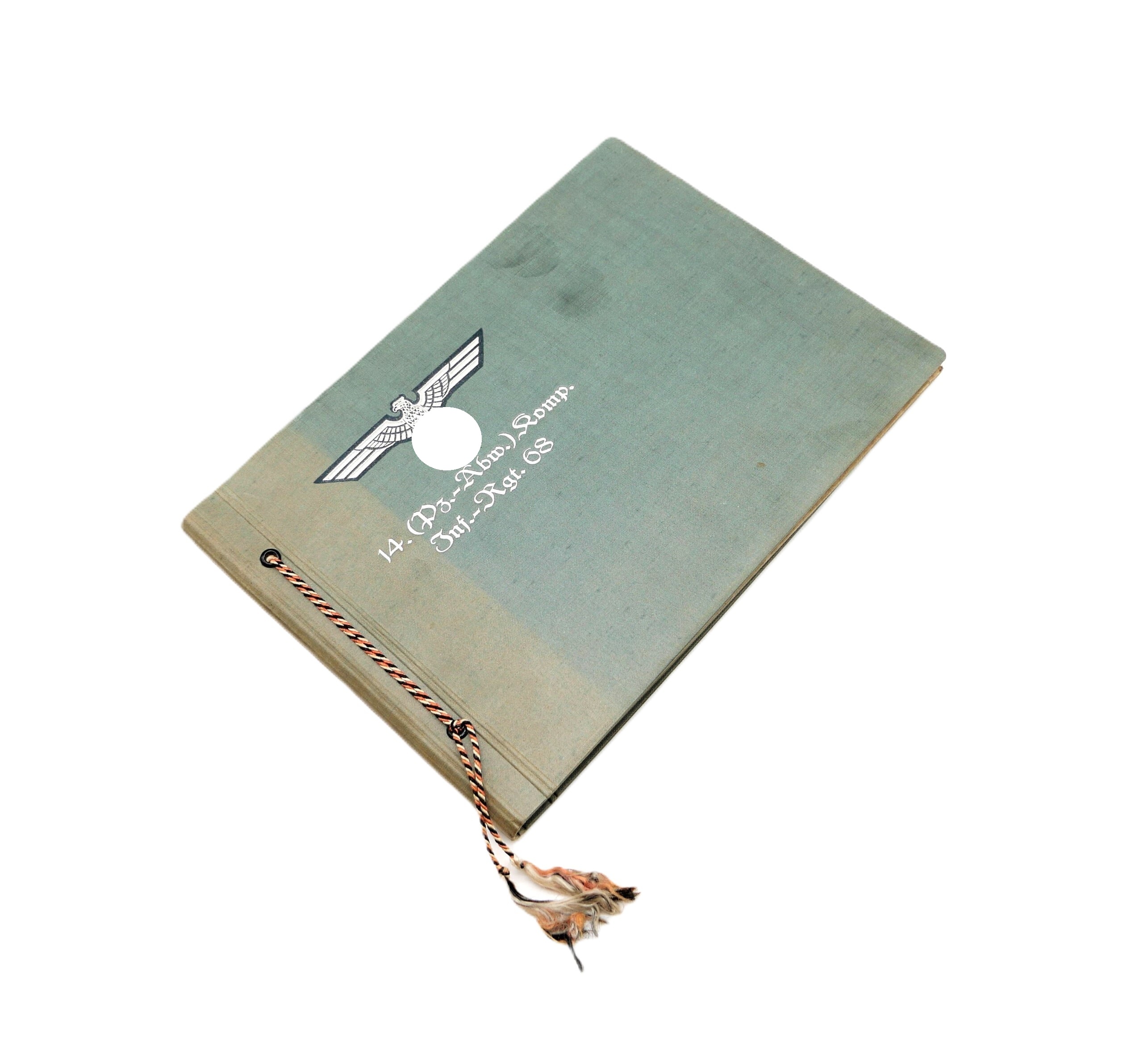 Fotoalbum – (14. Pz. – Abw.) Komp. Inf.- Rgt. 68 – Blanco. Auf der Vorderseite hat sich durch falsche Lagerung ein dunkler Streifen gebildet. Ansonsten ist der Umschlag auf der Vorder- und Rückseite etwas fleckig.