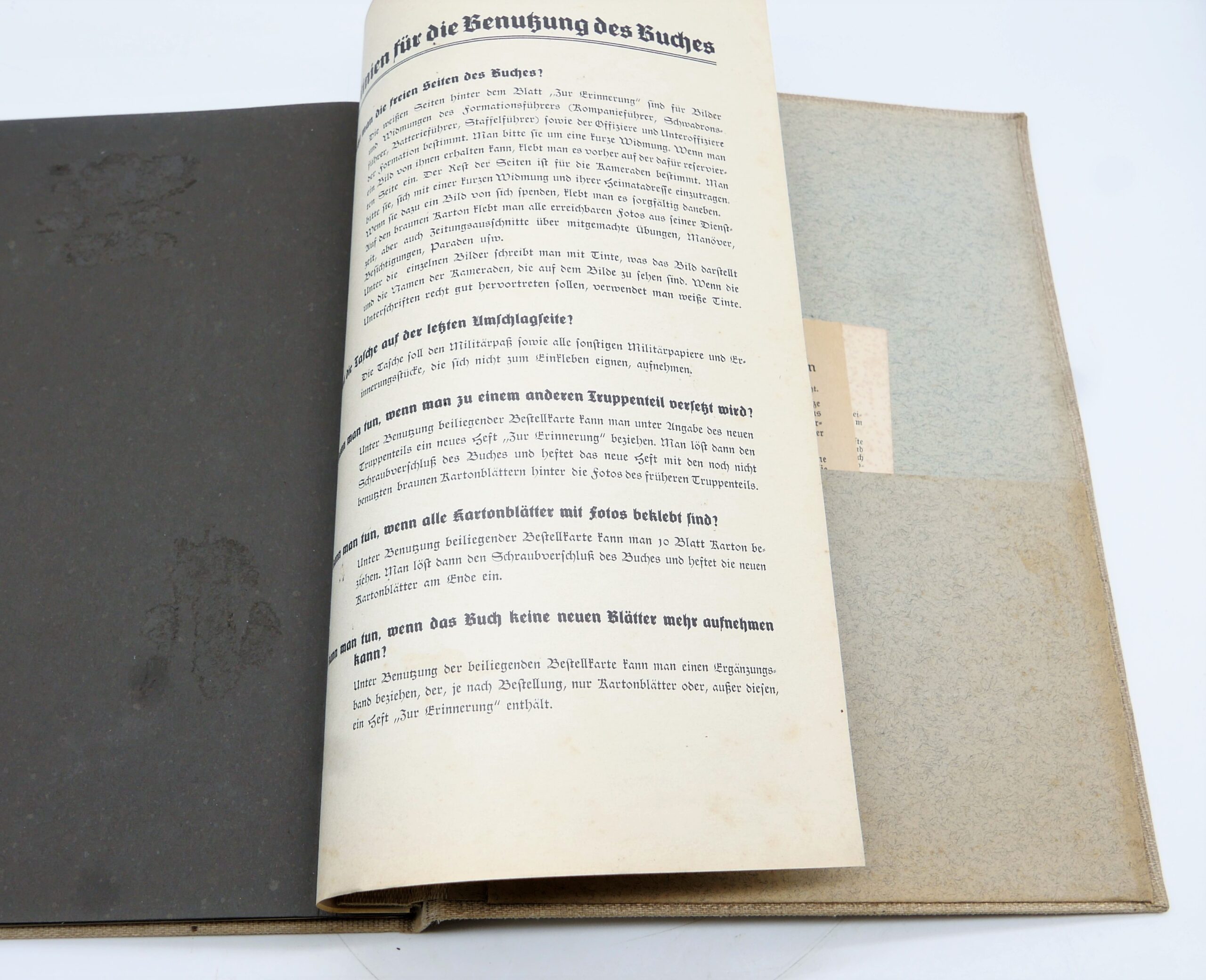 Fotoalbum Wehrdienst-Ehrendienst. Umschlag etwas abgeschmutzt. Seiten teilweise beschriftet. Bilder wurden entfernt.