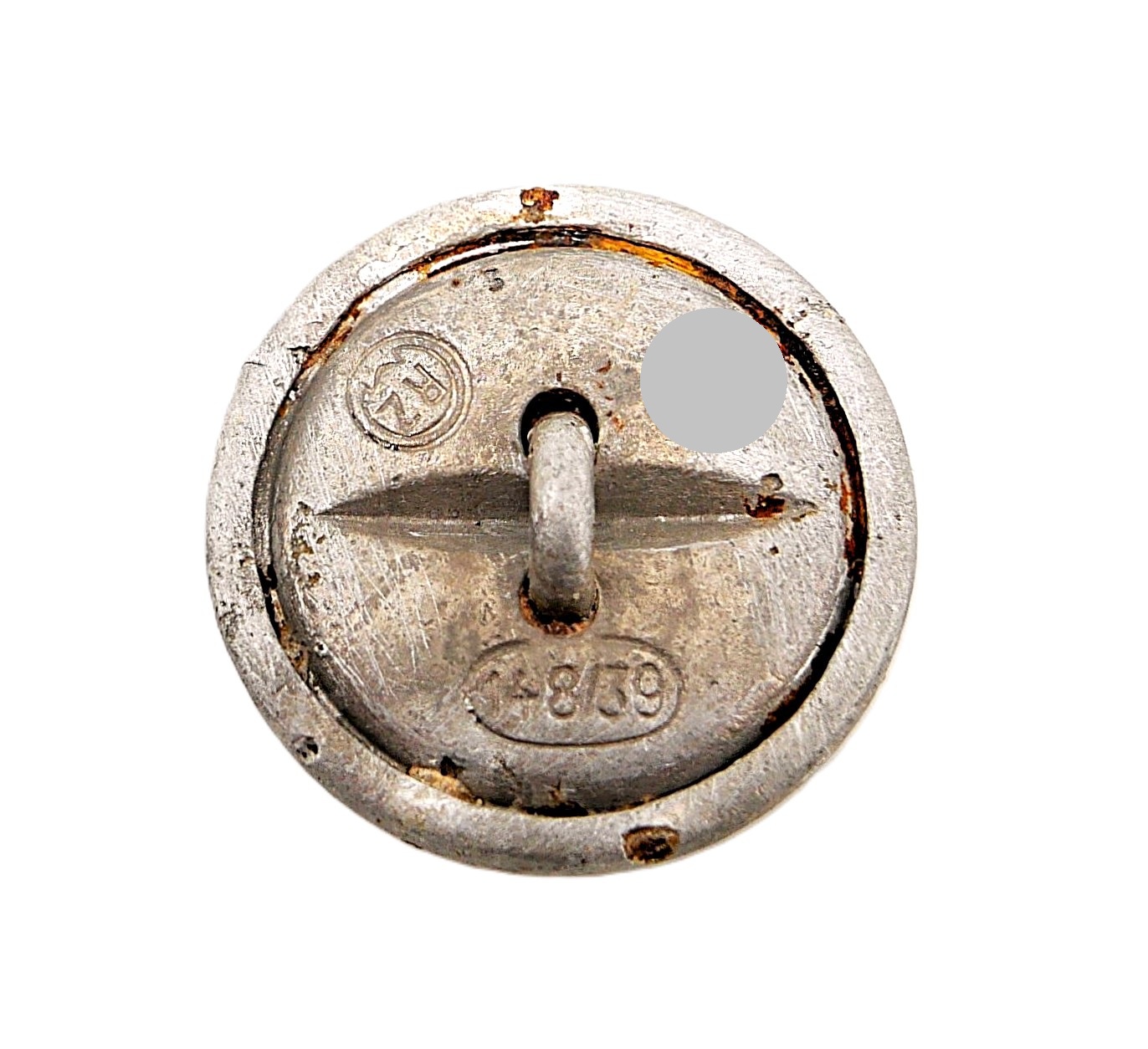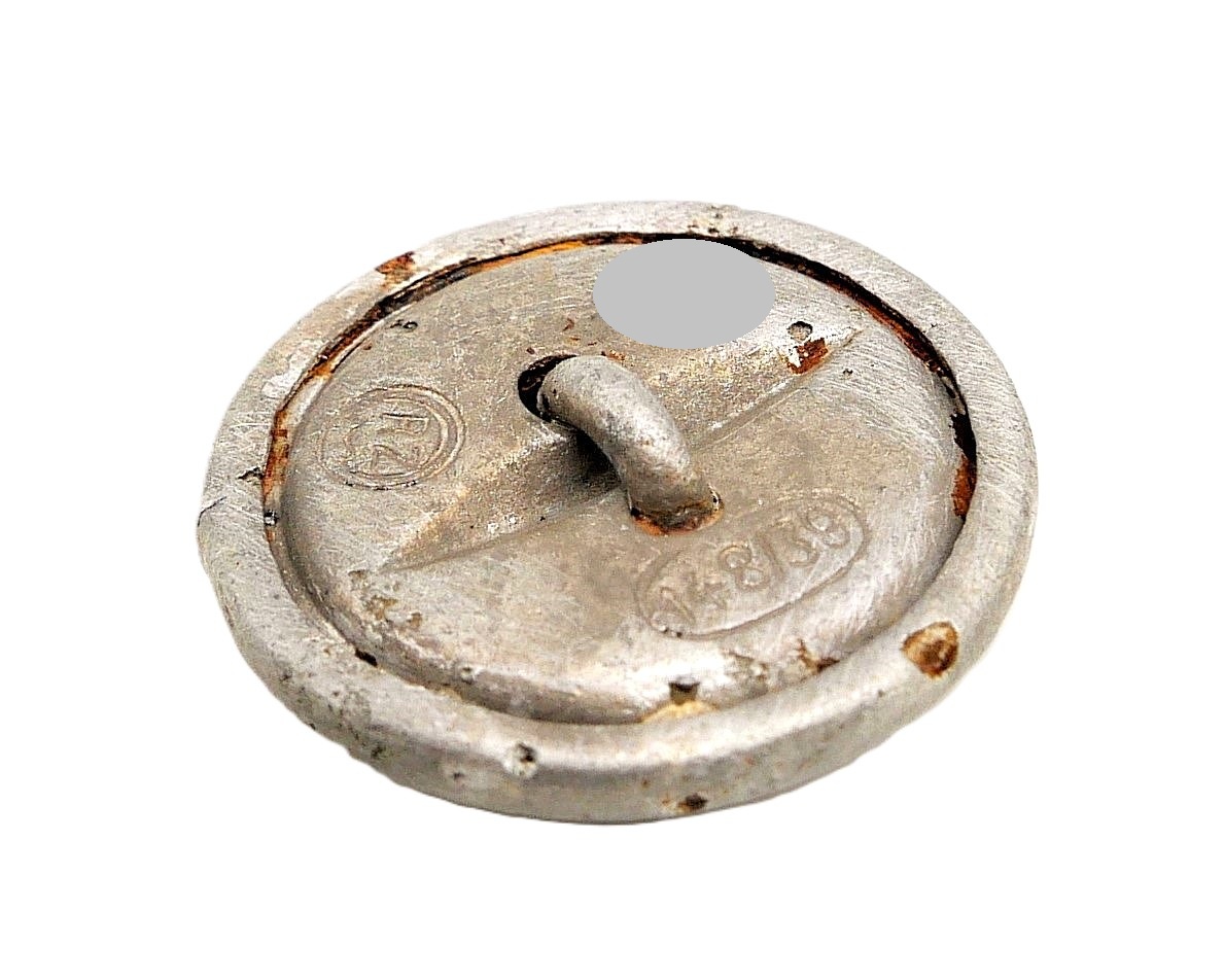 Frackknopf der SS. Aus Aluminim. Rückseitig steht 148/39, RZM und SS im Kreis. Durchmesser 2 cm. Sehr seltener, gut erhaltener Bodenfund. Mittig etwas eingedrückt.