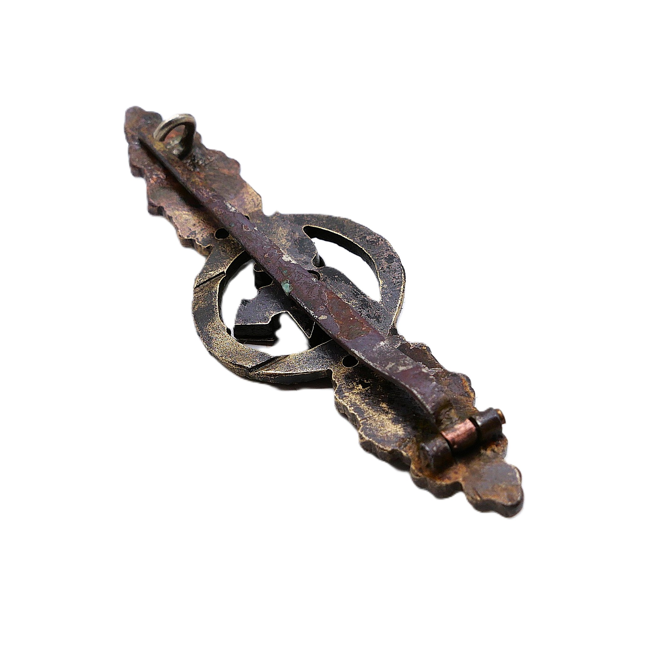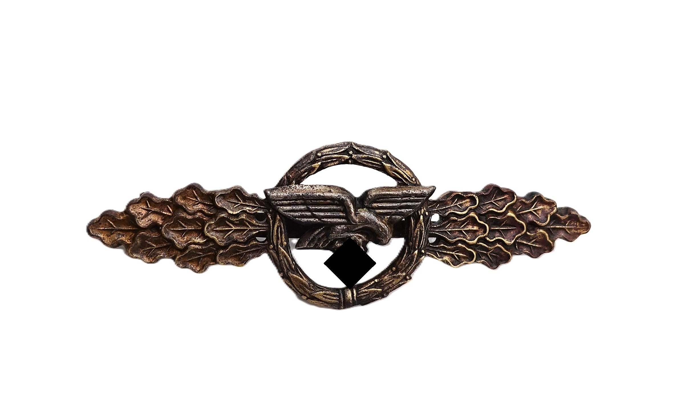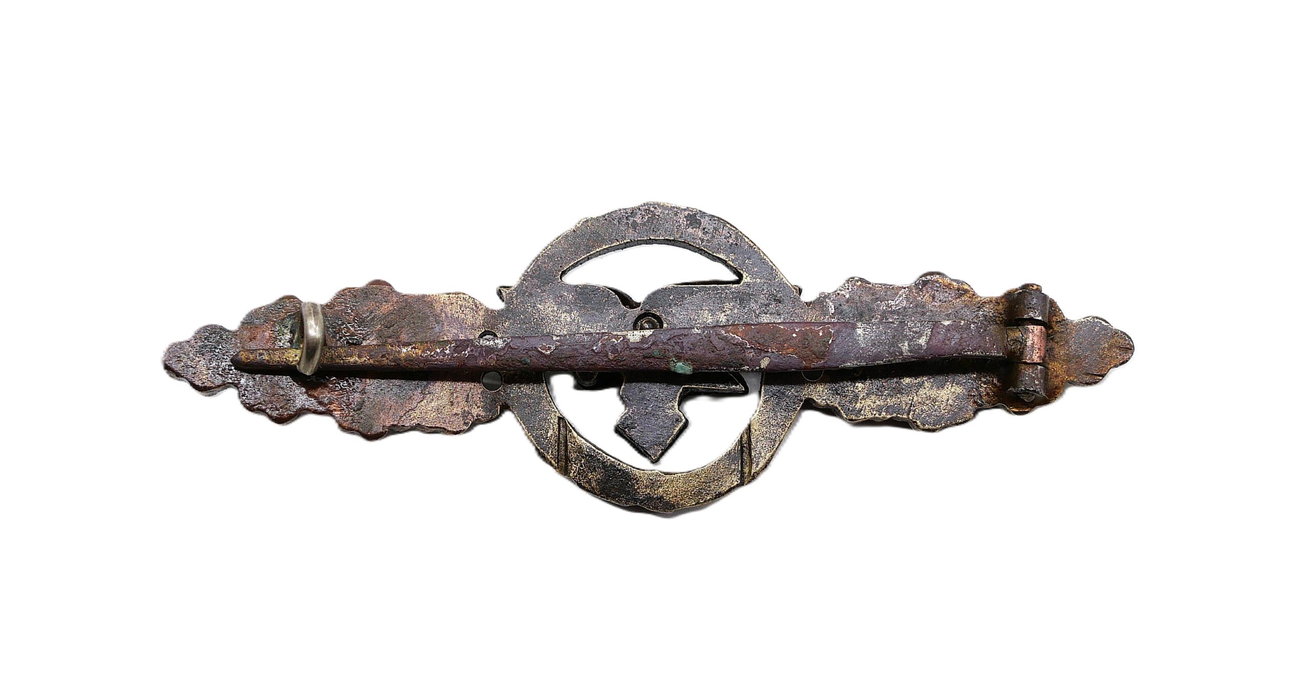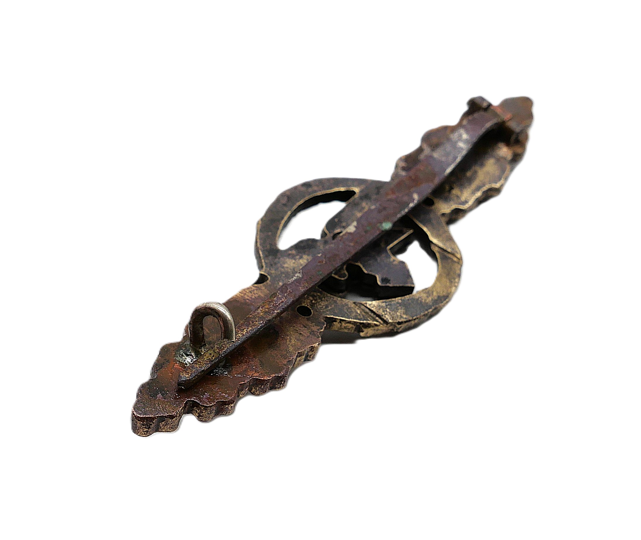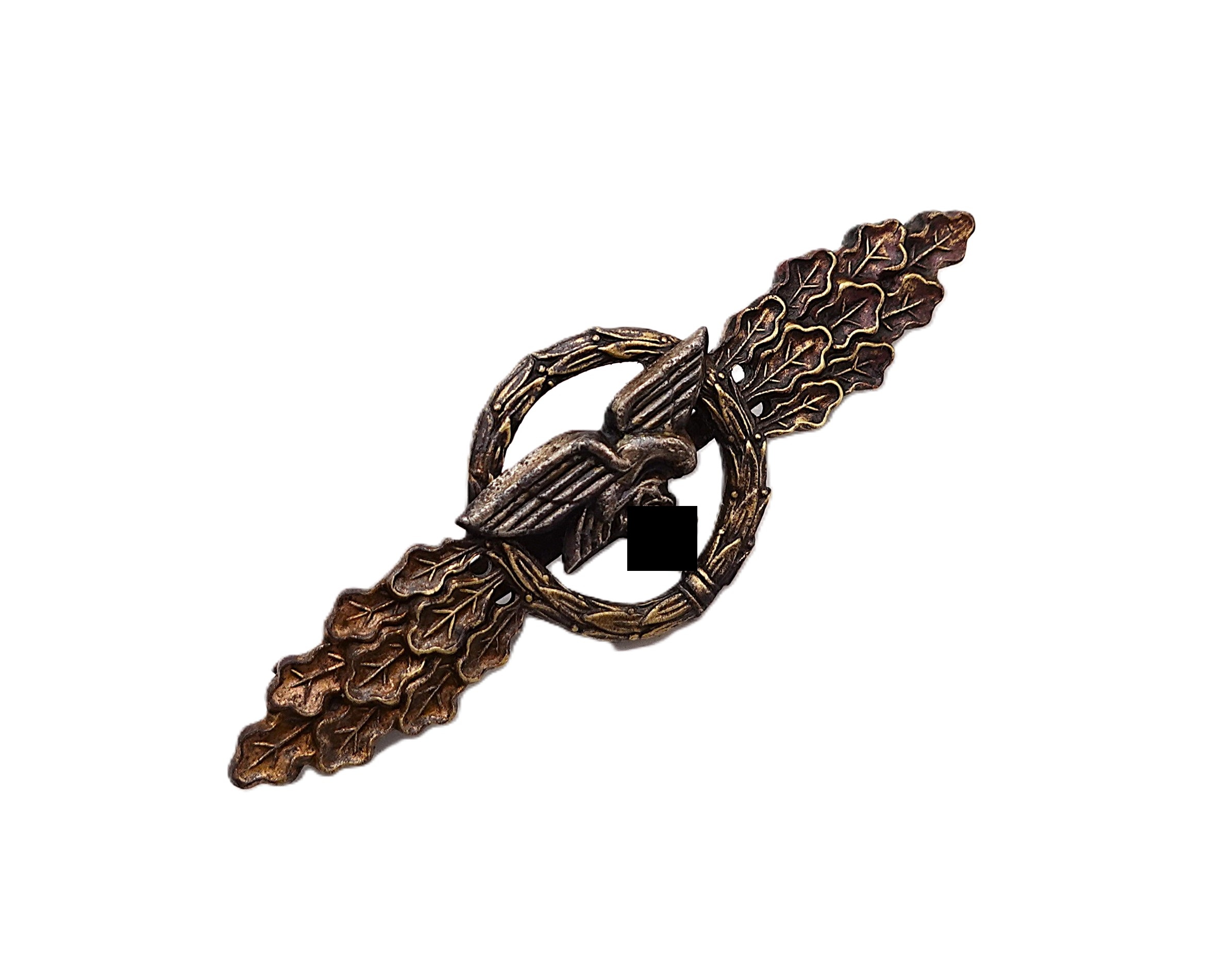 Frontflugspange für Transportflieger. Durch die schlechte Lagerung kann man nicht mehr eindeutig erkennen ob es sich um die Bronze oder um die Goldstufe handelt. Ohne Hersteller. Aus Buntmetall. Gelebtes, getragenes Exemplar.