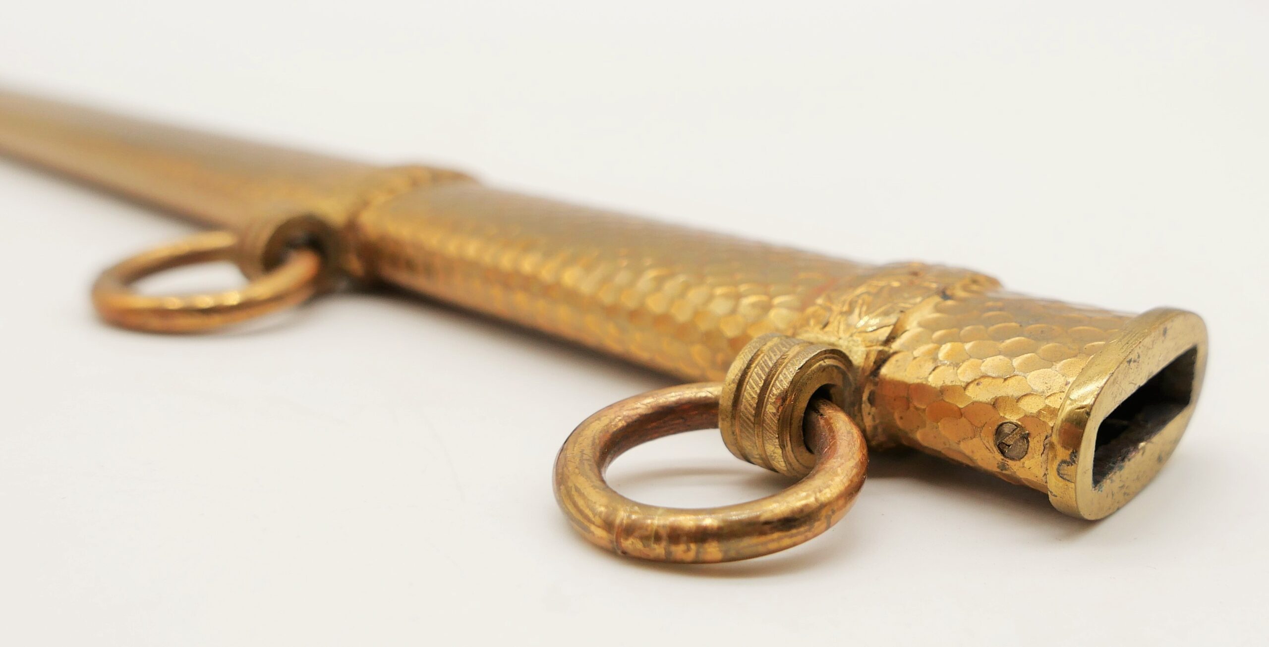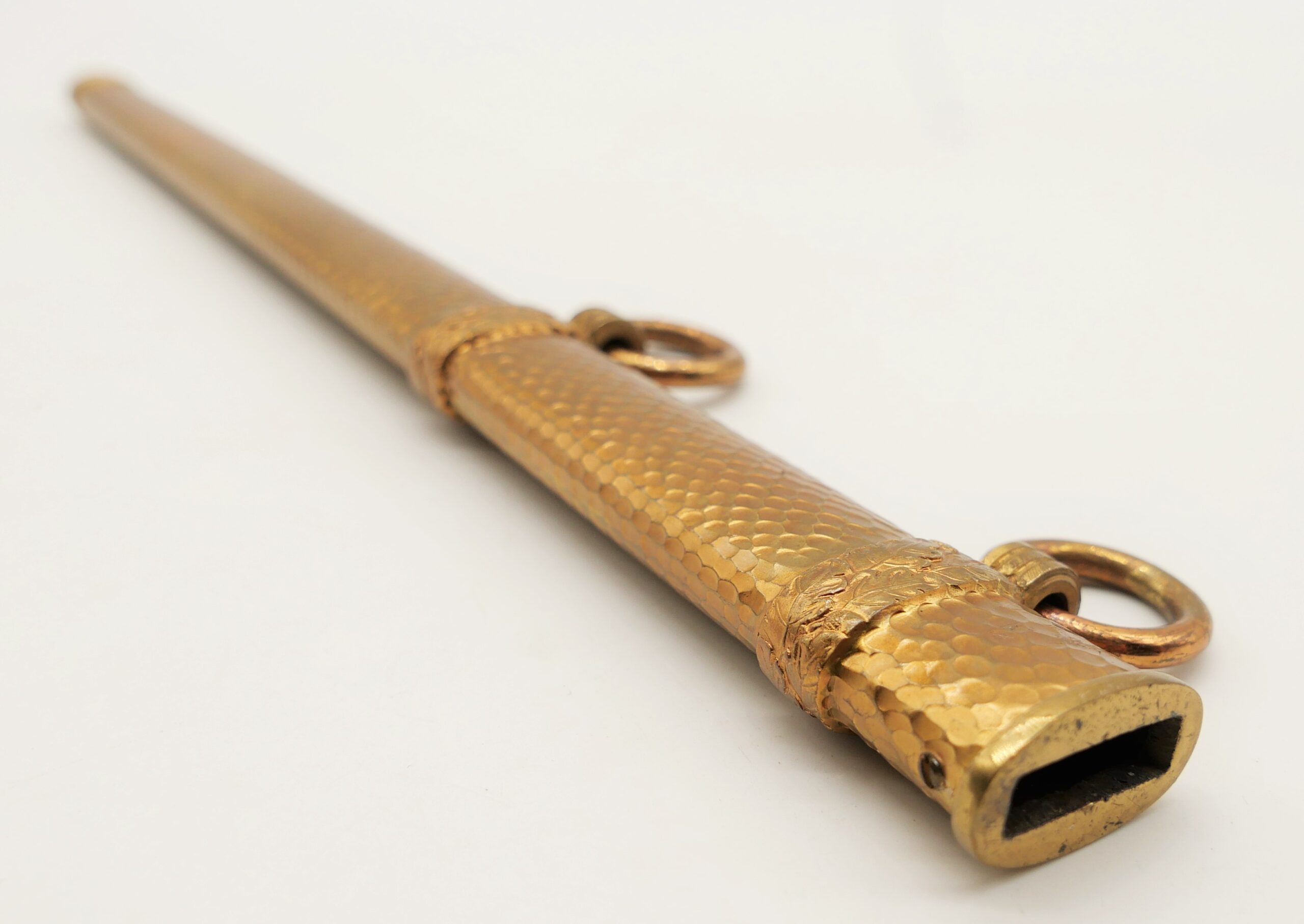 Gehämmerte Scheide eines Kriegsmarinedolch des Herstellers F.W. Höller, Solingen. Sehr schön erhaltener, getragener Zustand. Verkauf an Personen ab 18 Jahre mit Altersnachweis.