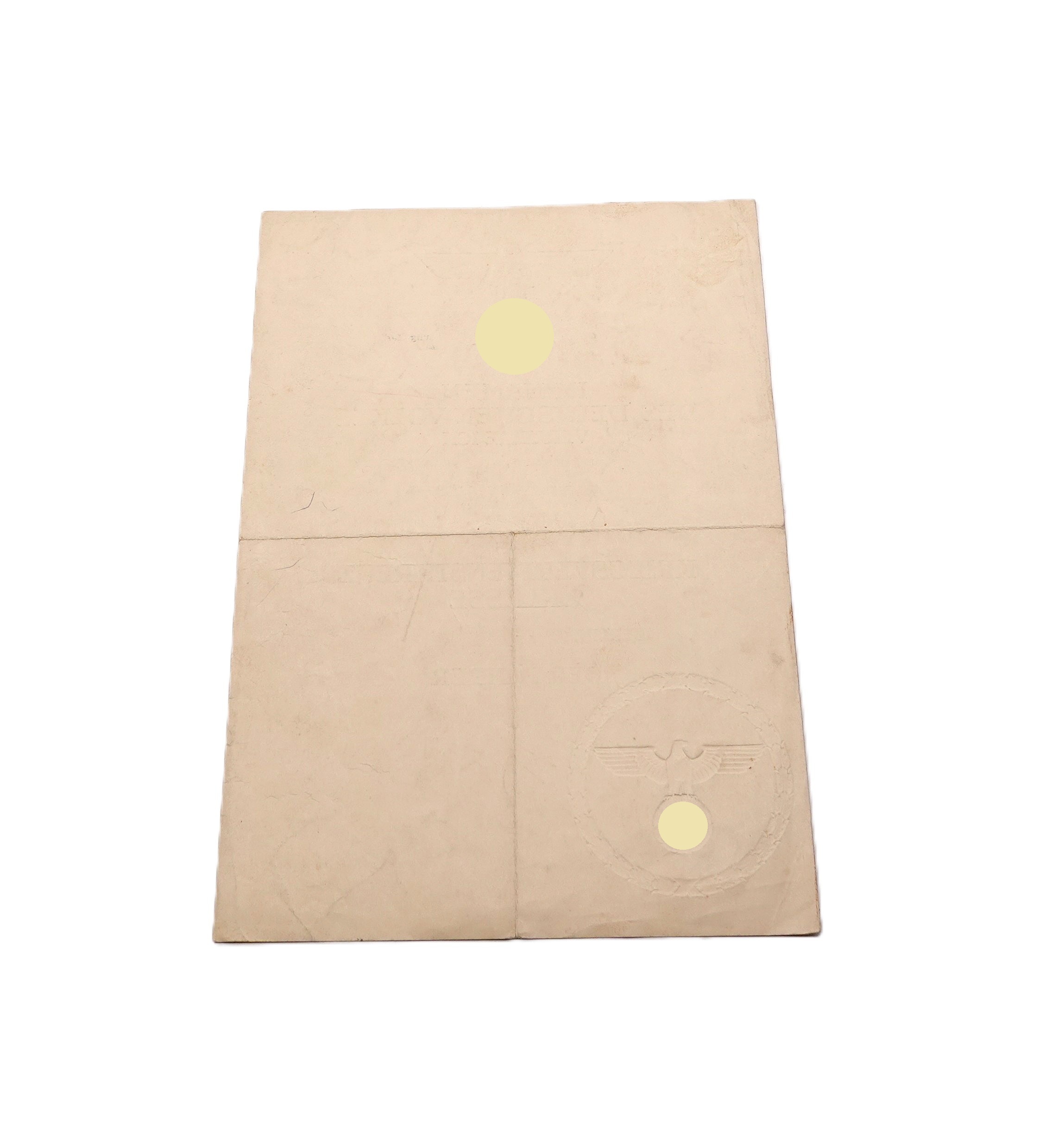 Große Verleihungsurkunde zum Kriegsverdienstkreuz 2. Klasse. Für den Reichsbahnassistenten Heinz Kaufmann in Dnjepropetrowsk. Ausgestellt in Berlin den 30. Januar 1944. Masse 29,6 cm x 21 cm. Alterstypische Gebrauchsspuren.