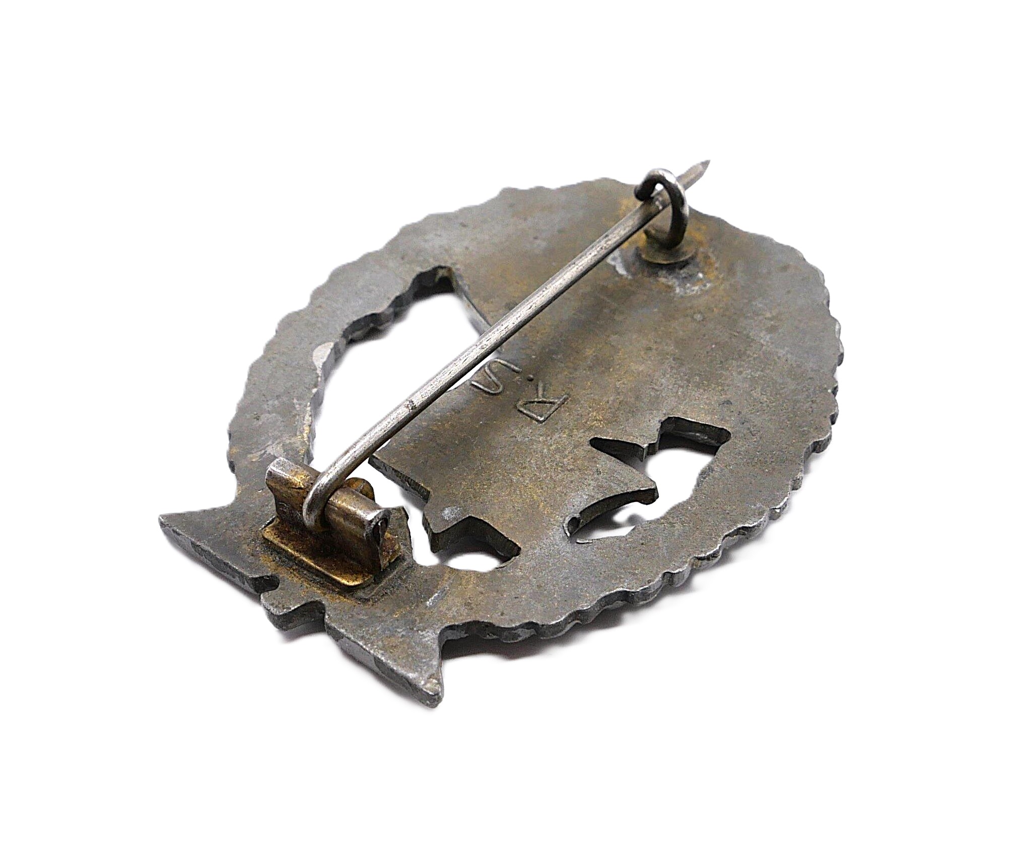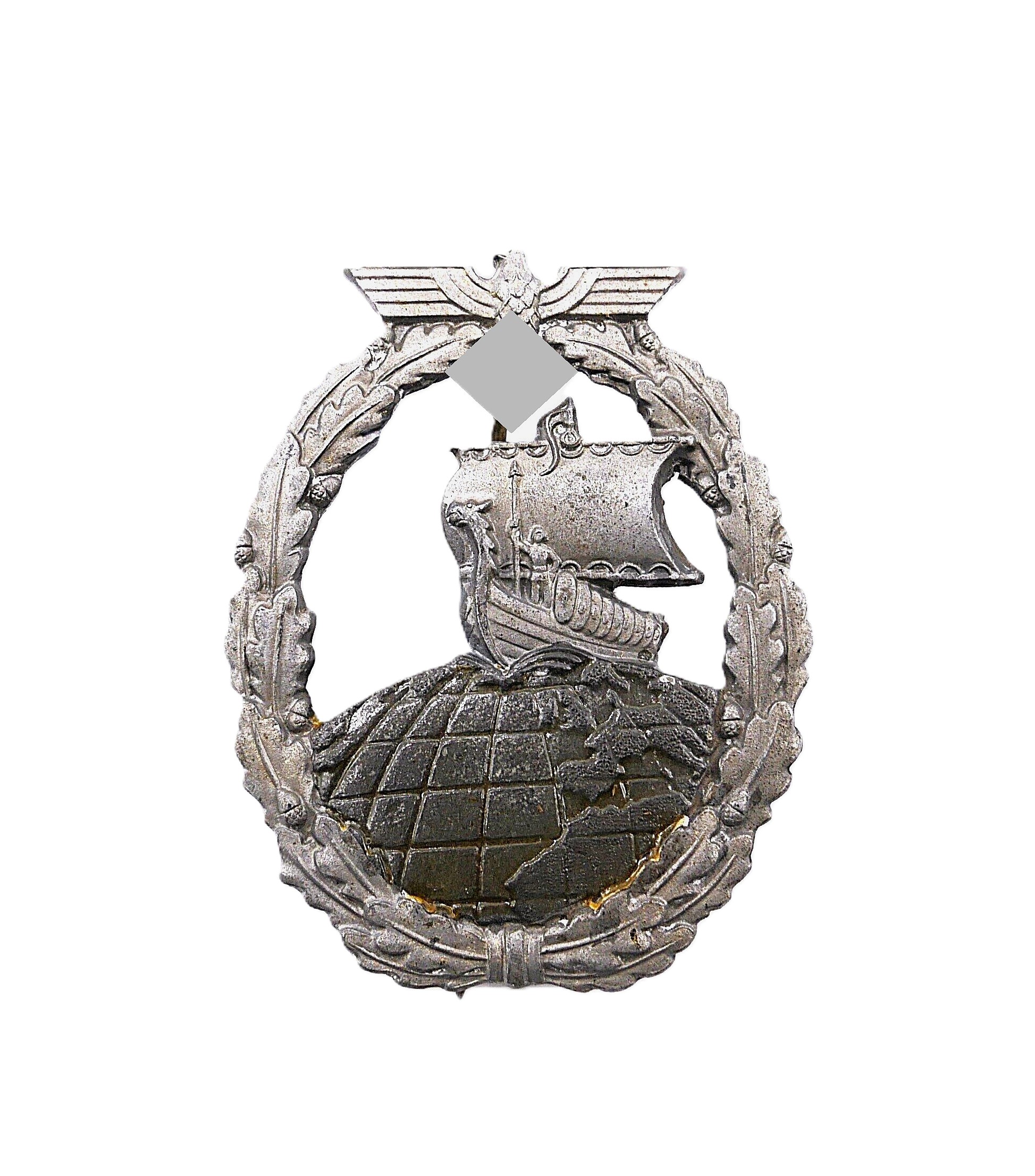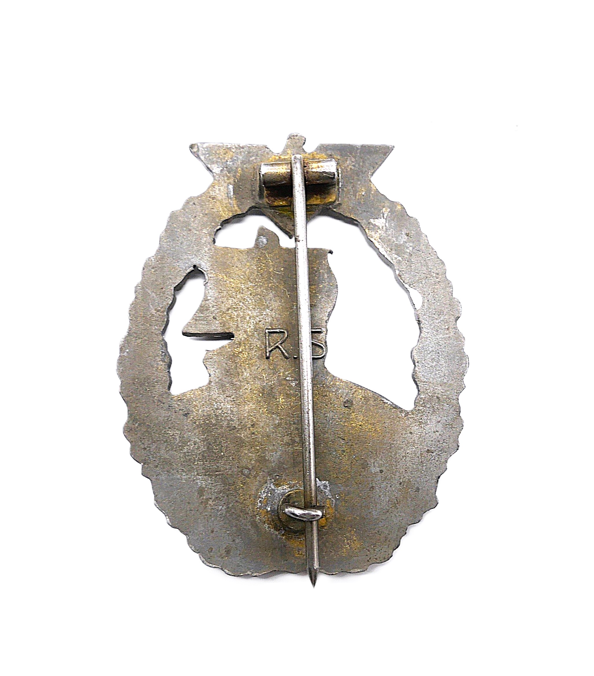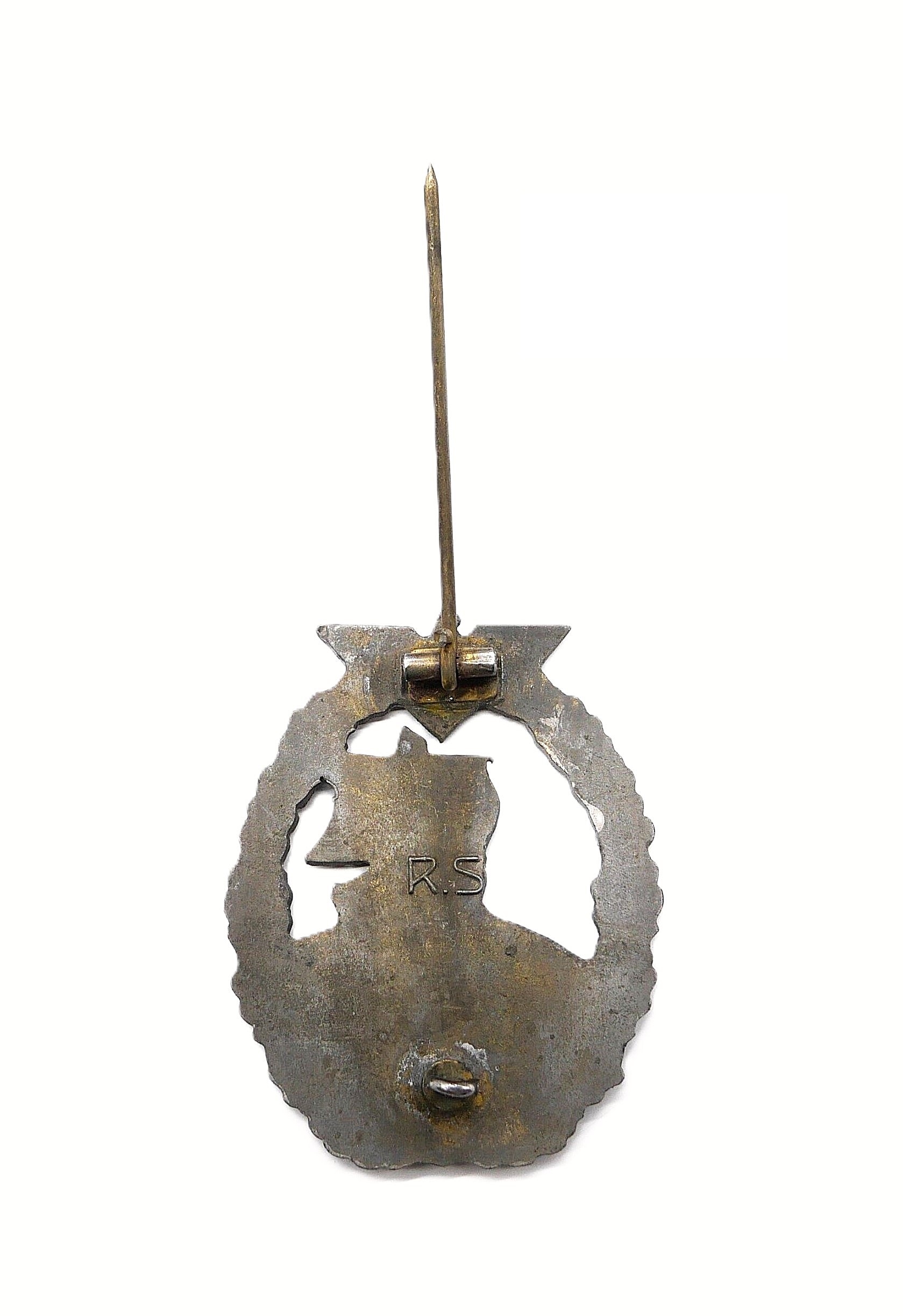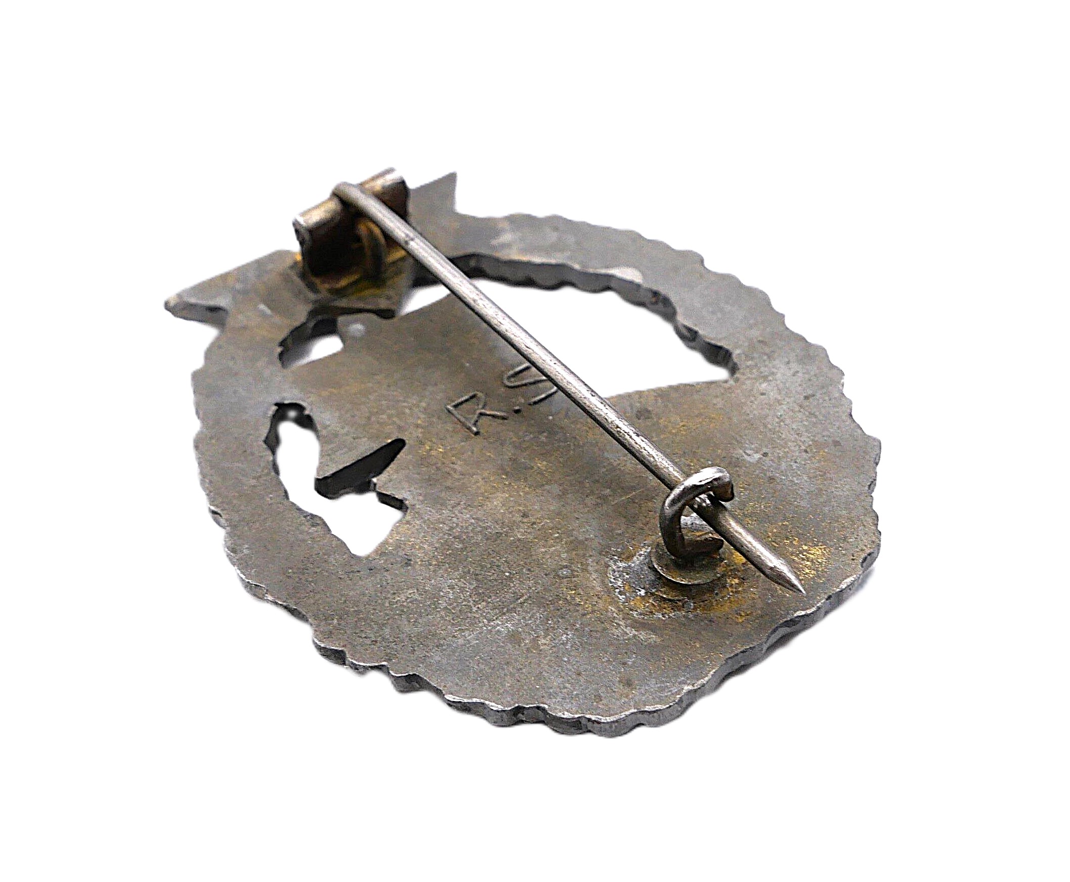 Hilfskreuzer Kriegsabzeichen – Hersteller R. S. (Rudolf Souval, Wien). Siehe dazu Sascha Weber & Gerhard R. Skora, die Kriegsabzeichen der Kriegsmarine, Seite 458 – 459. Getragener Zustand mit vergangener Vergoldung.
